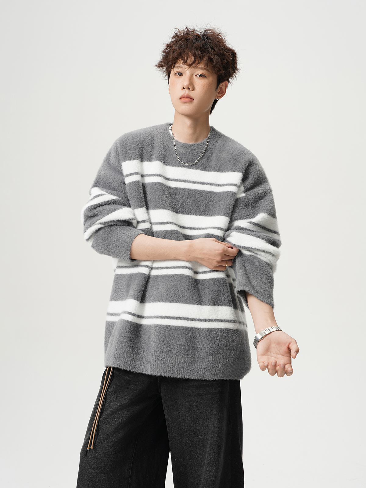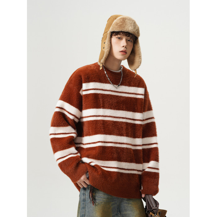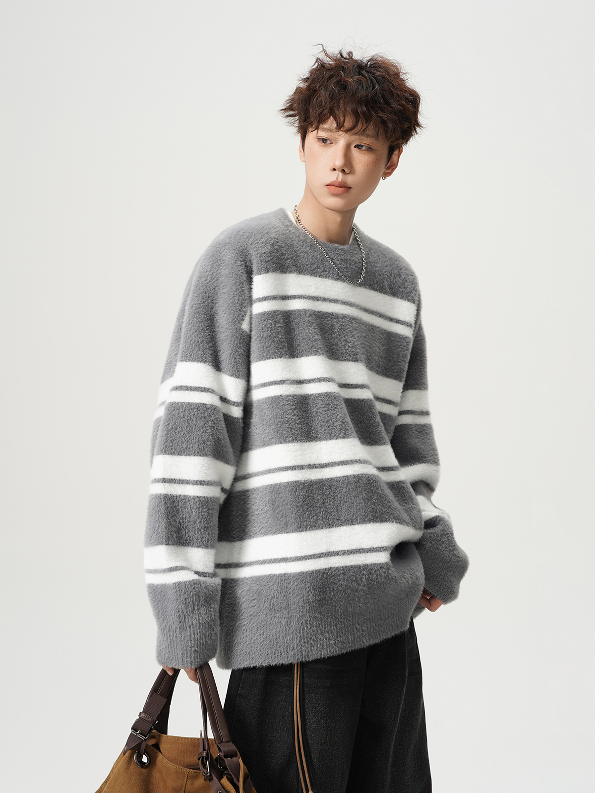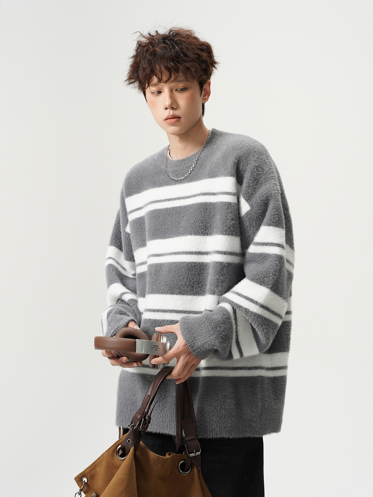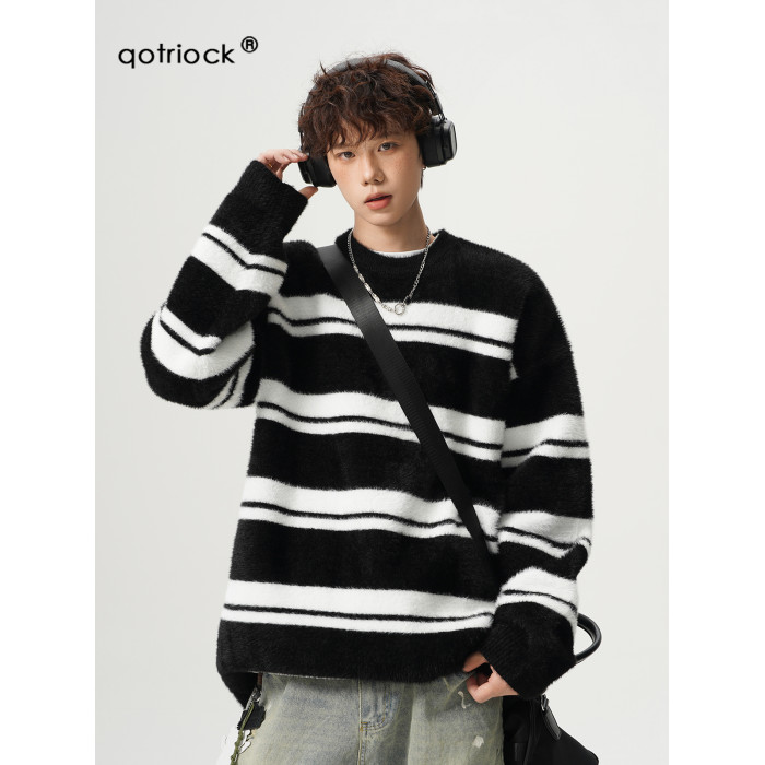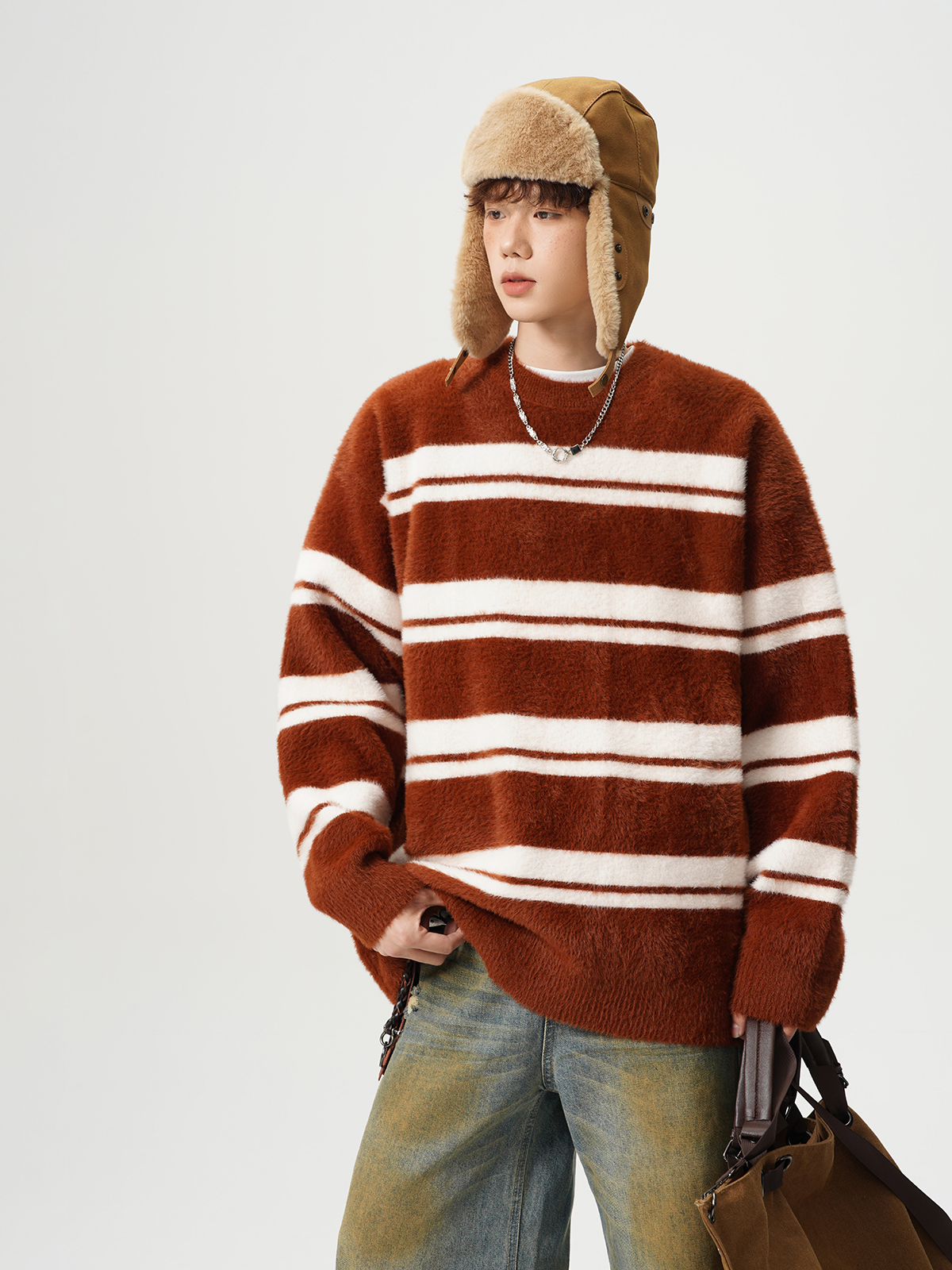日系慵懶風條紋毛衣男女冬季2024新款加厚圓領針織衫百搭內搭外套