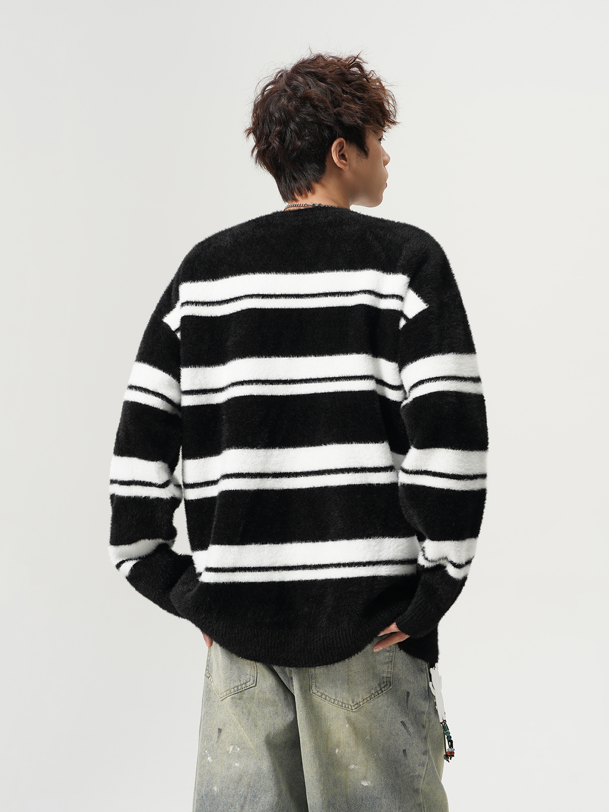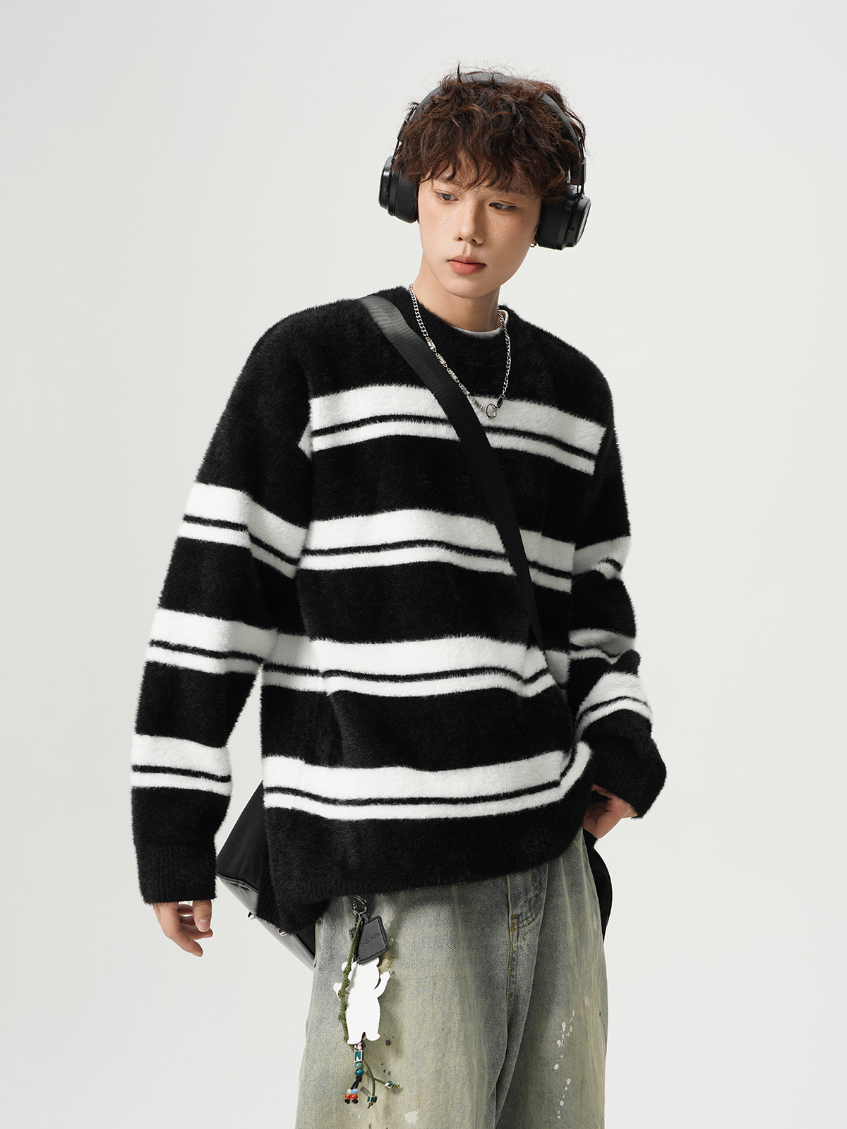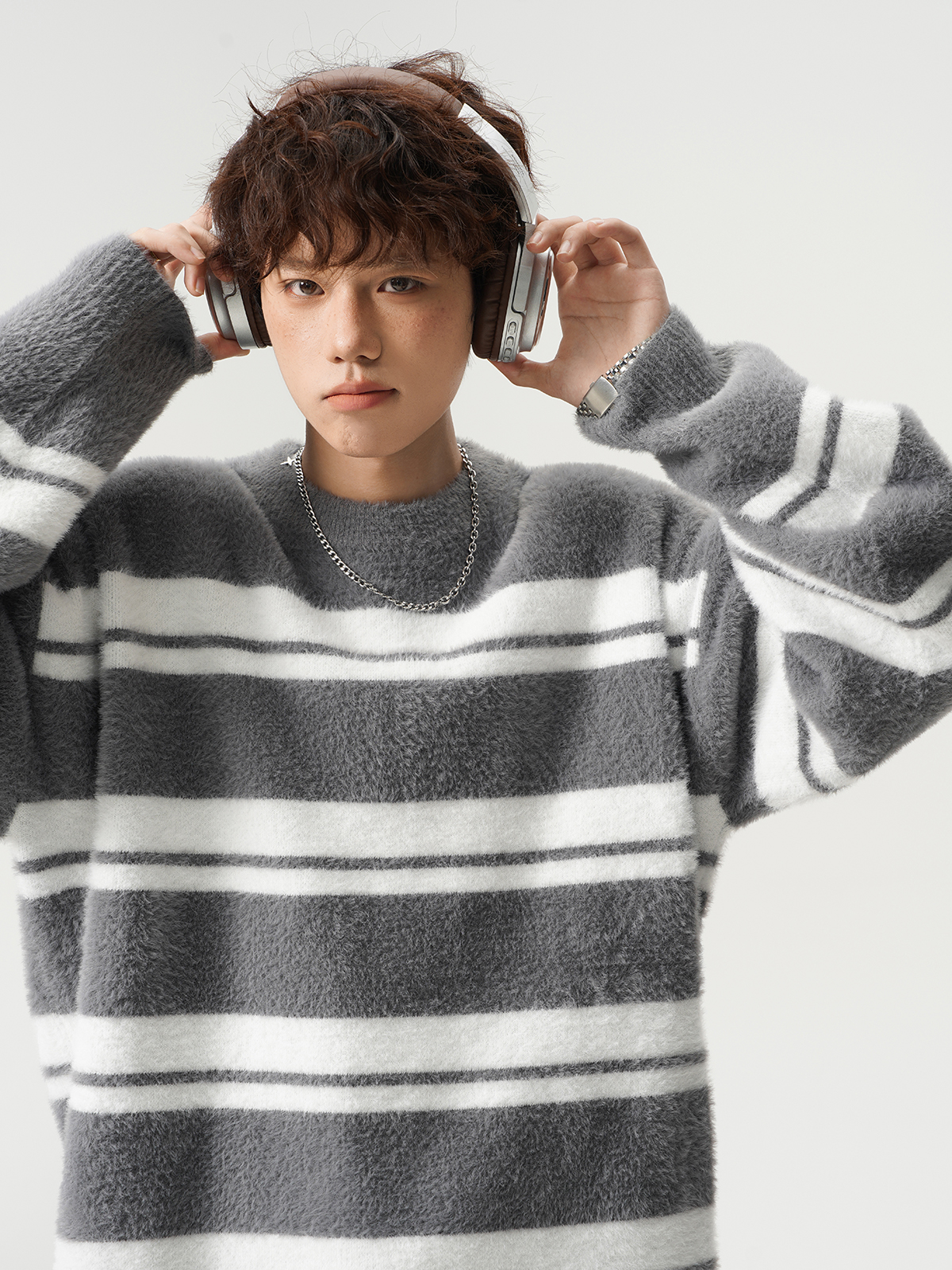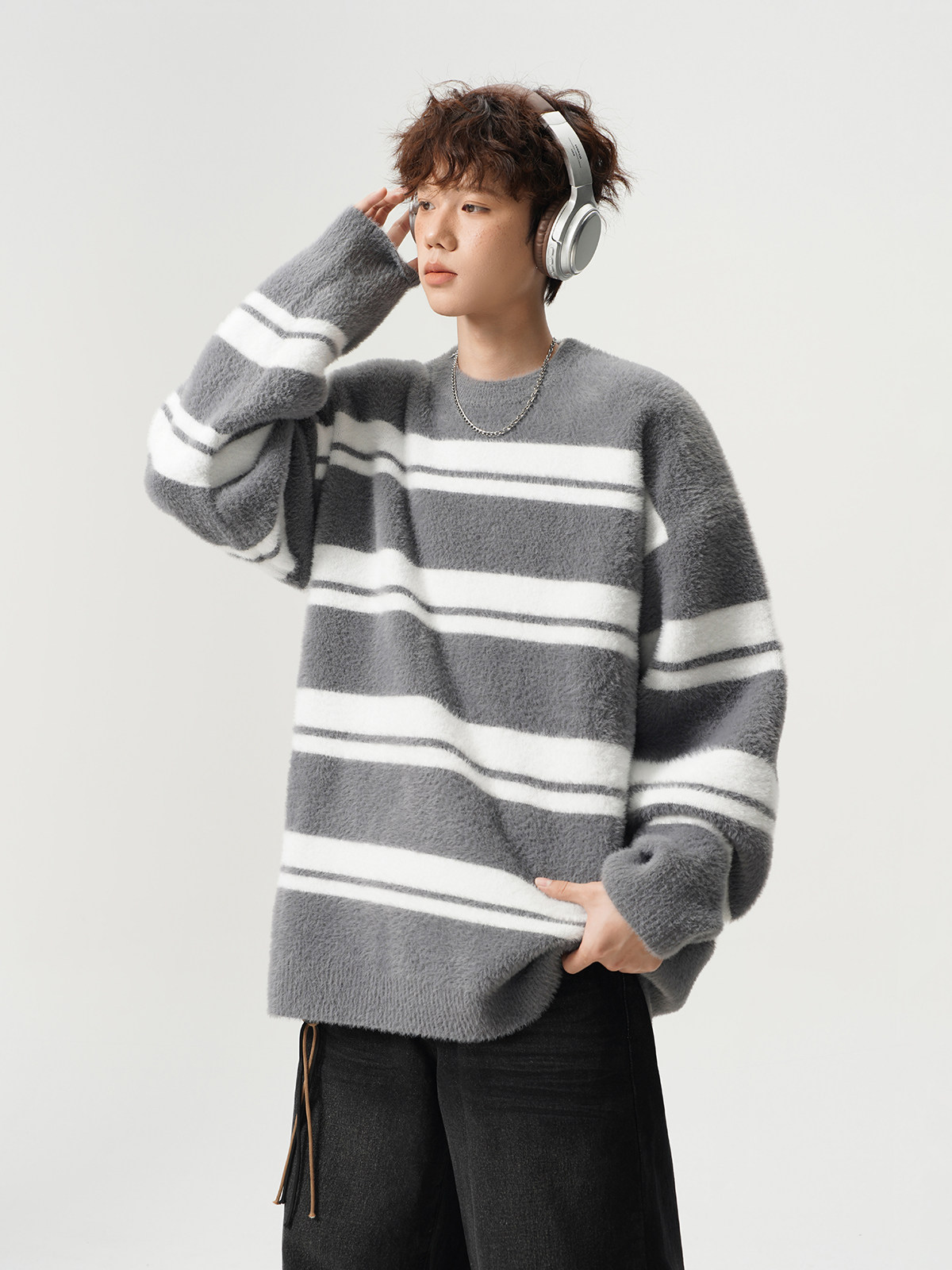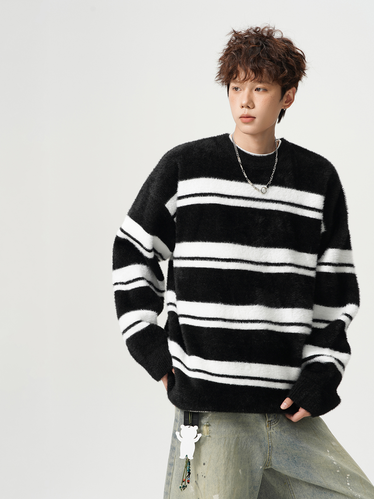 日系慵懶風條紋毛衣男女冬季2024新款加厚圓領針織衫百搭內搭外套