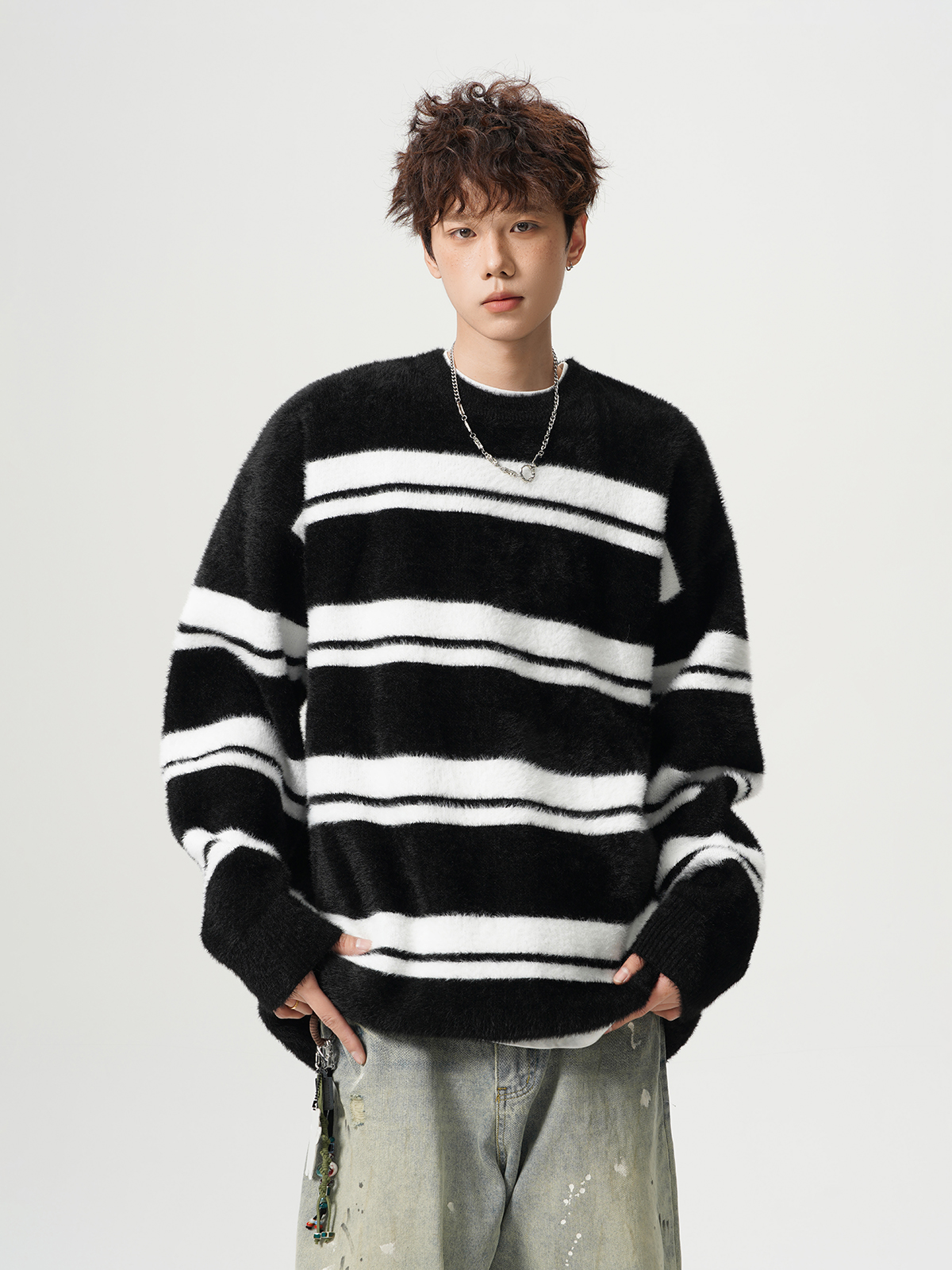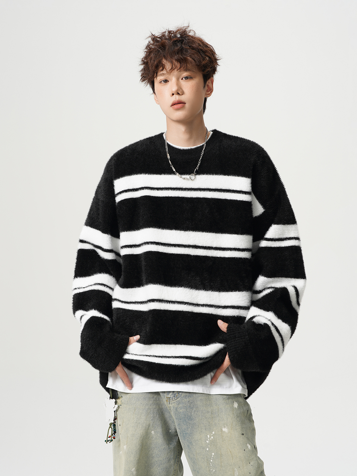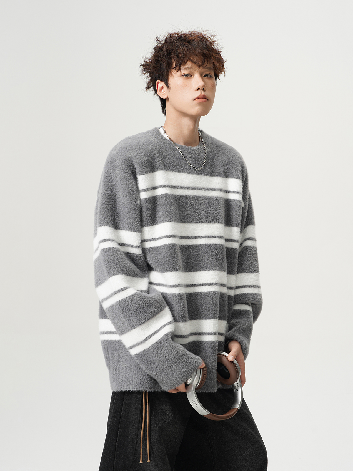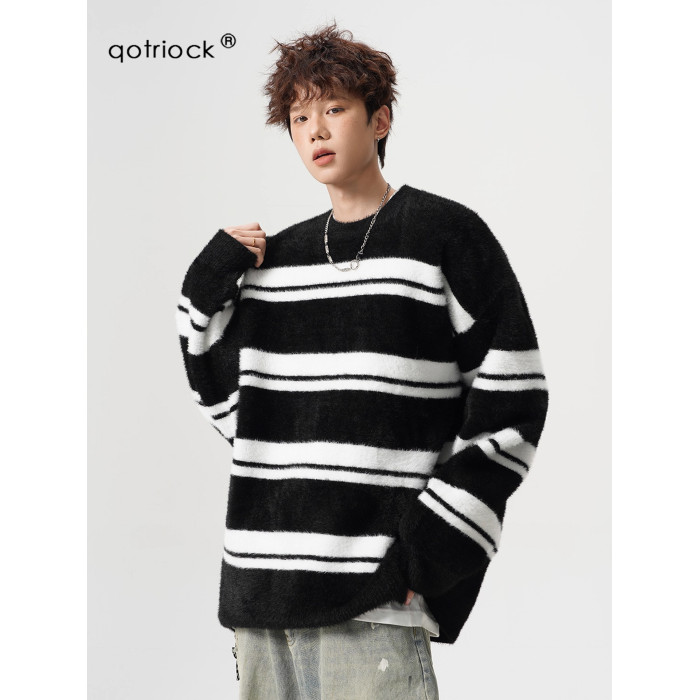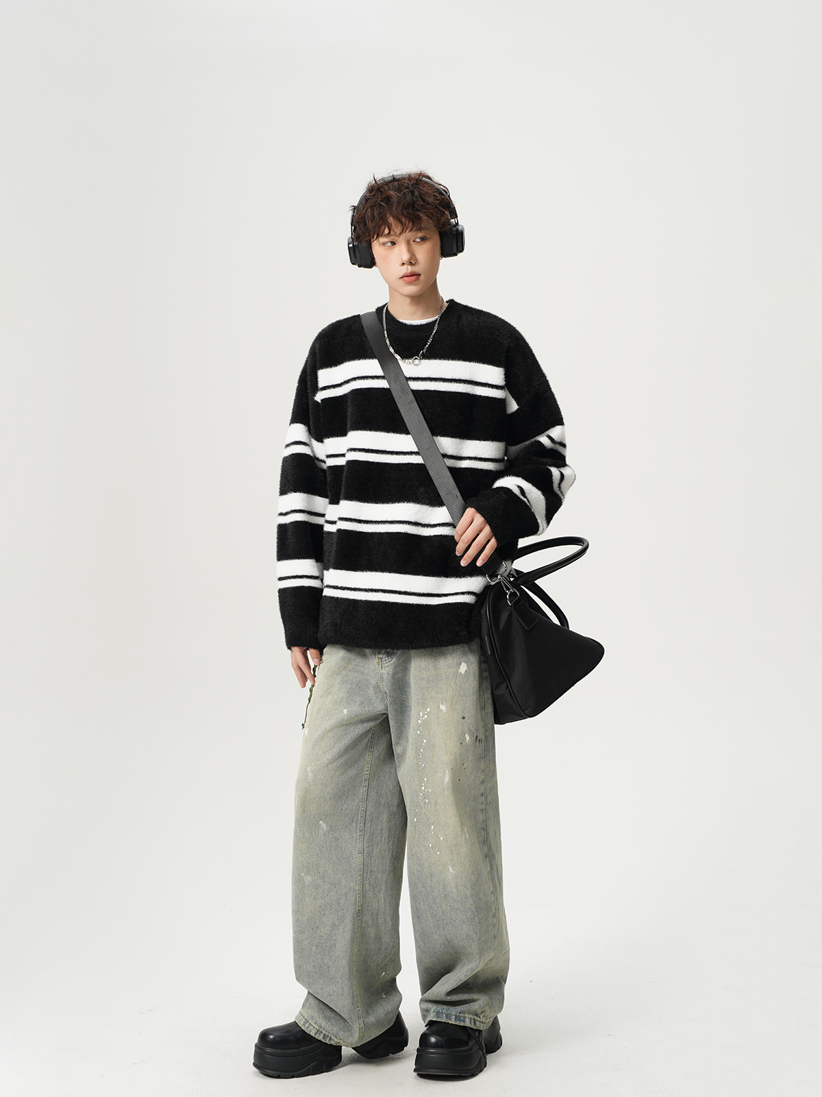 日系慵懶風條紋毛衣男女冬季2024新款加厚圓領針織衫百搭內搭外套