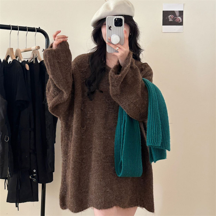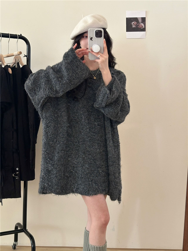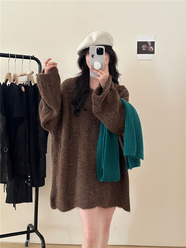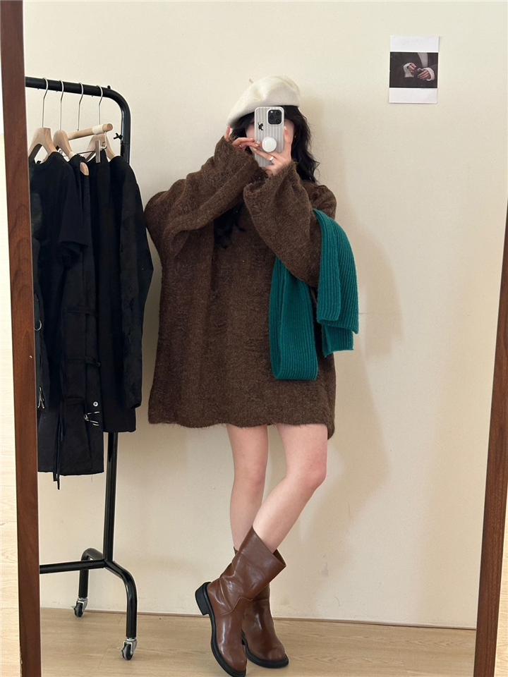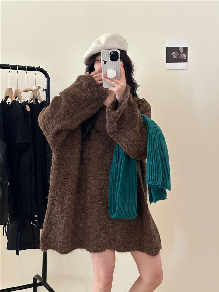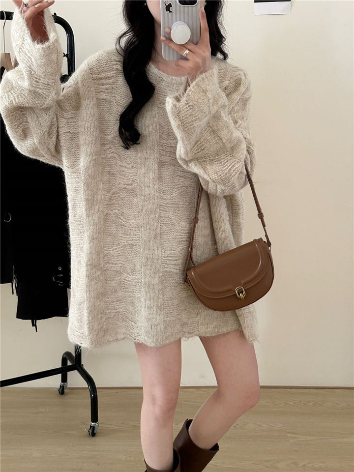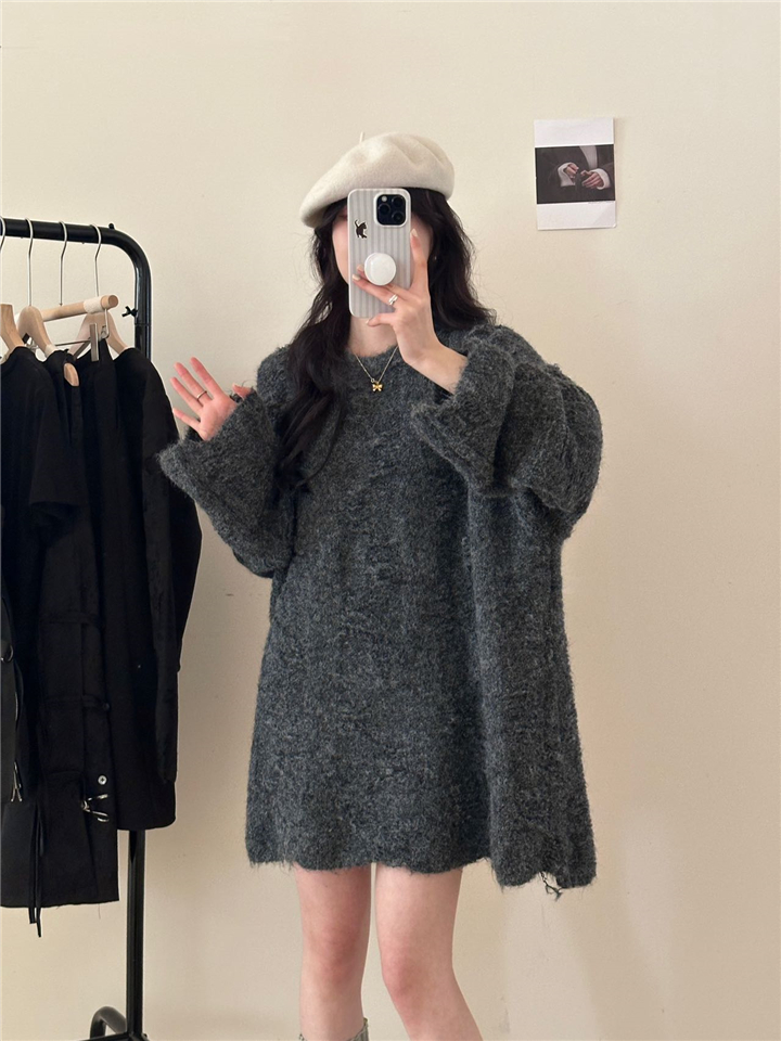 透視復古鏤空方塊圓領大毛衣中長款遮屁股寬松松弛感針織上衣女