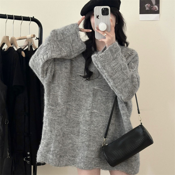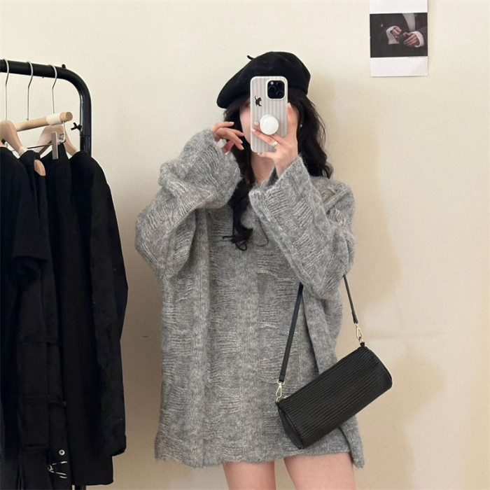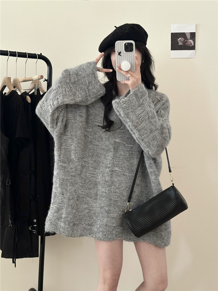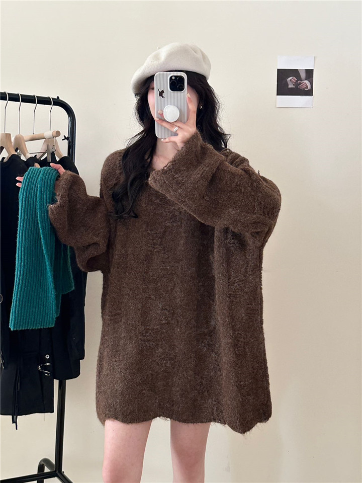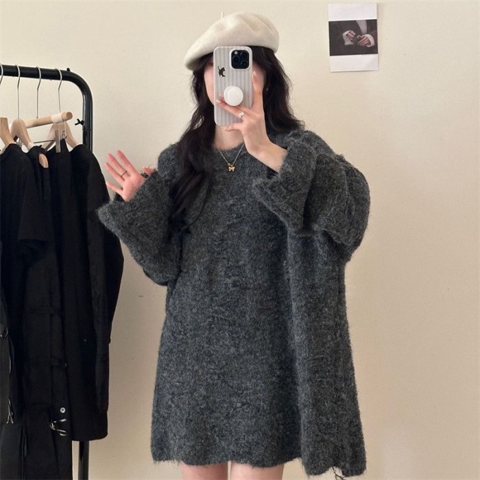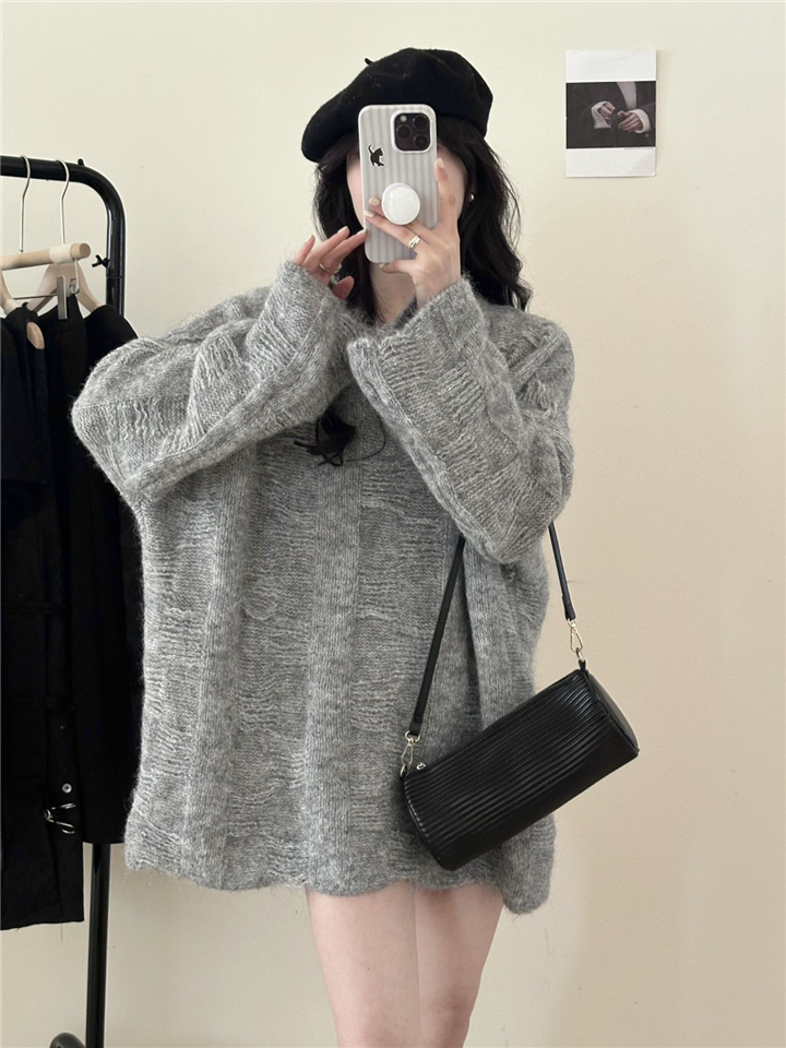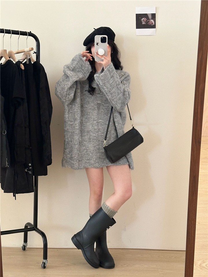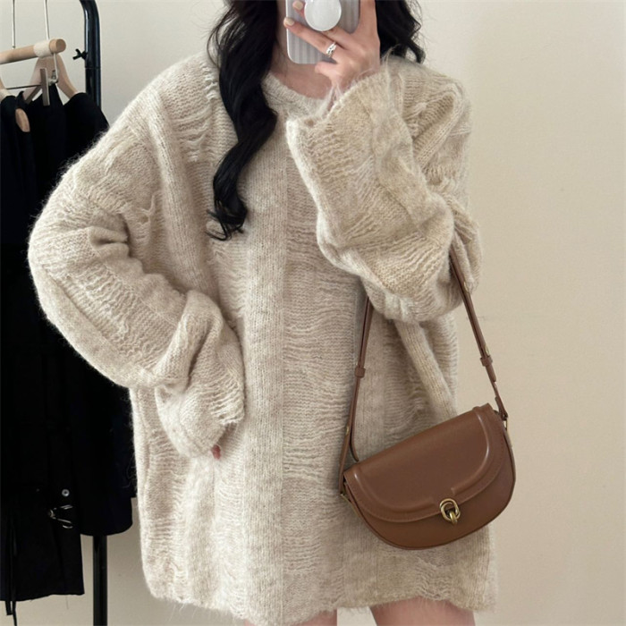 透視復古鏤空方塊圓領大毛衣中長款遮屁股寬松松弛感針織上衣女