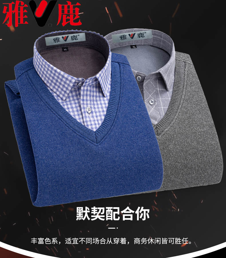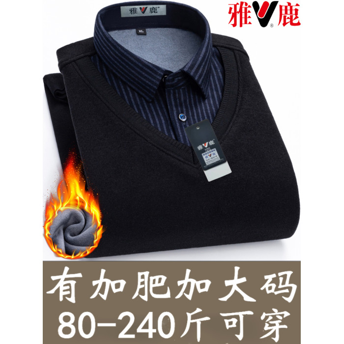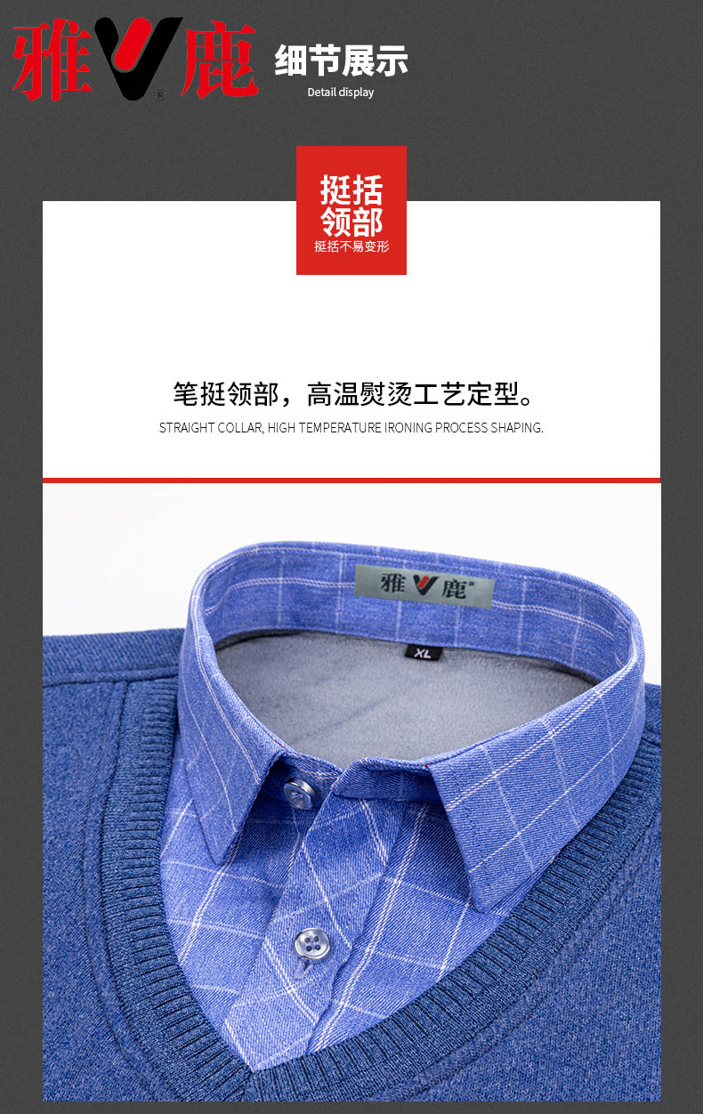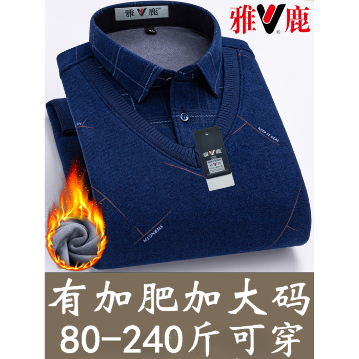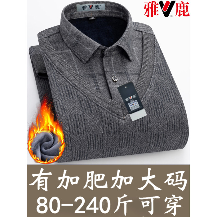 雅鹿冬季假兩件保暖襯衫男士加絨加厚中老年加大碼帶絨襯衣爸爸裝