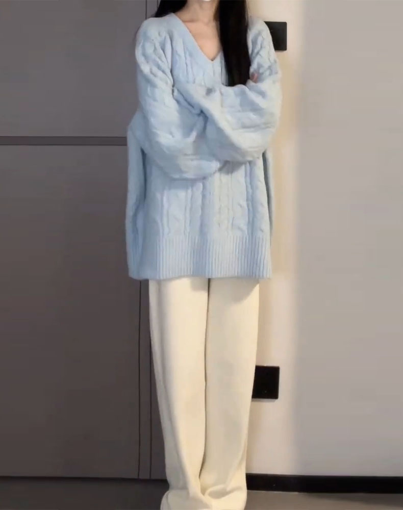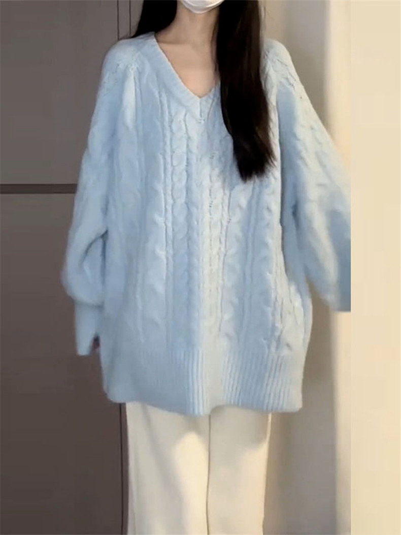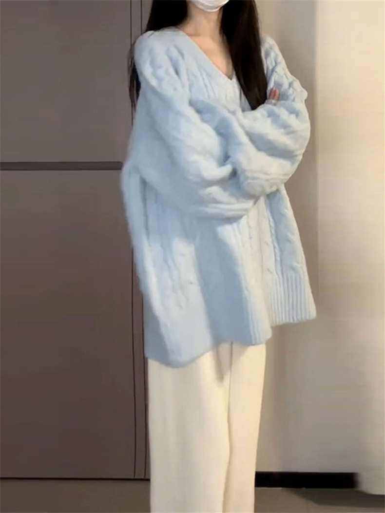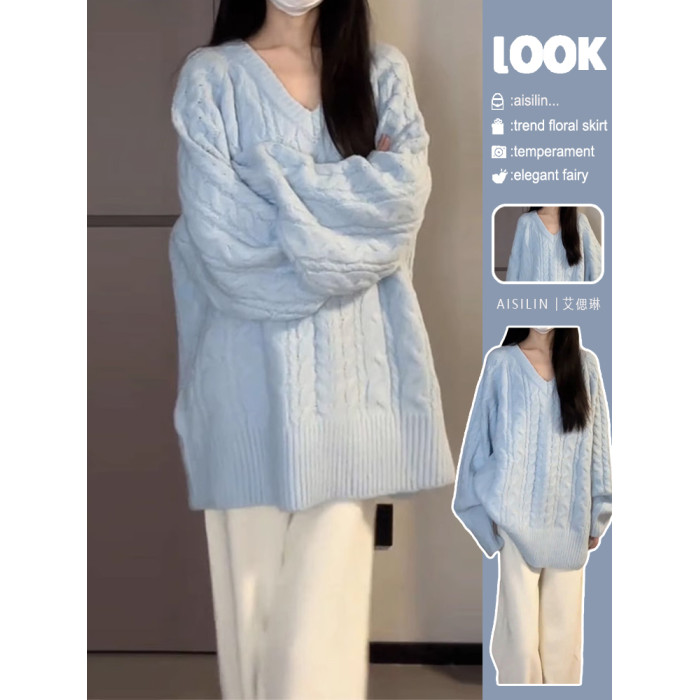 慵懶風藍色v領毛衣女秋冬季2025新款寬松高級感針織衫內搭厚上衣