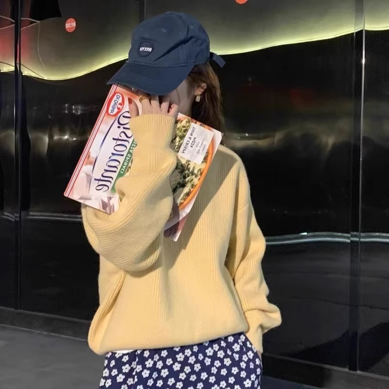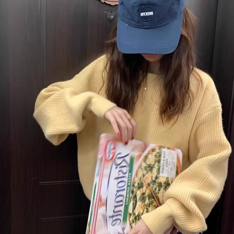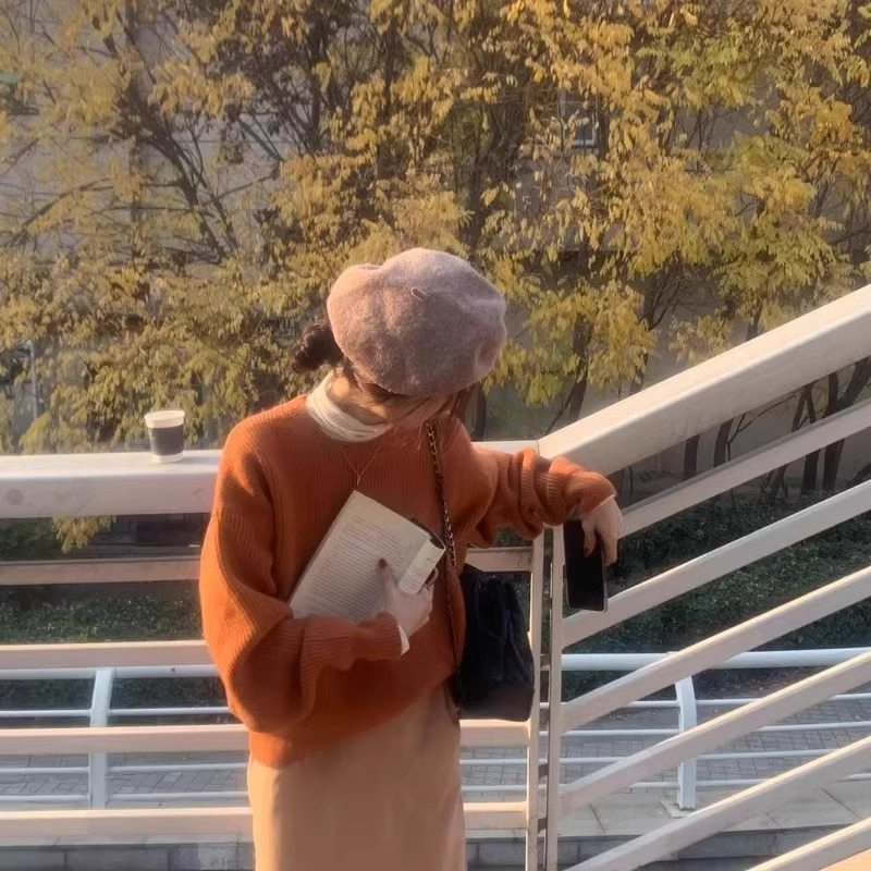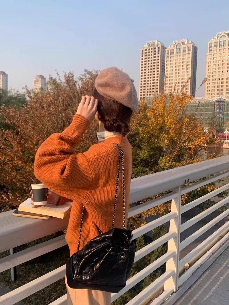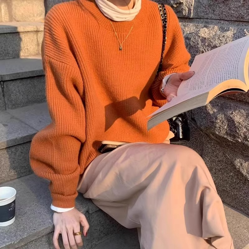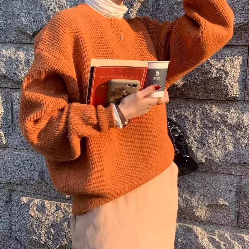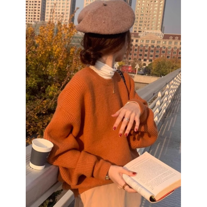 韓系chic寬松顯白南瓜色加厚保暖針織衫女秋冬季外穿套頭毛衣內搭