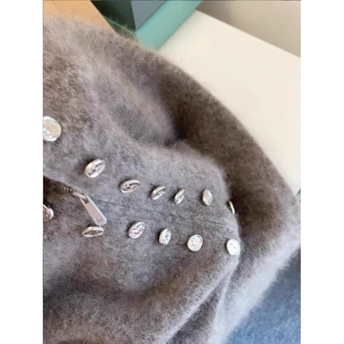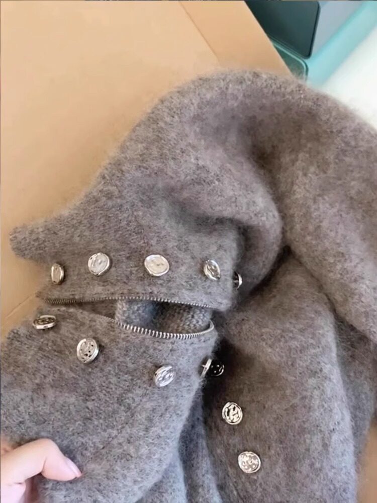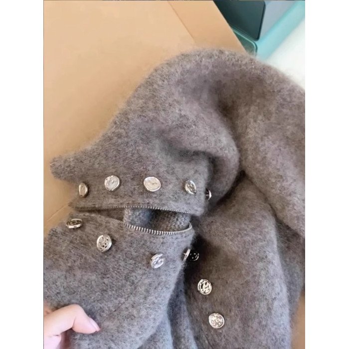 灰色重工雙排釦立領毛衣外套女秋冬加厚高級感慵懶拉鍊針織衫上衣