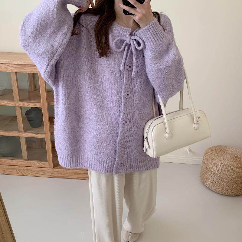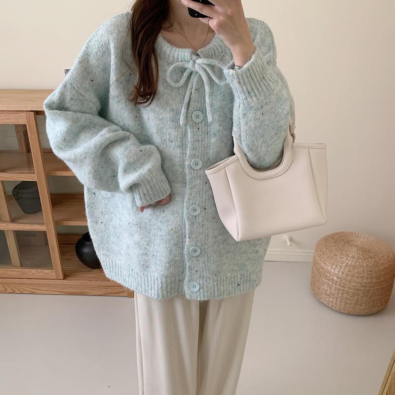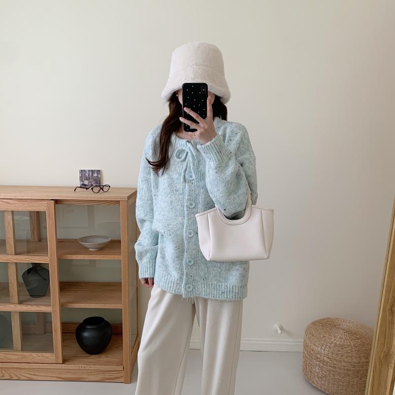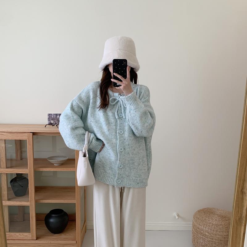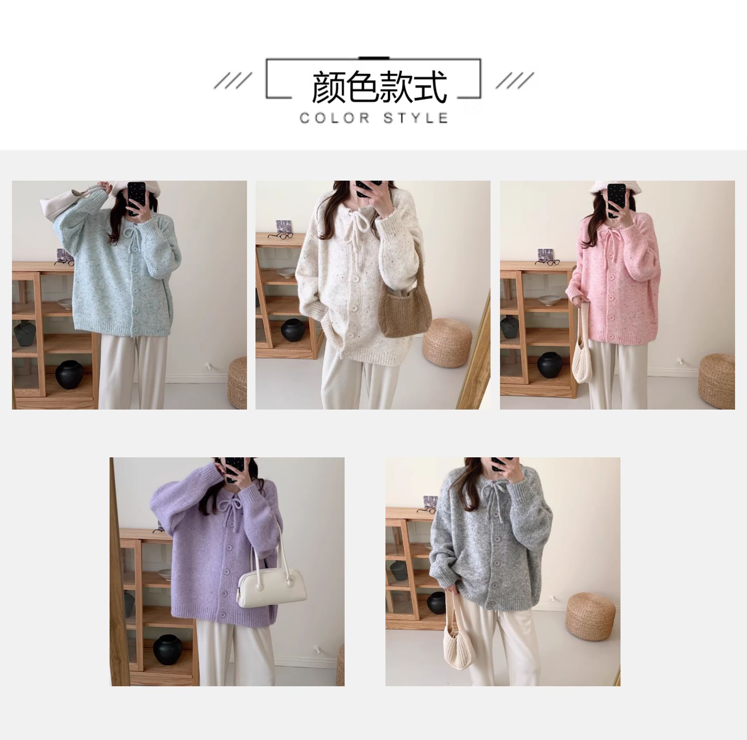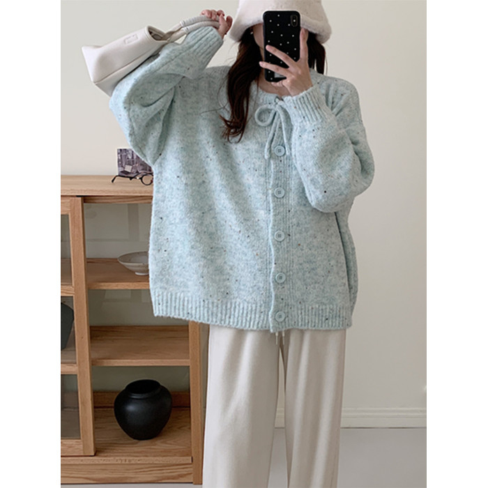 蝴蝶結藍色毛衣開衫女春秋新款系帶花毛線大碼寬松慵懶風針織外套