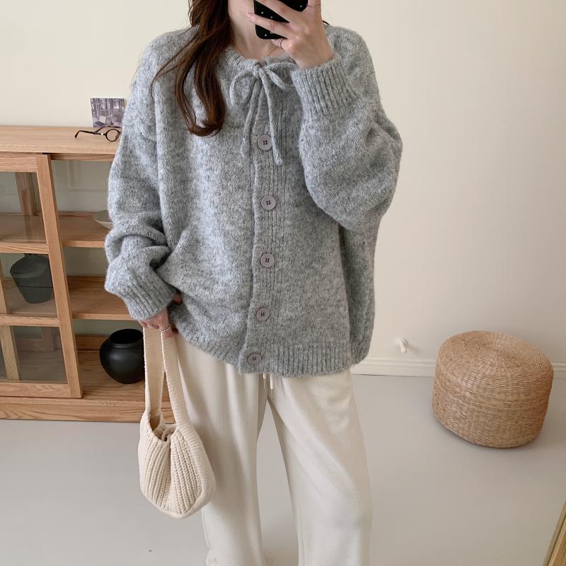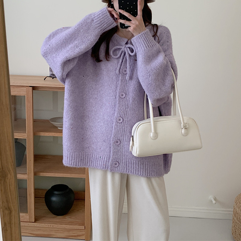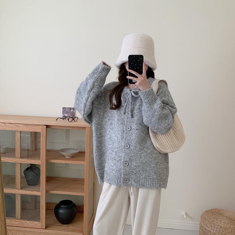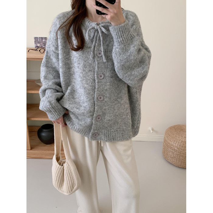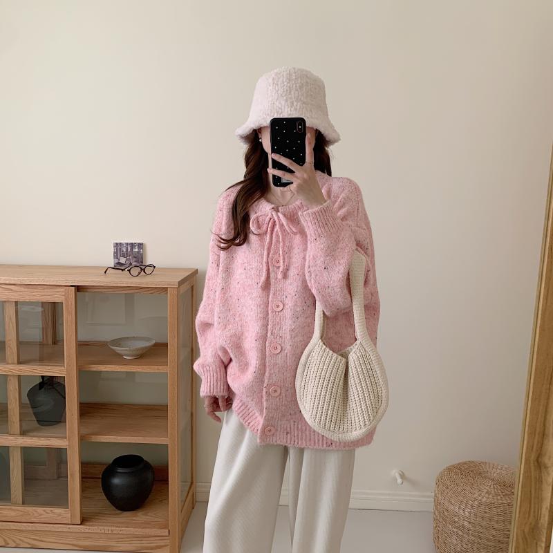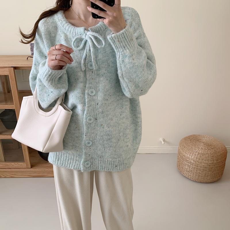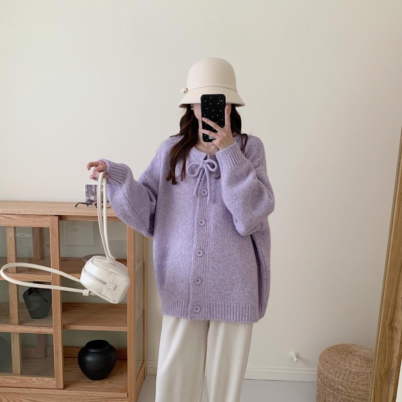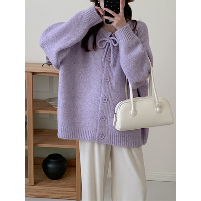 蝴蝶結藍色毛衣開衫女春秋新款系帶花毛線大碼寬松慵懶風針織外套