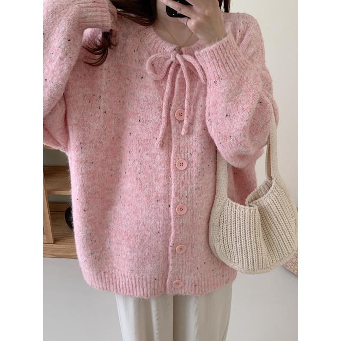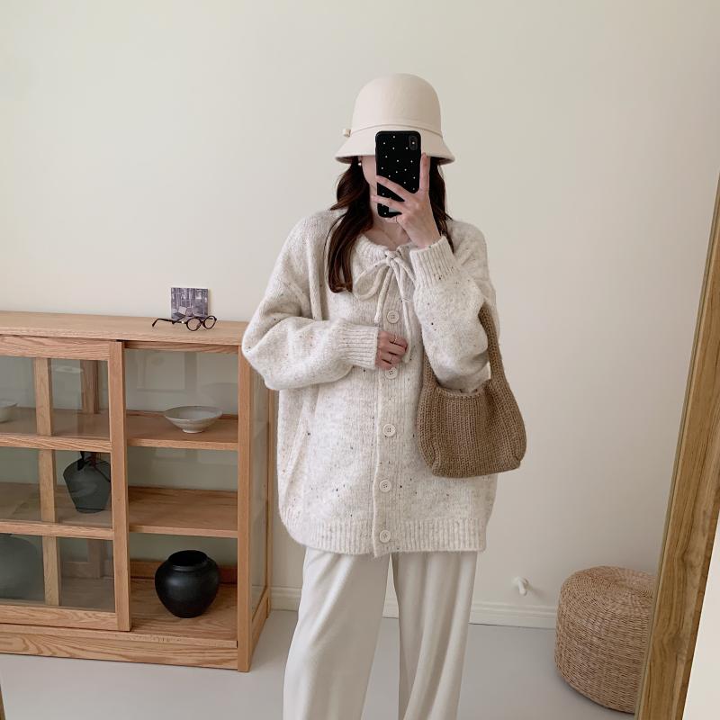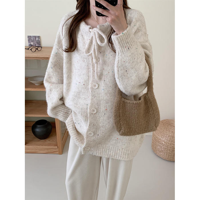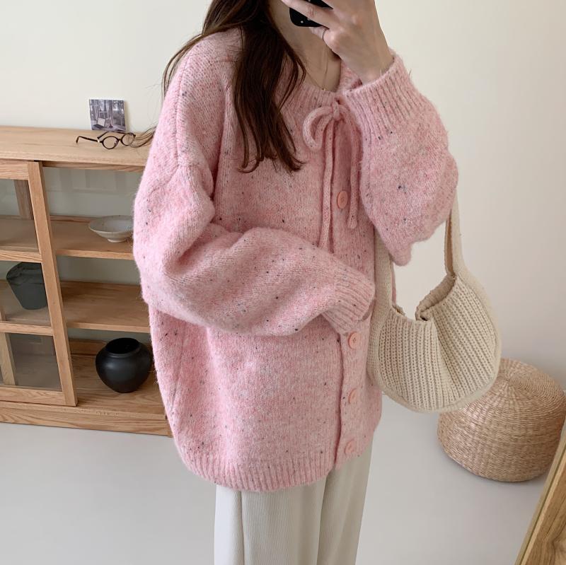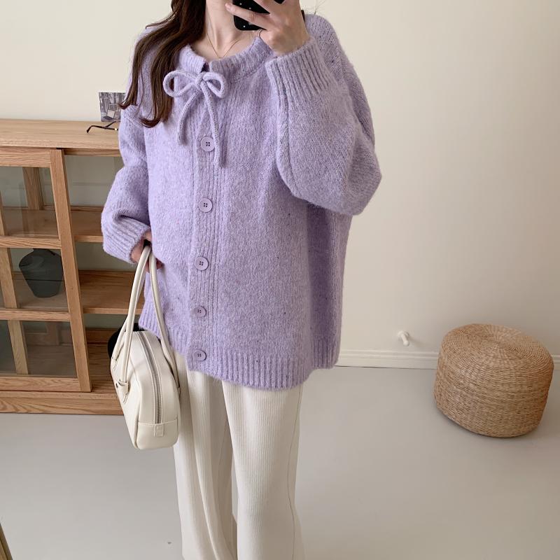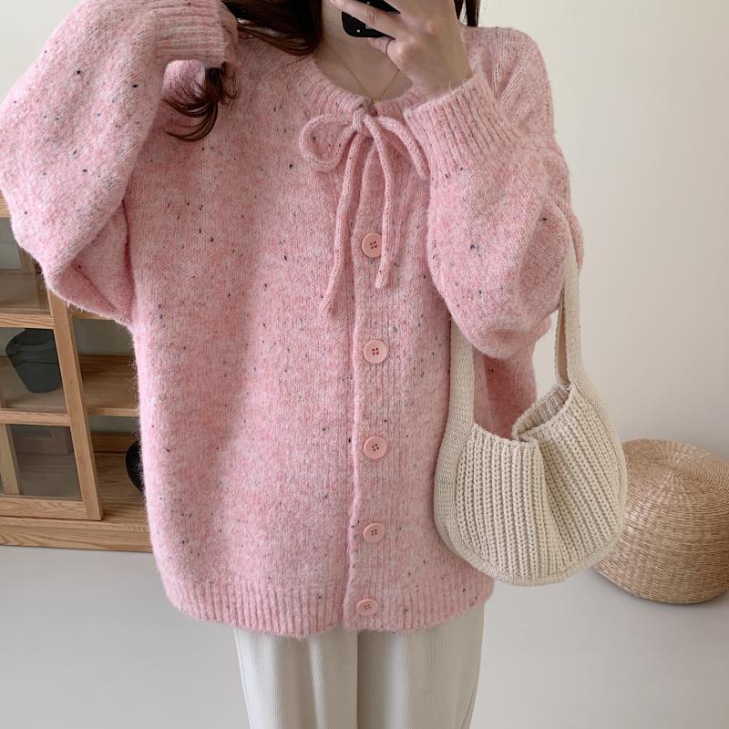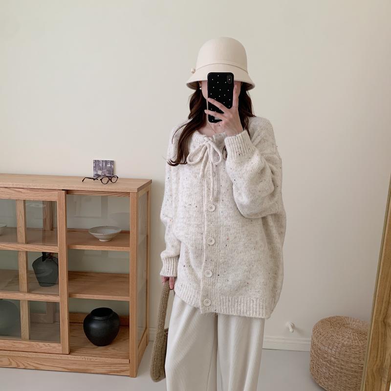 蝴蝶結藍色毛衣開衫女春秋新款系帶花毛線大碼寬松慵懶風針織外套