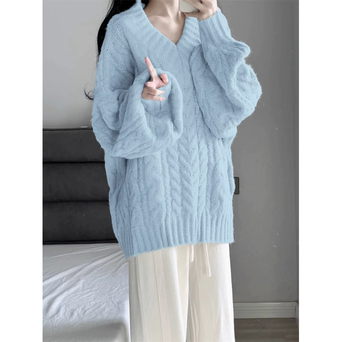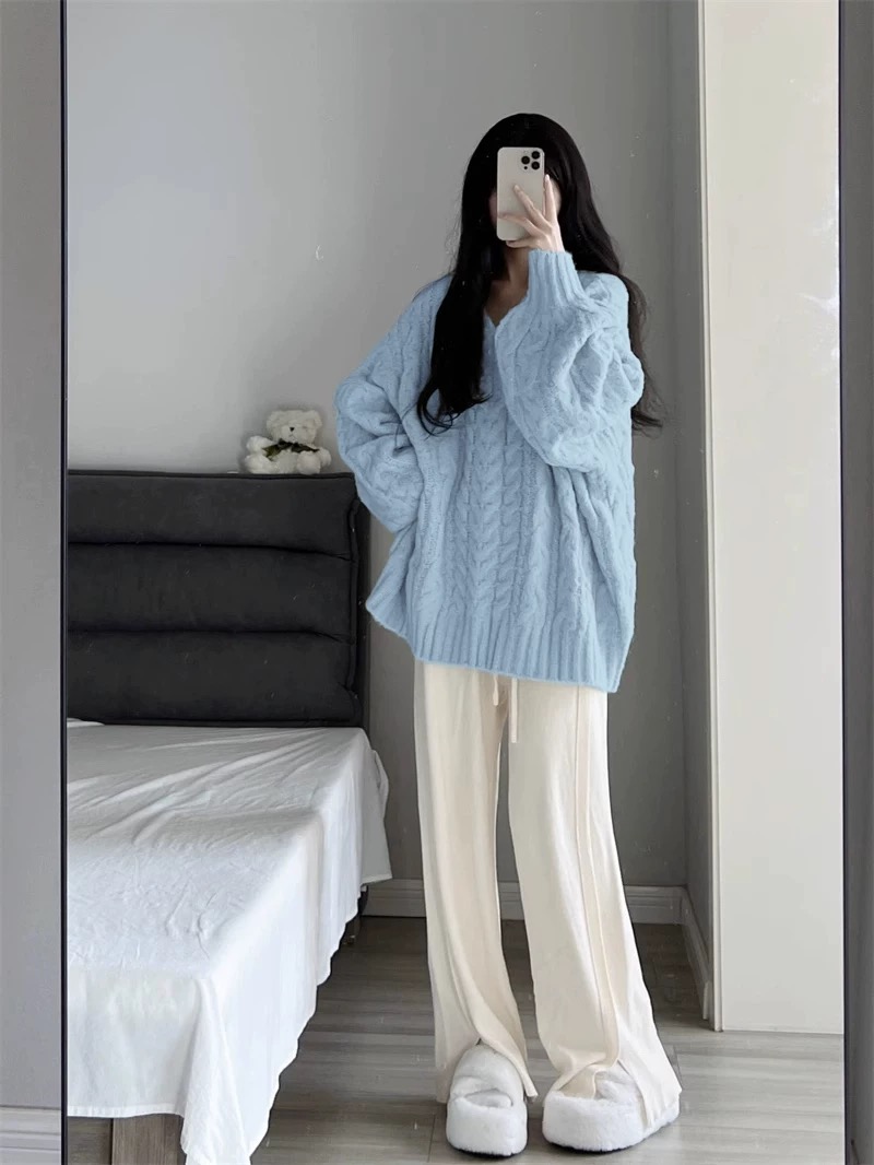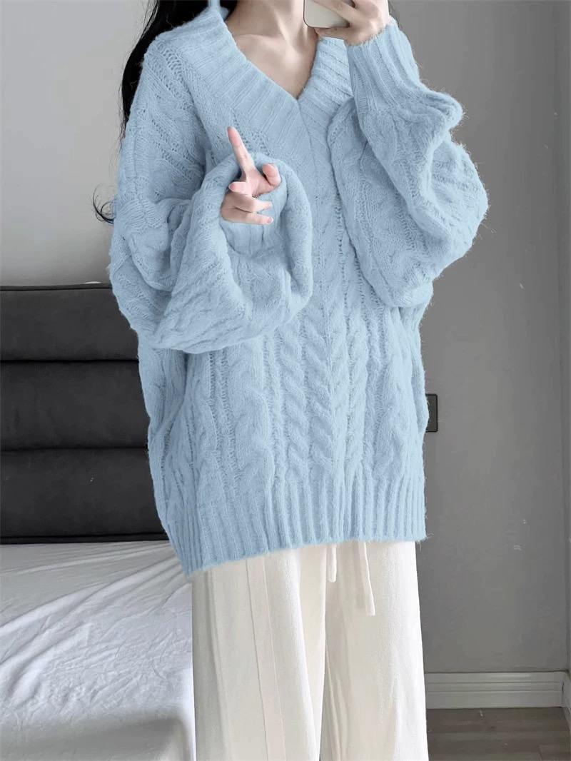 大碼胖MM淺藍色v領麻花毛衣女秋冬2025新款多巴胺穿搭慵懶風上衣
