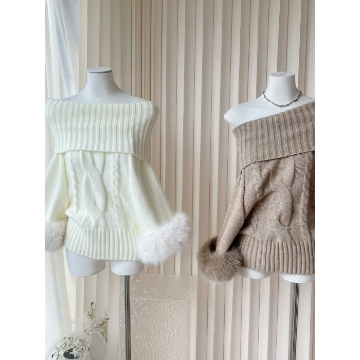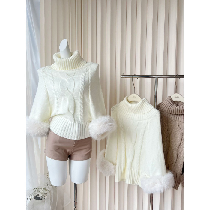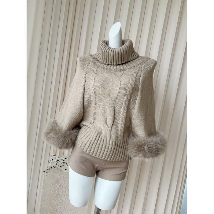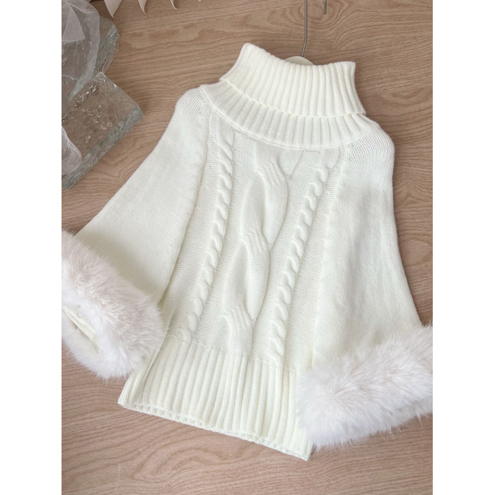 溫柔慵懶風可拆毛毛高領麻花針織鬭篷套頭毛衣女秋冬新款寬松上衣
