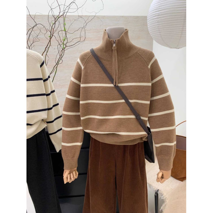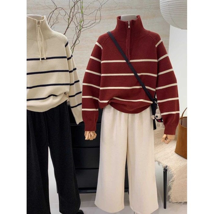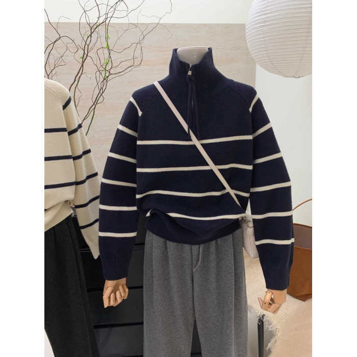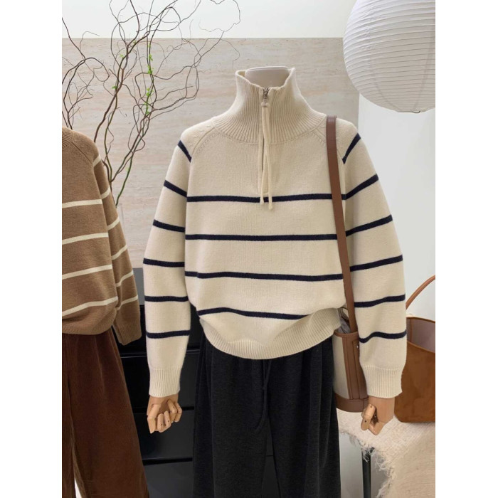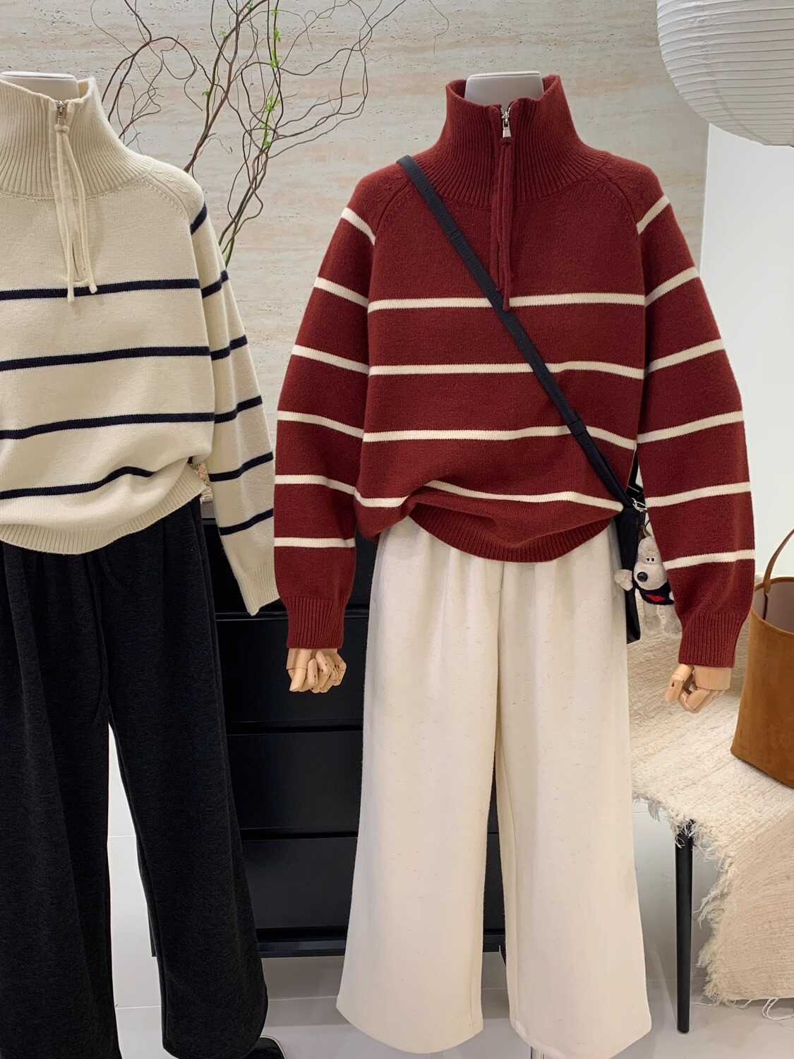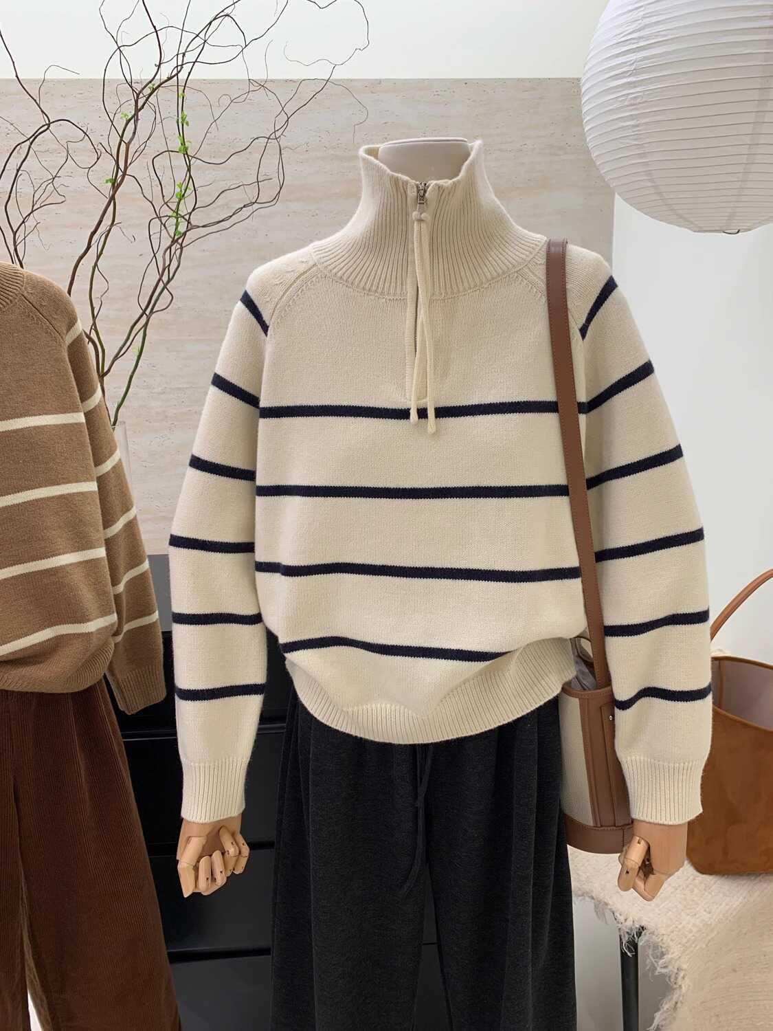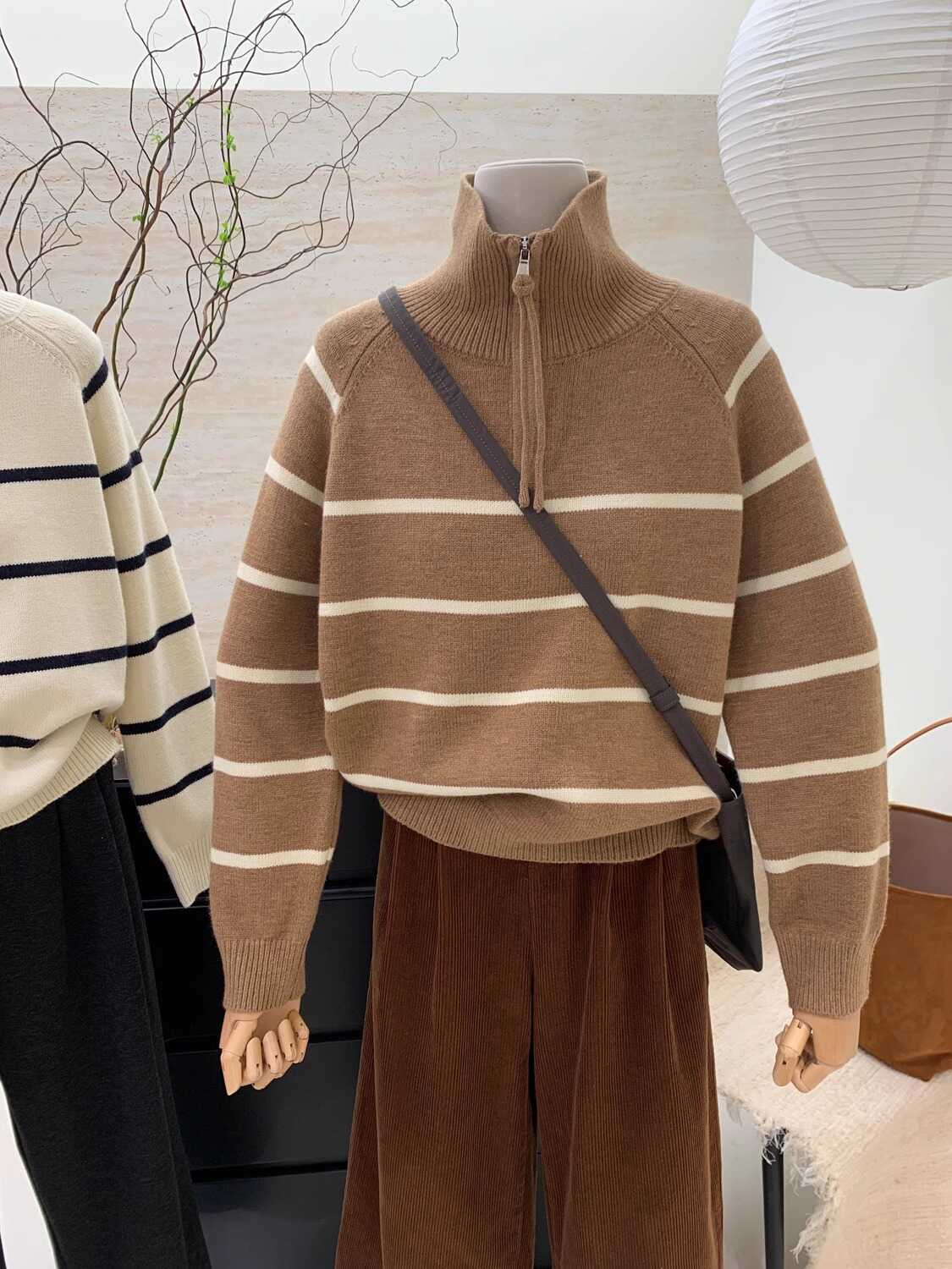 半拉鍊高領條紋套頭毛衣女冬季加厚寬松百搭外穿長袖休閒上衣外套