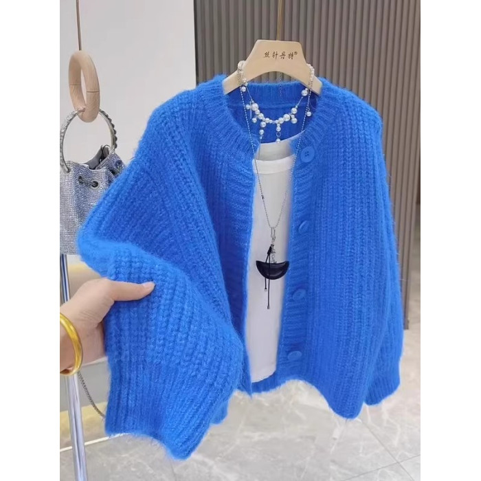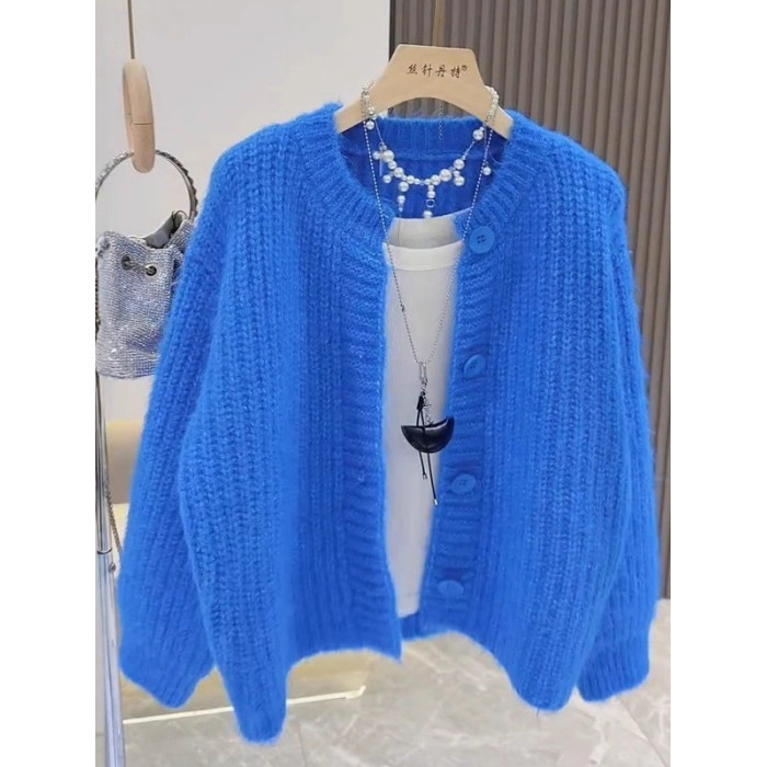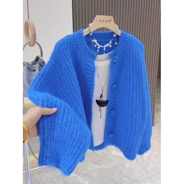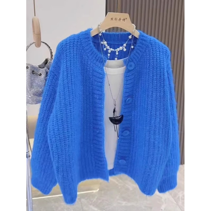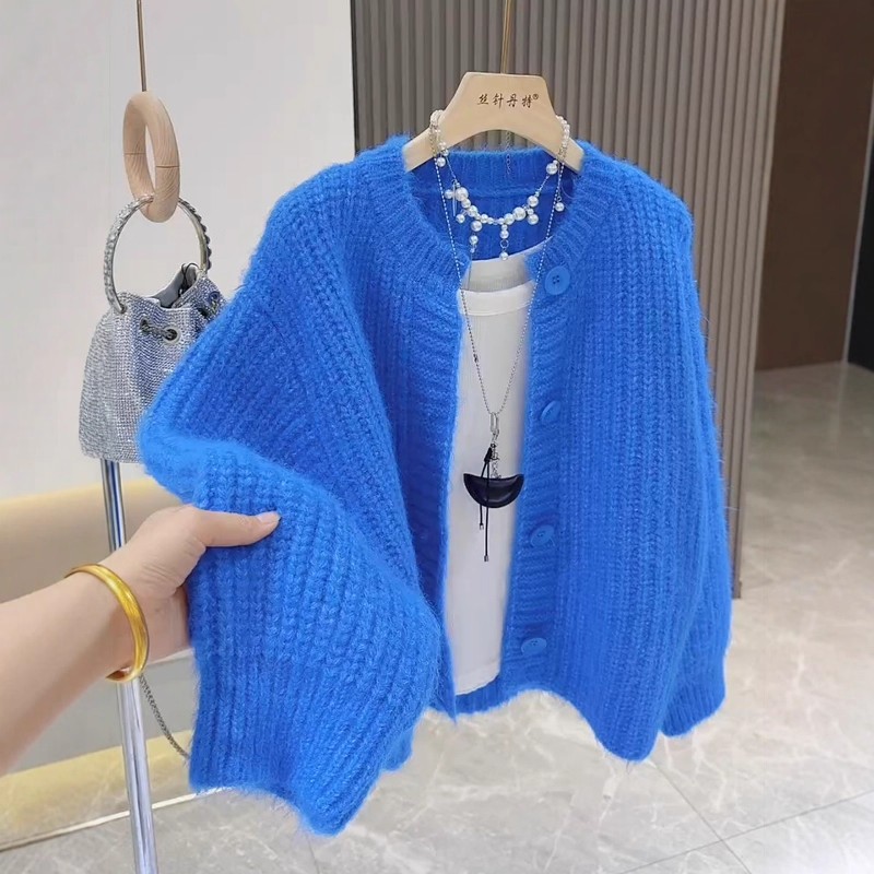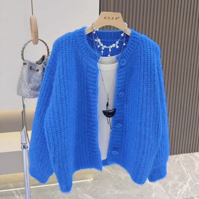 大碼韓系克萊因藍高級感毛衣開衫外套女秋冬軟糯慵懶長袖針織上衣