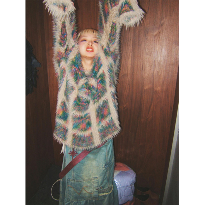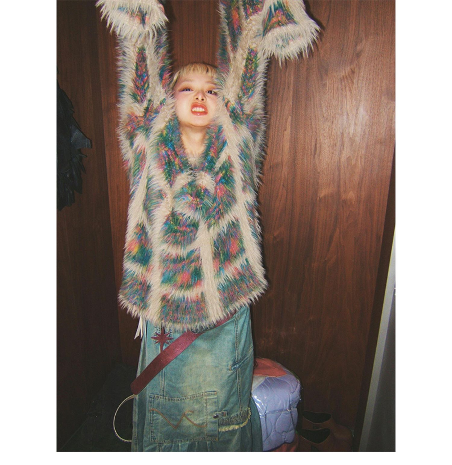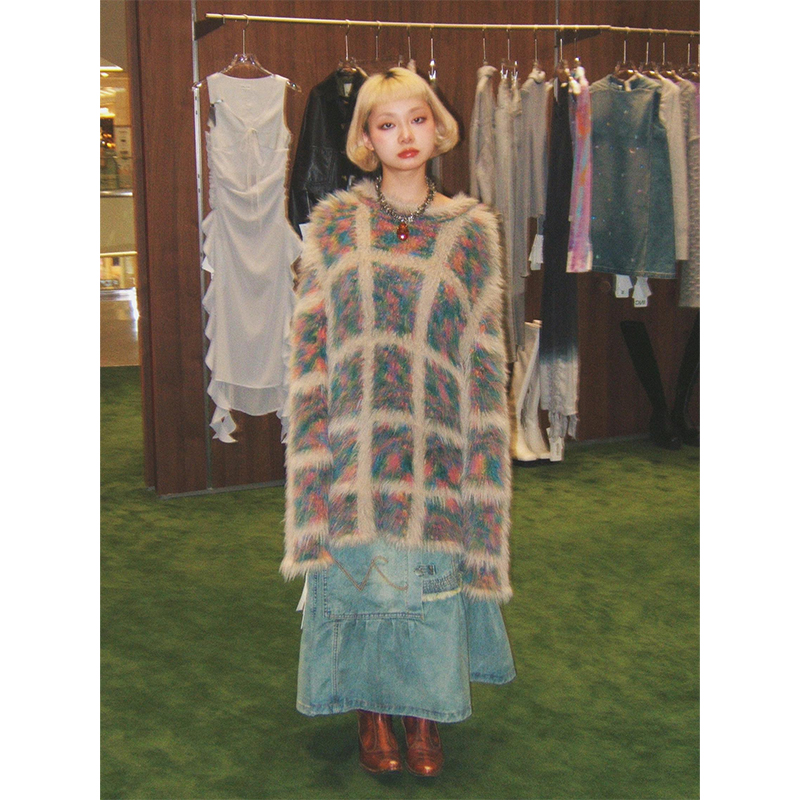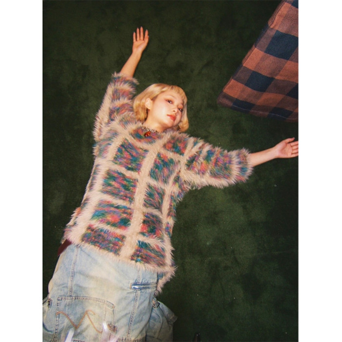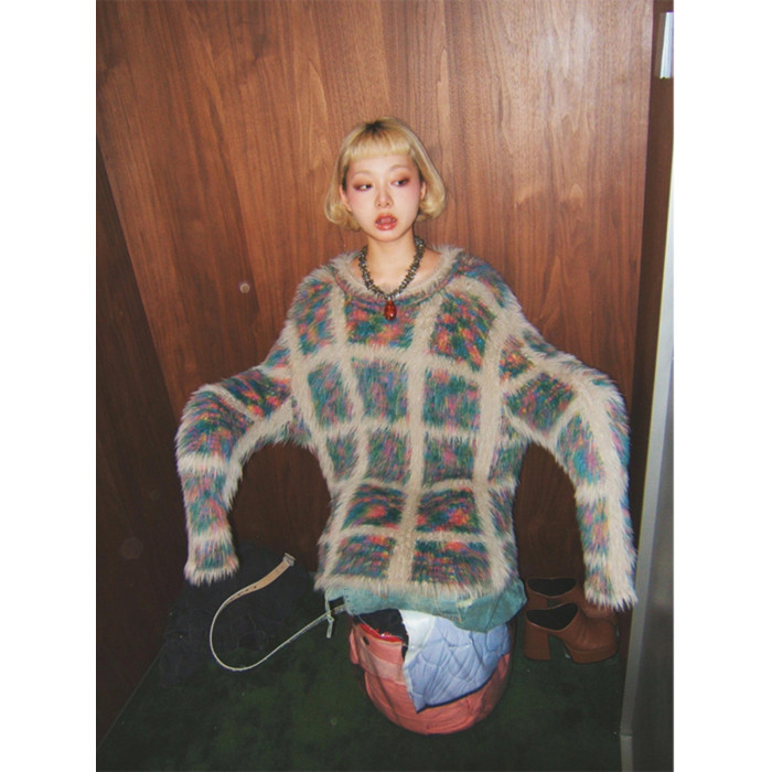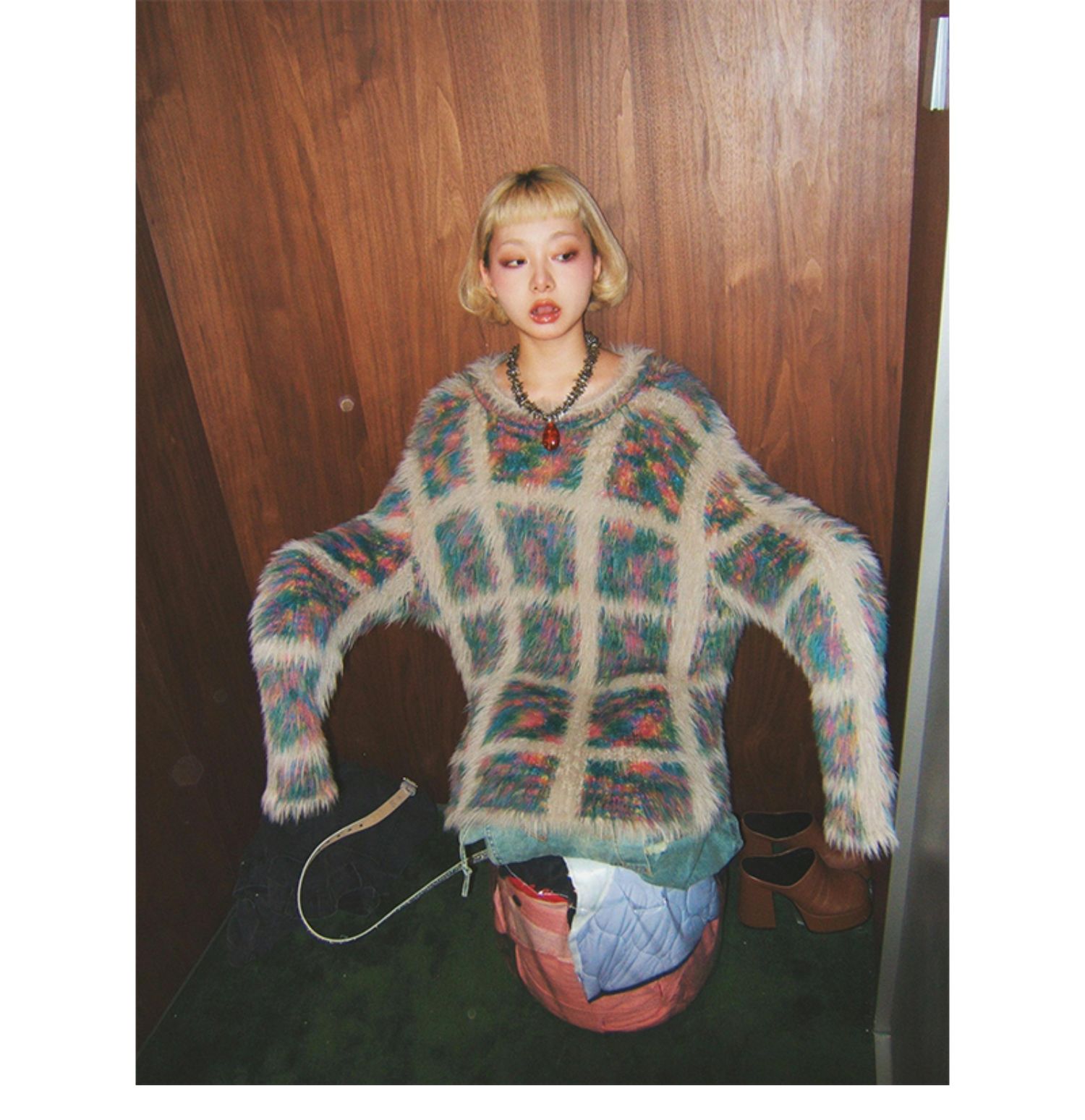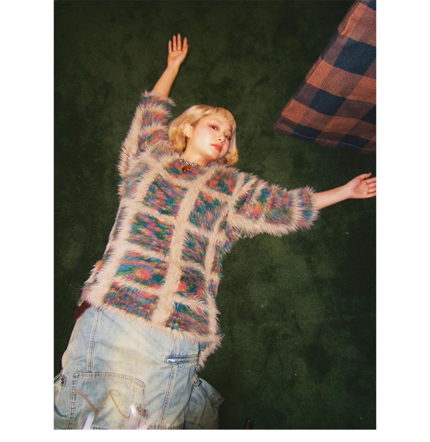 Turn up/陳腿兒 撞色毛絨長袖針織外套女秋冬圓領格紋中長毛衣ins