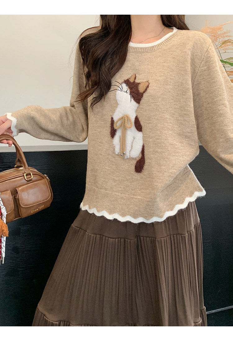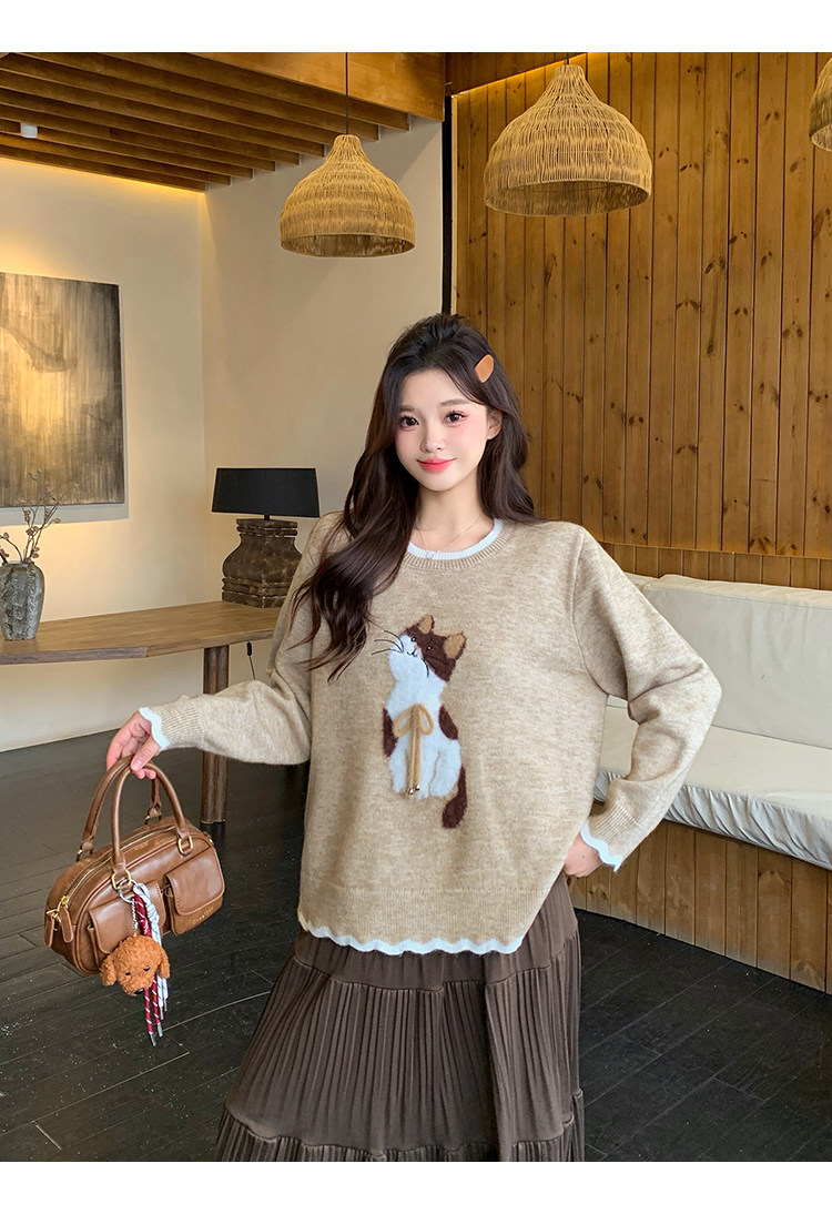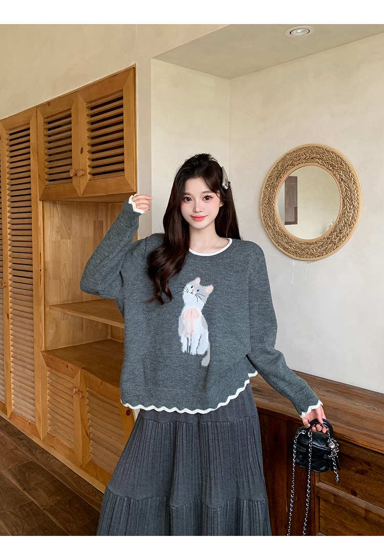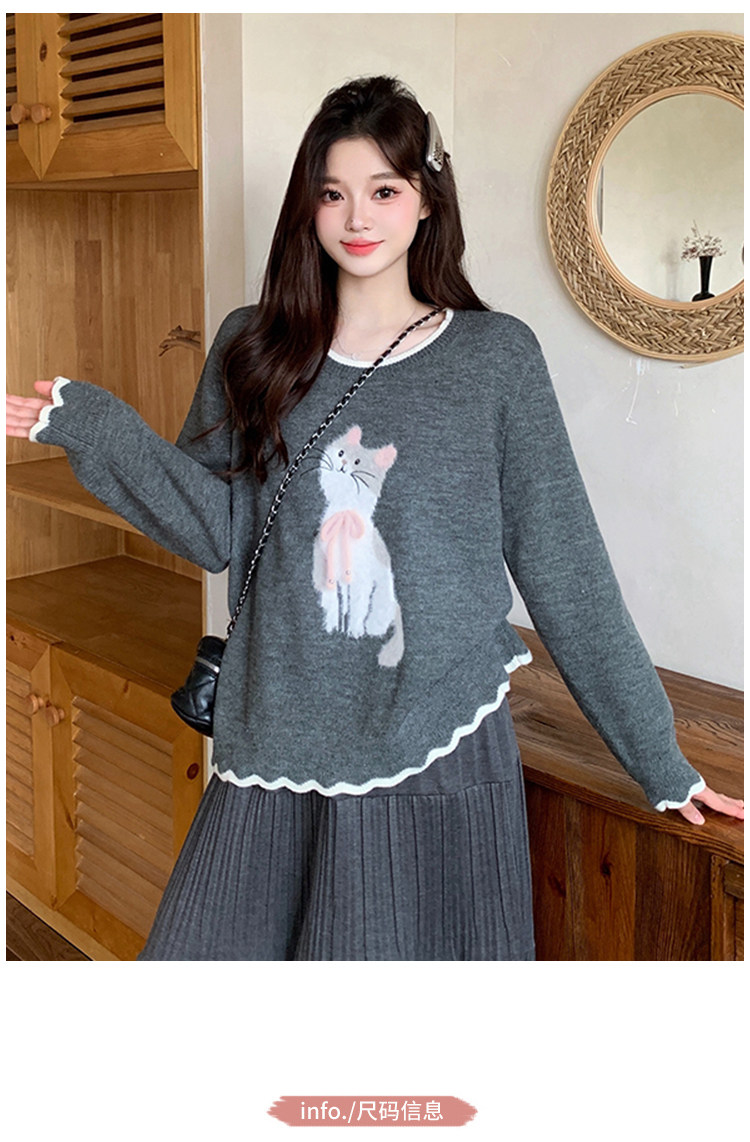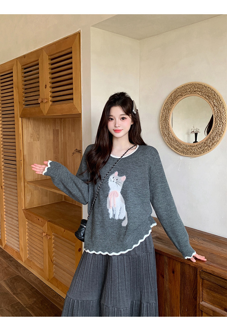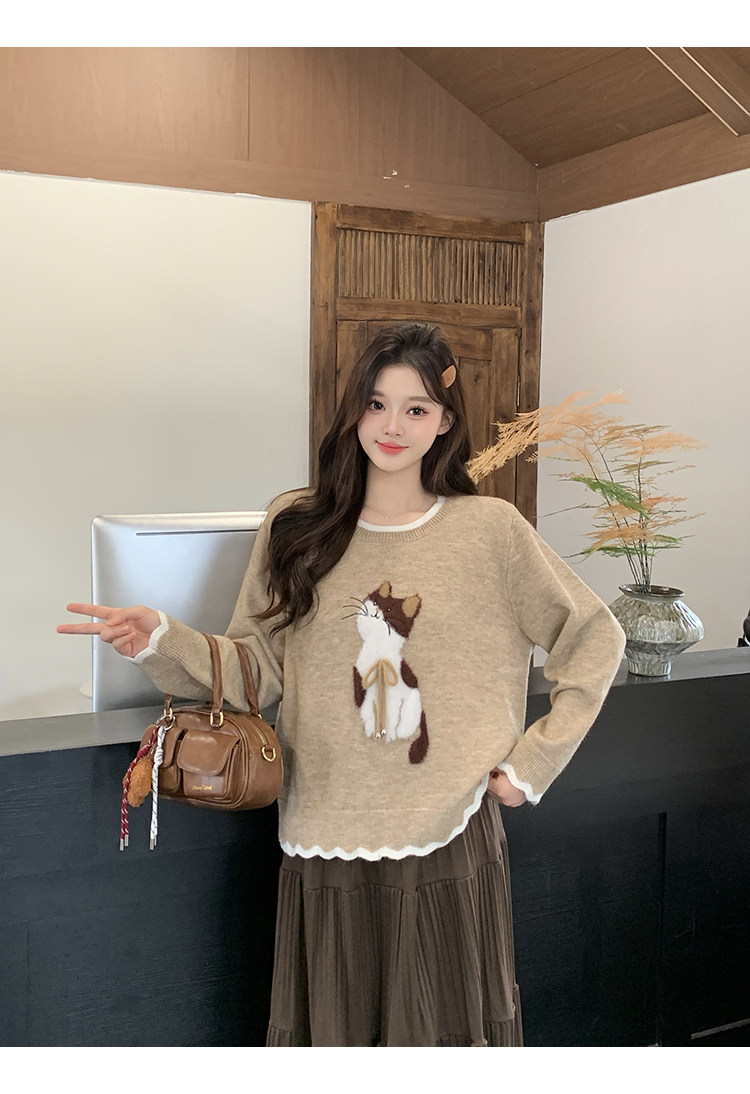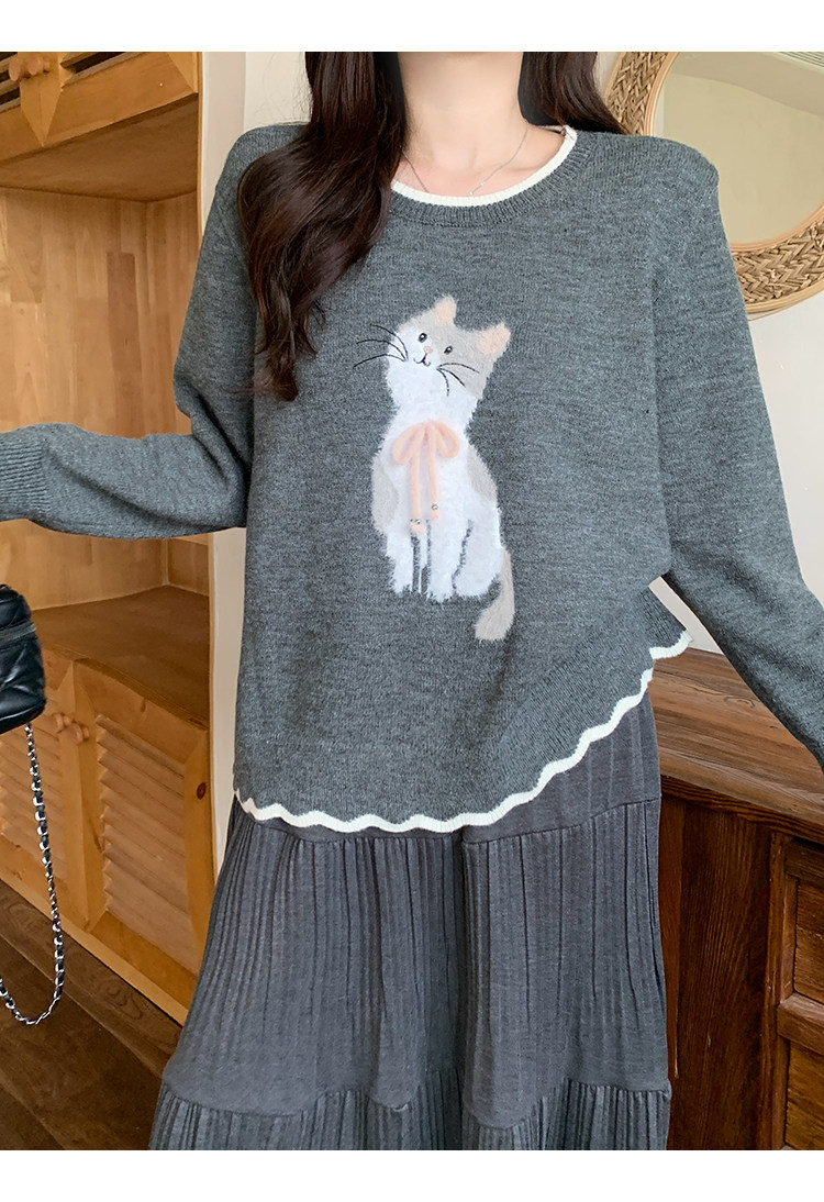 小吉家大碼女裝秋冬新款胖mm甜美慵懶風綉花小貓軟糯毛衣長袖上衣