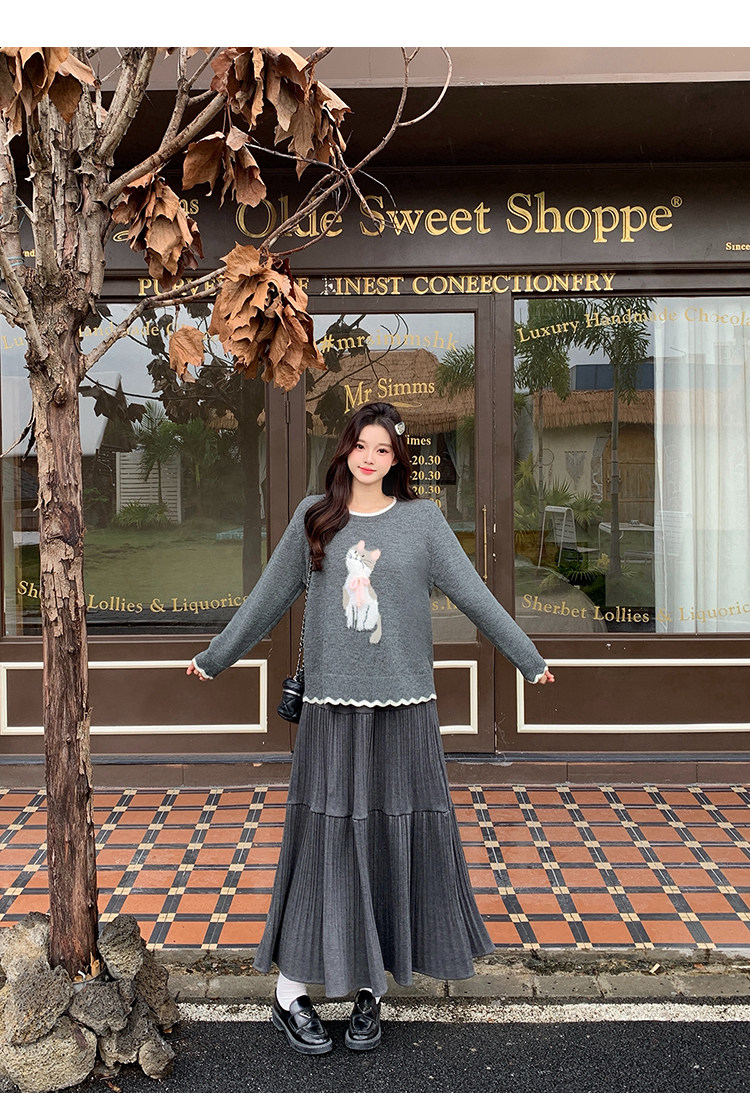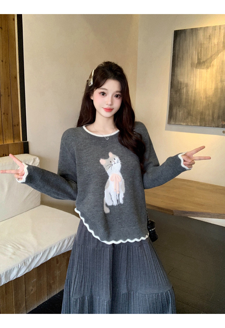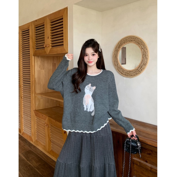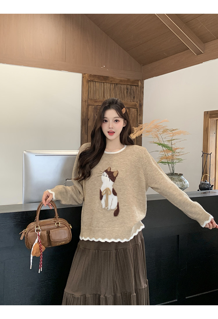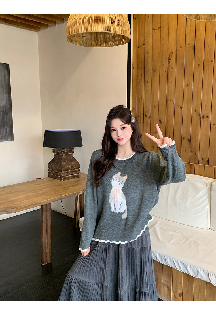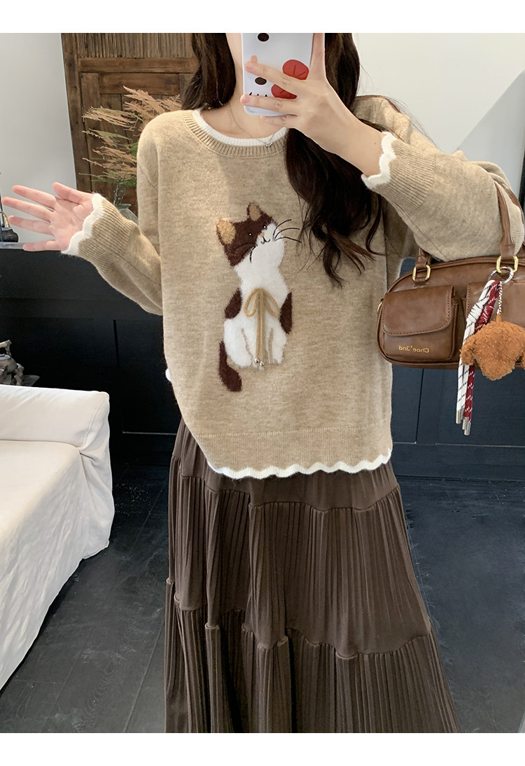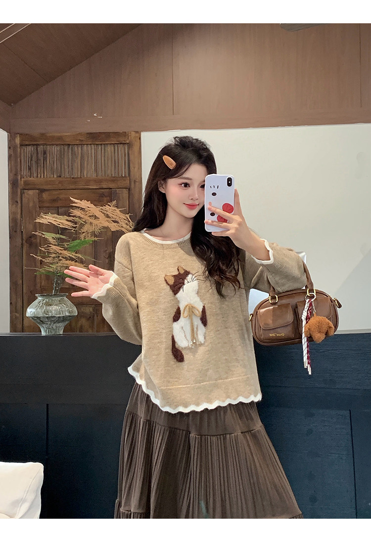 小吉家大碼女裝秋冬新款胖mm甜美慵懶風綉花小貓軟糯毛衣長袖上衣