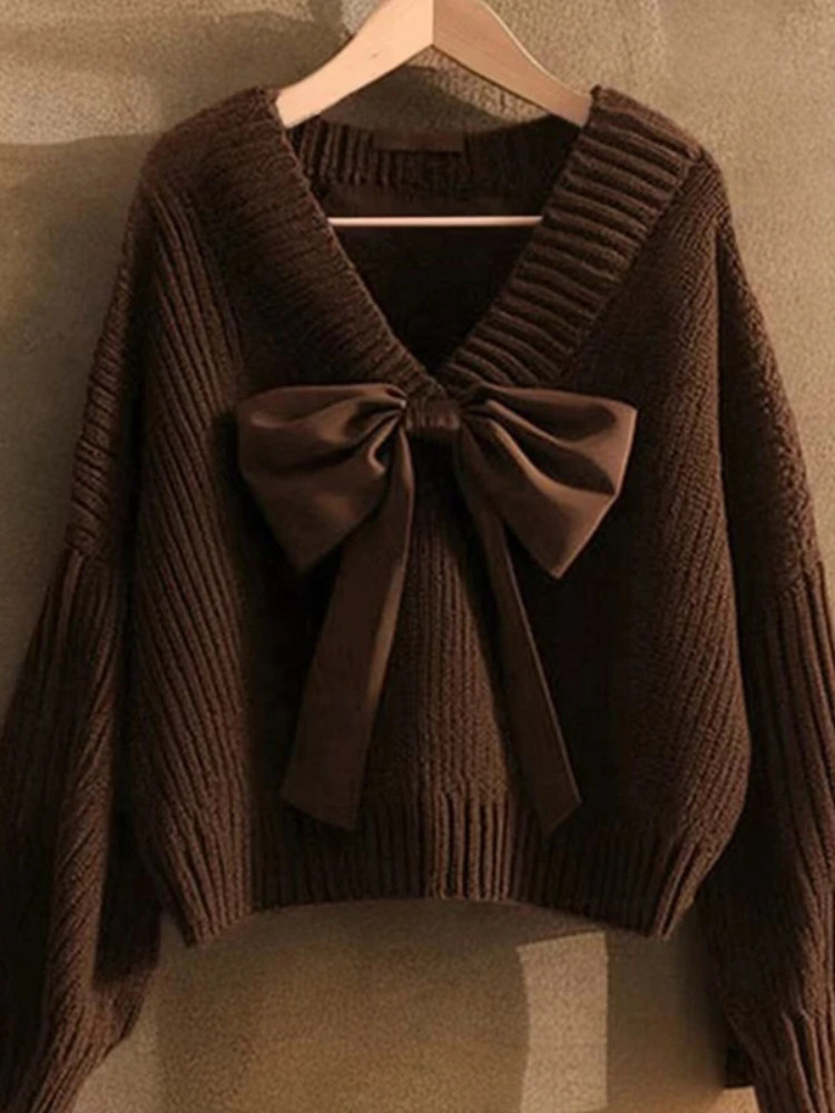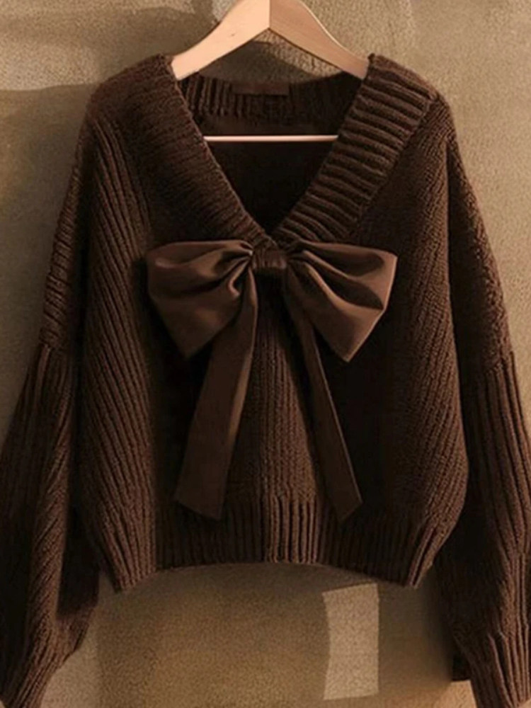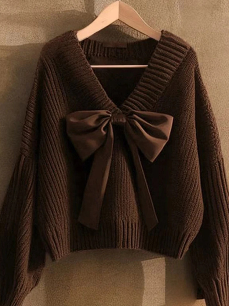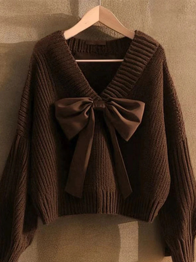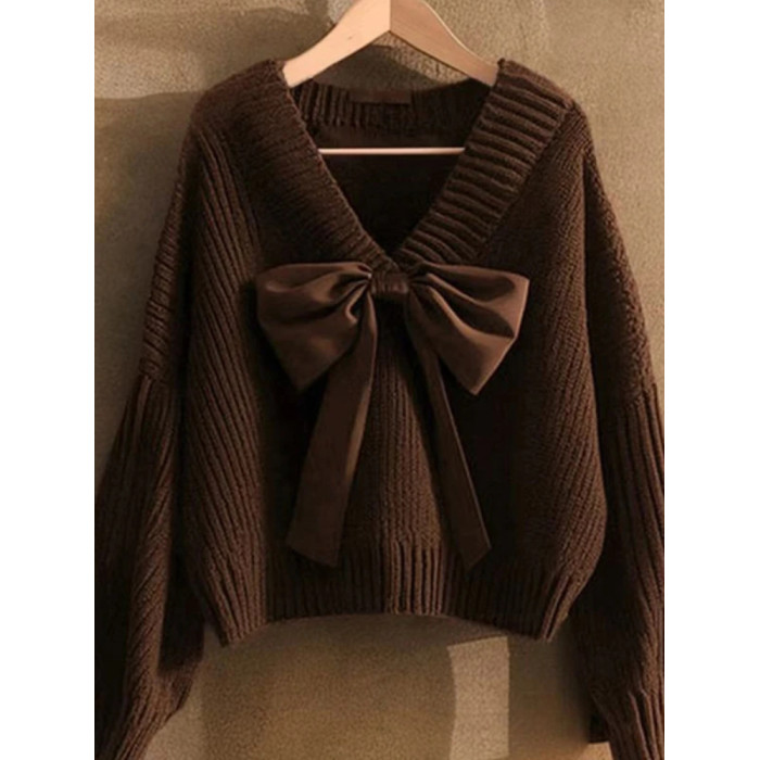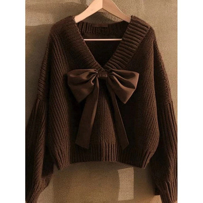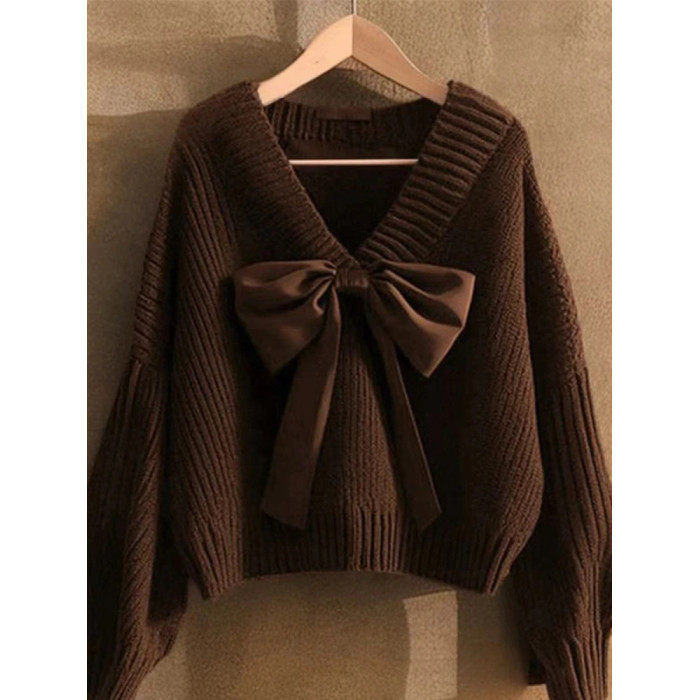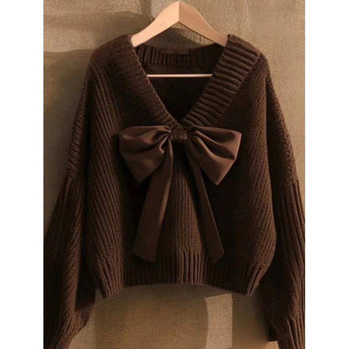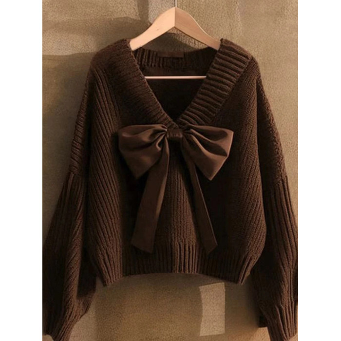 咖色v領蝴蝶結坑條套頭毛衣女秋季歐貨高級感寬松慵懶針織衫上衣
