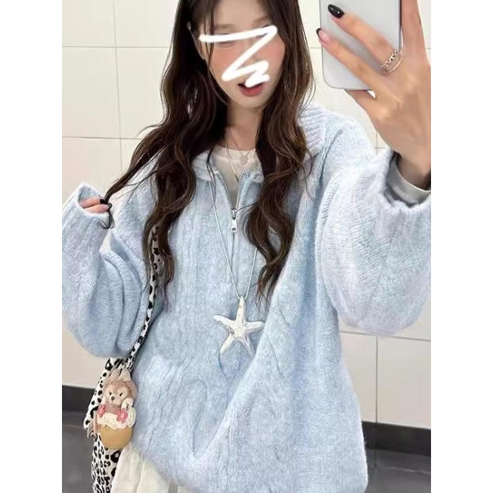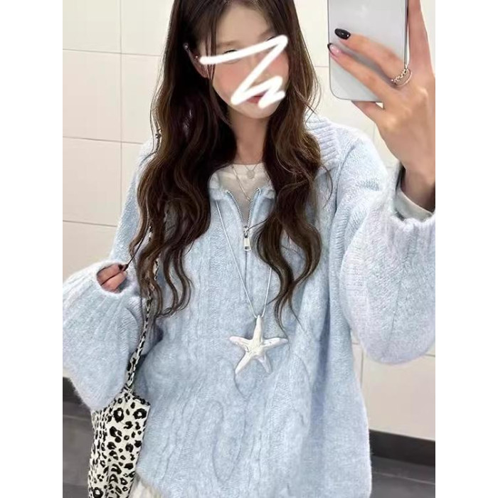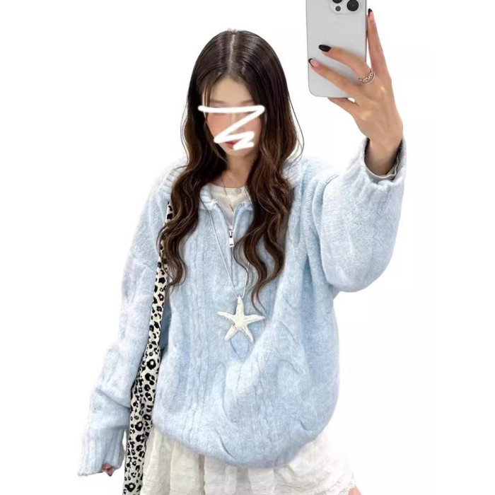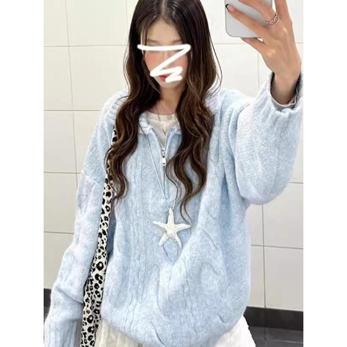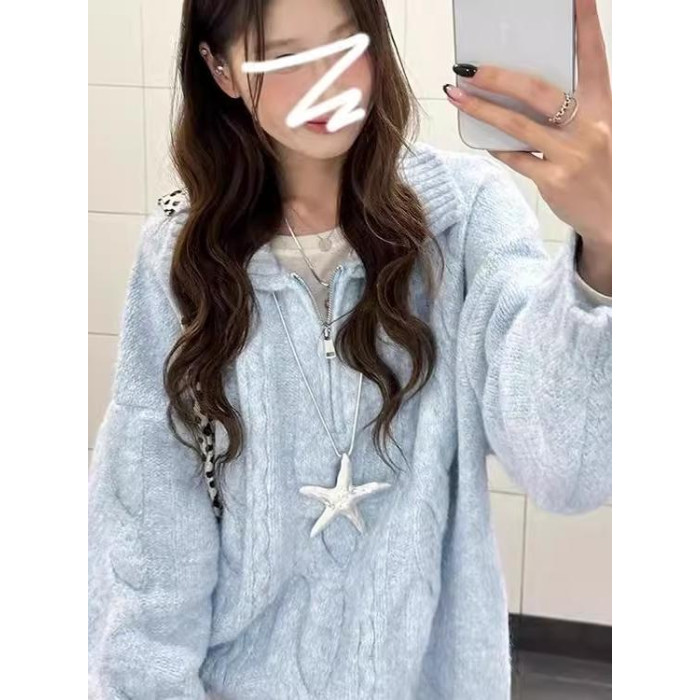 藍色麻花翻領毛衣2024新款奶fufu慵懶風韓系秋冬季穿搭針織上衣