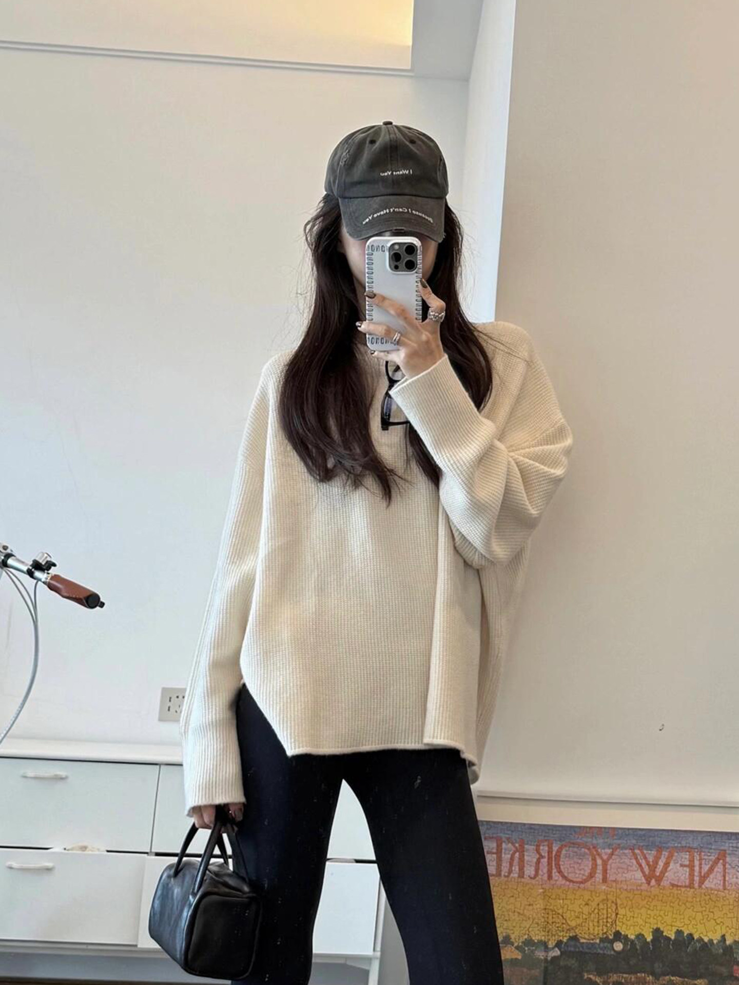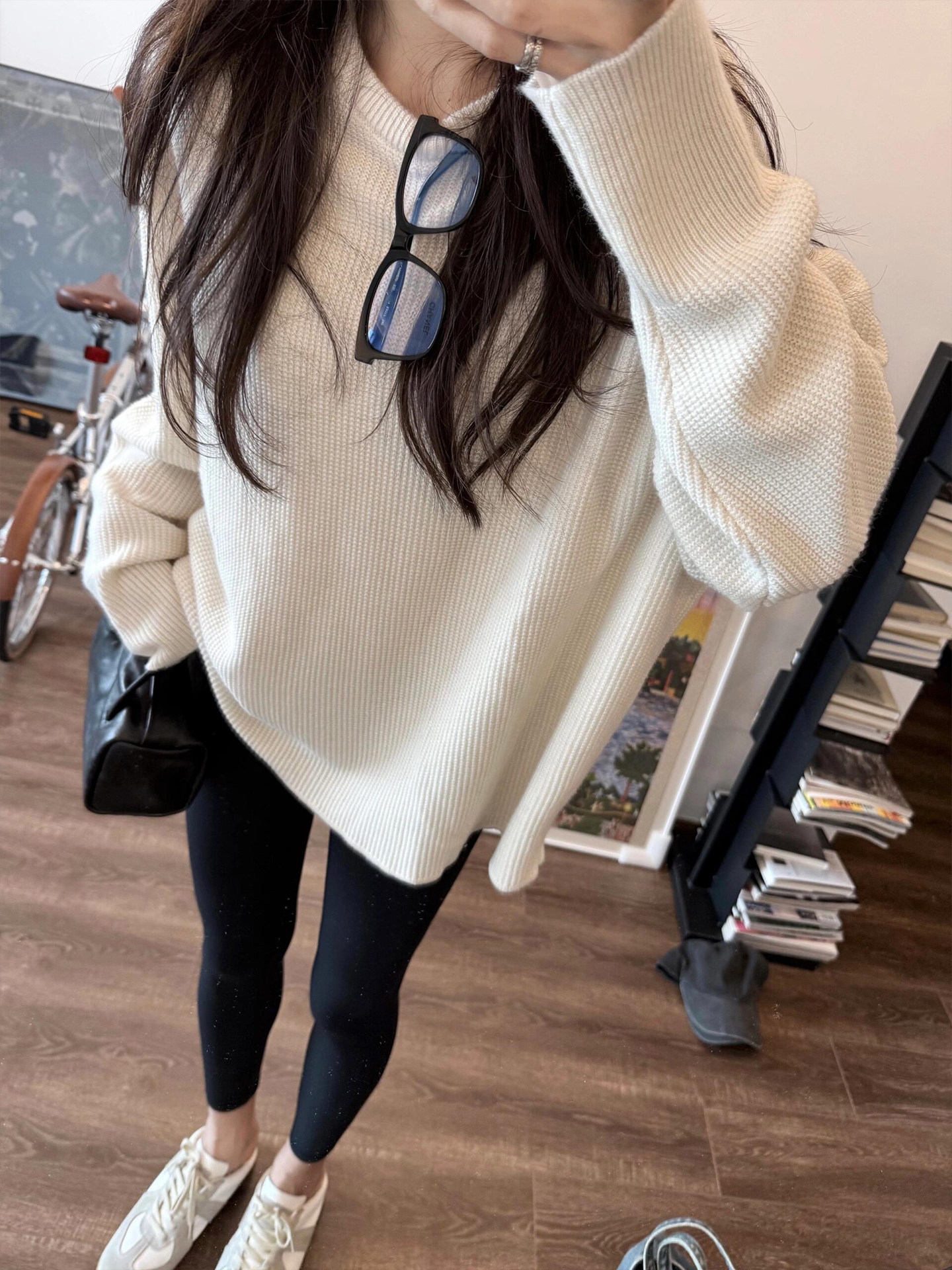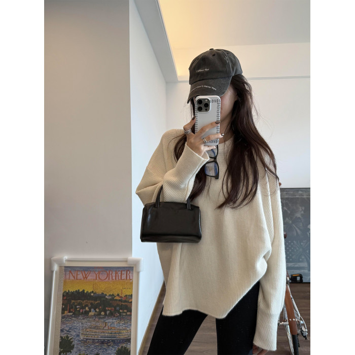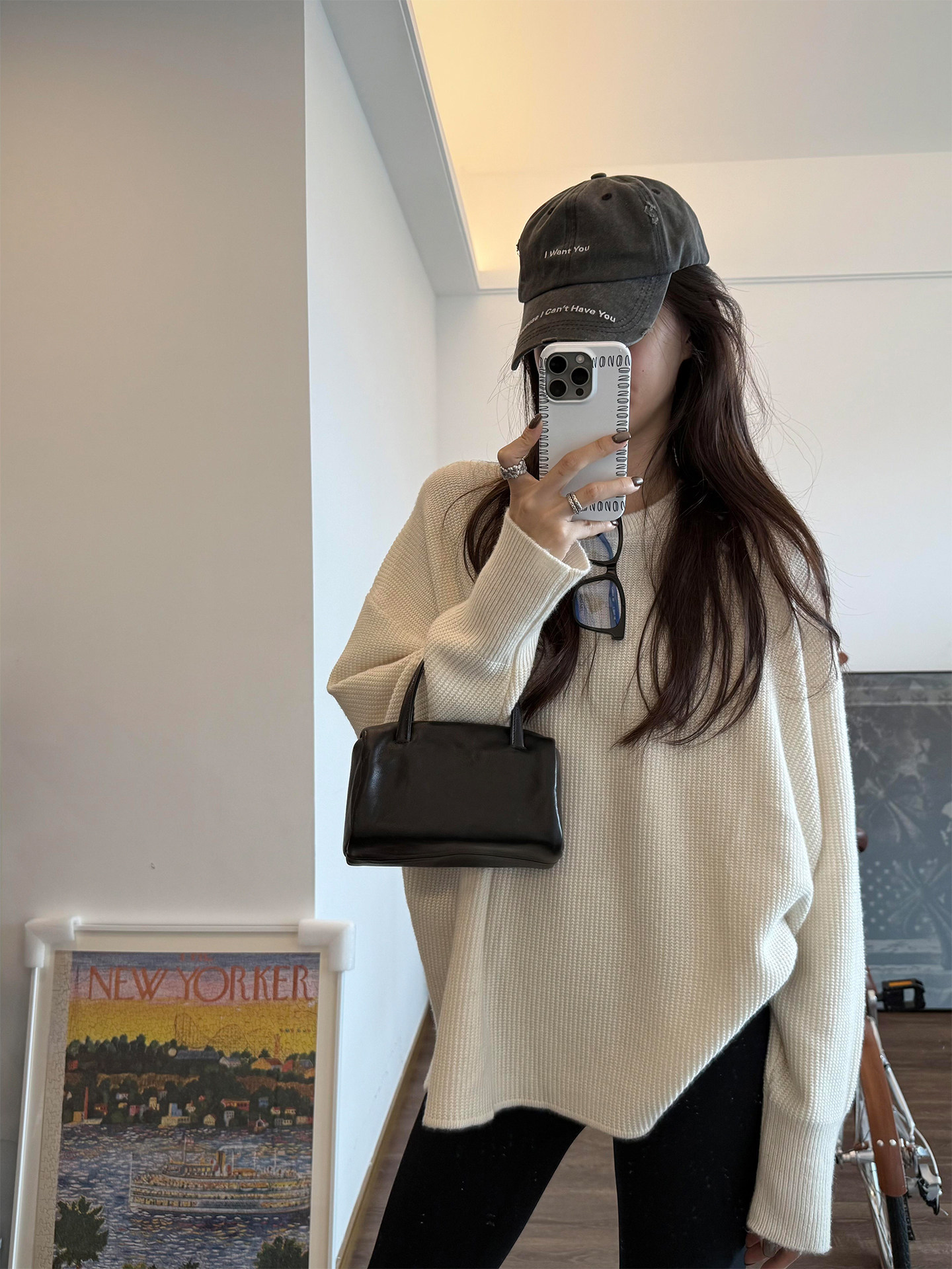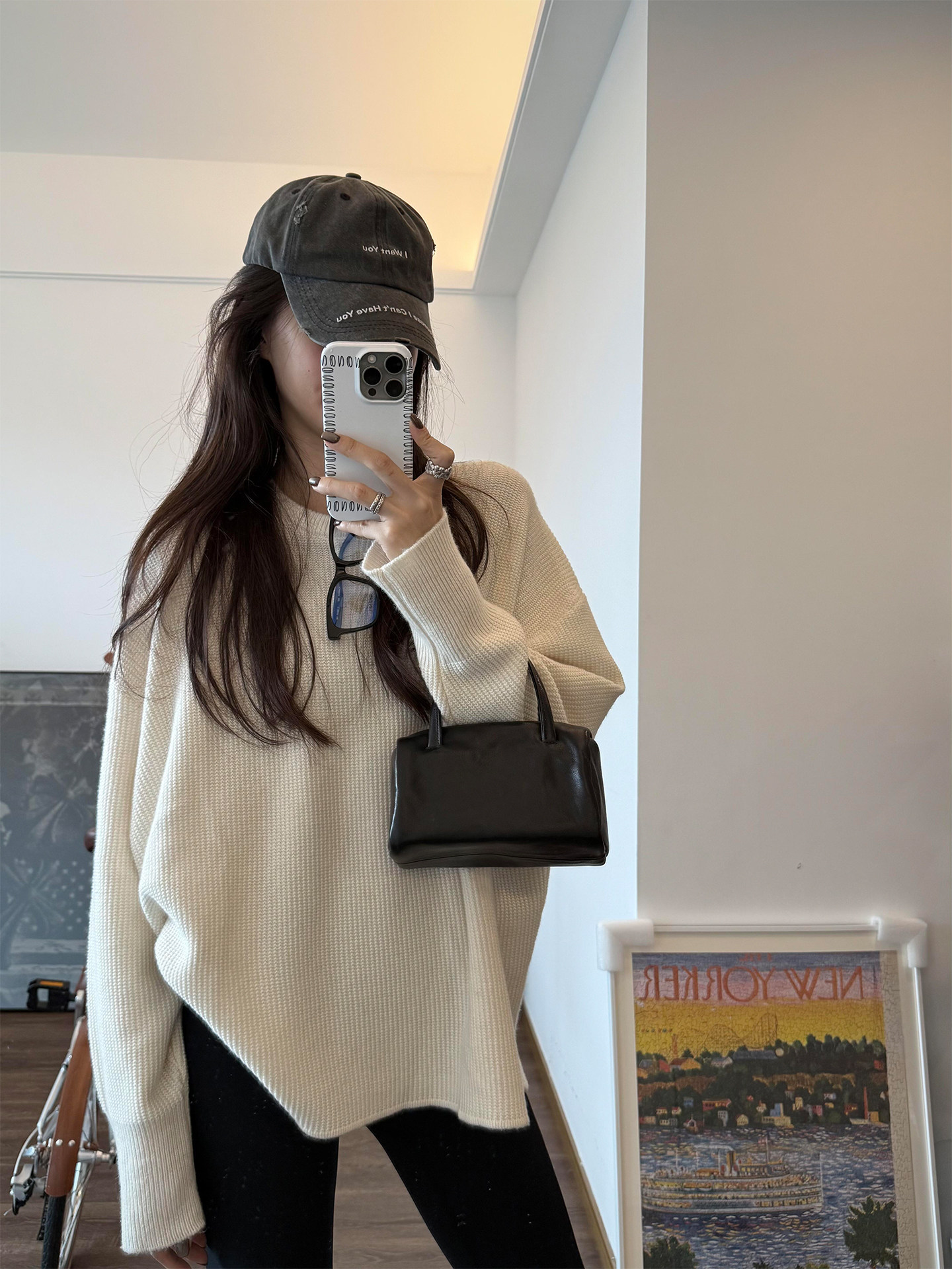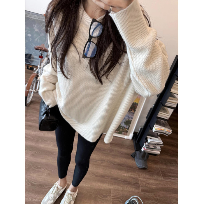 韓系慵懶風白色圓領毛衣女秋冬新款小個子寬松顯瘦套頭針織衫上衣