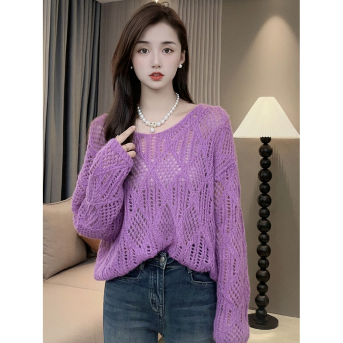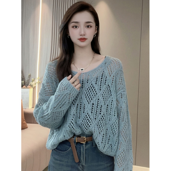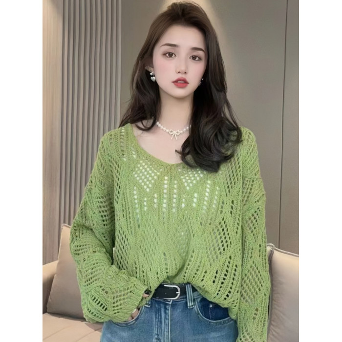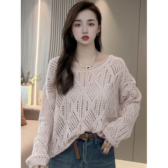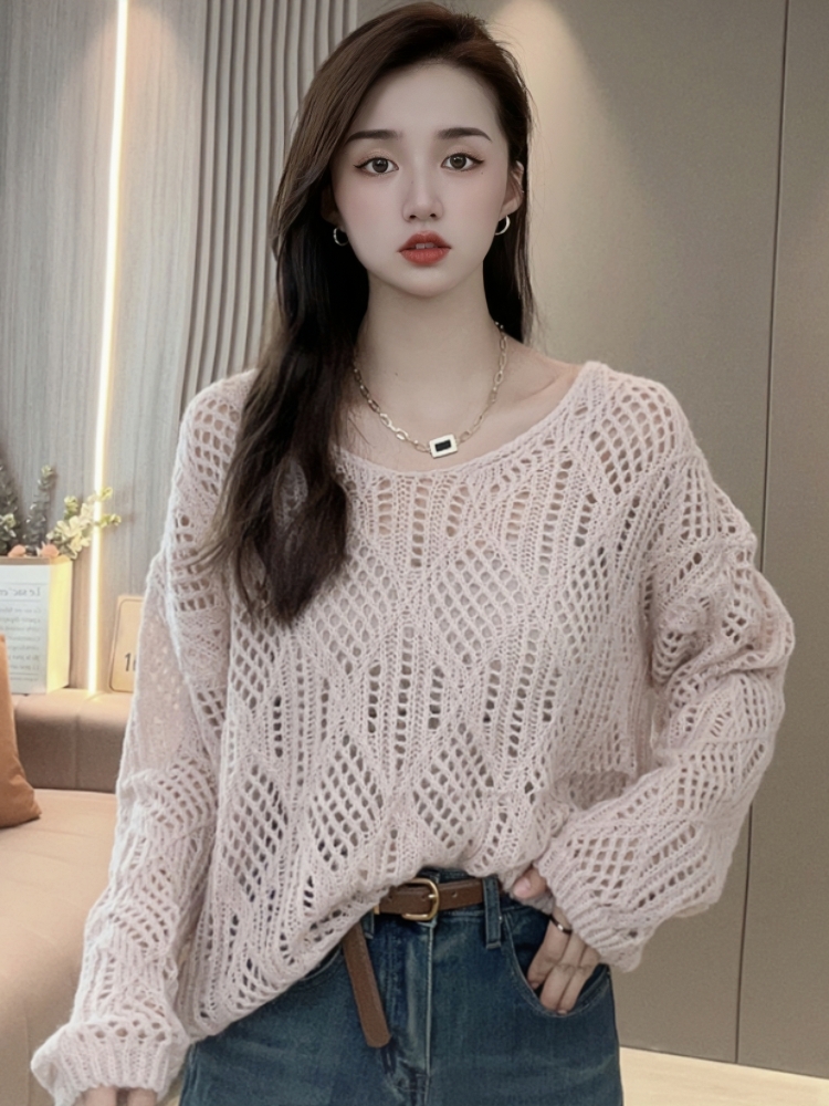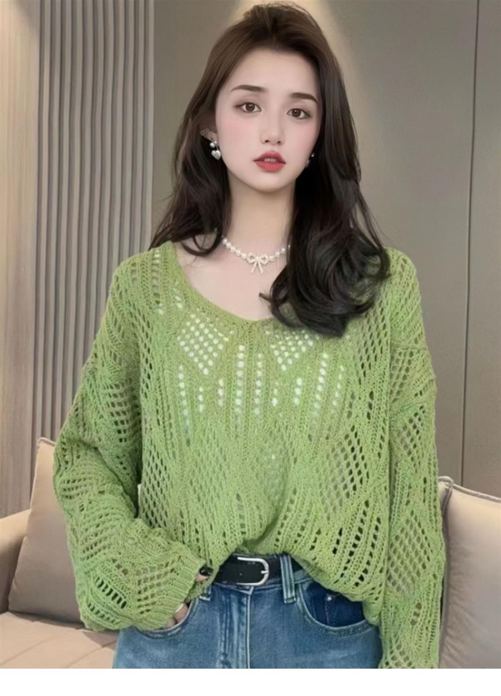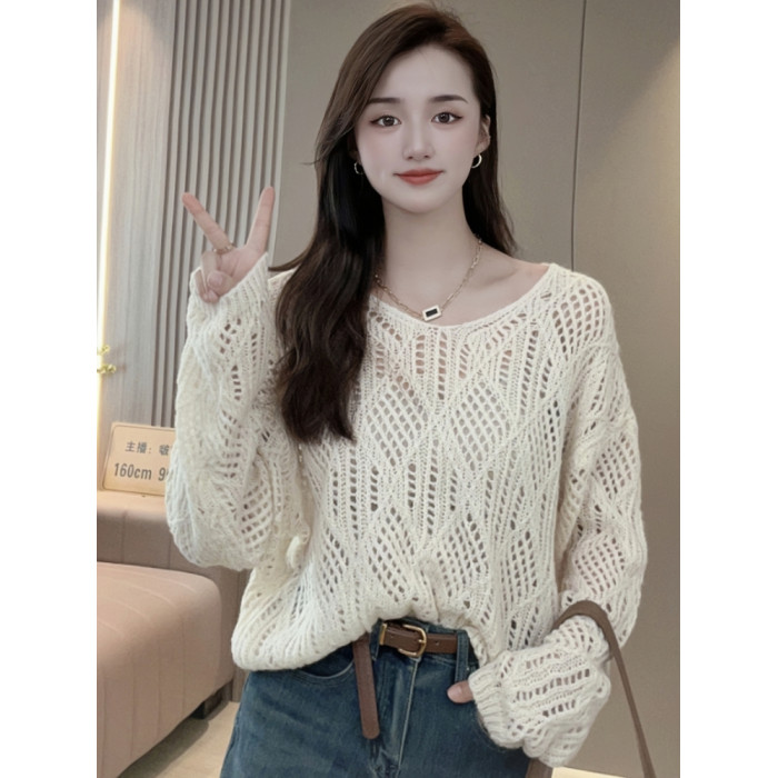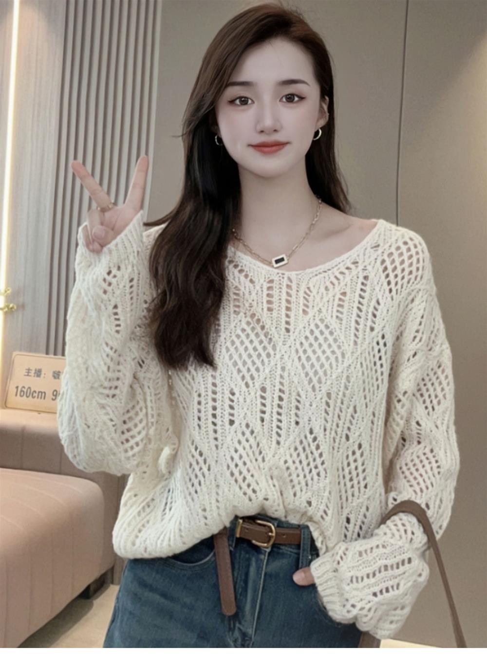 春秋季長袖薄款鏤空針織衫秋裝女2025新款寬松慵懶風V領針織上衣