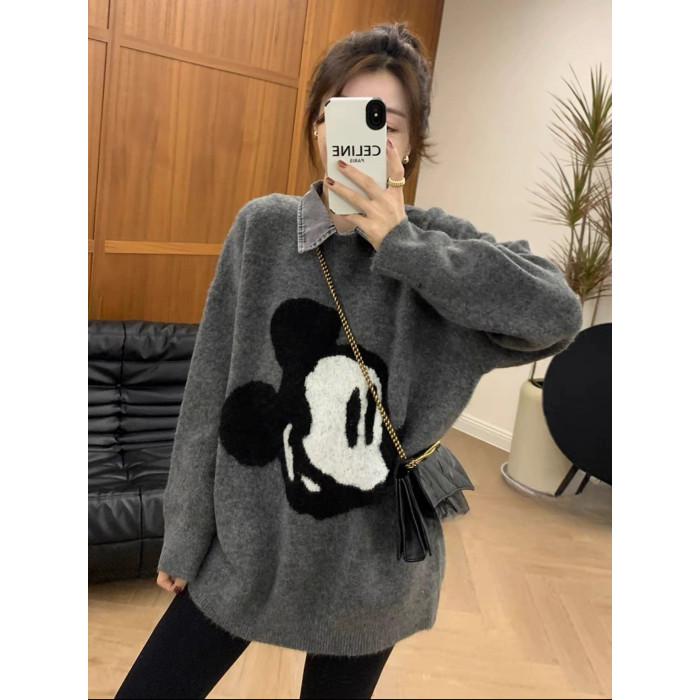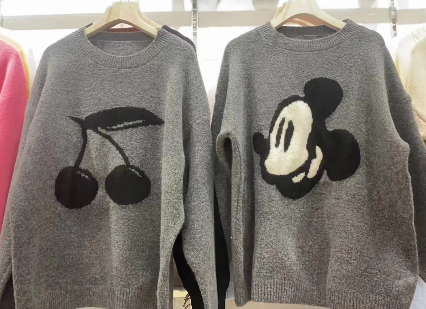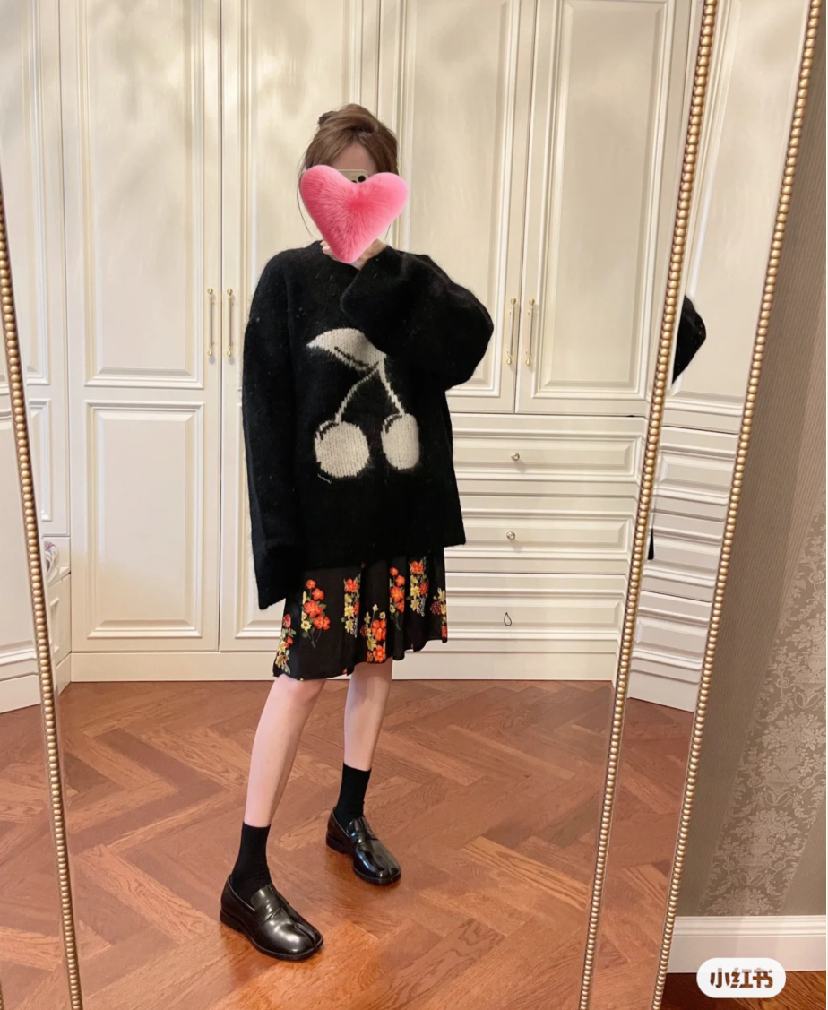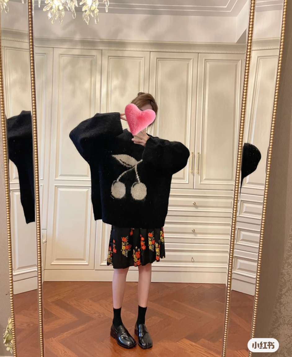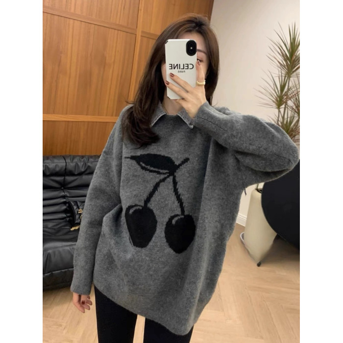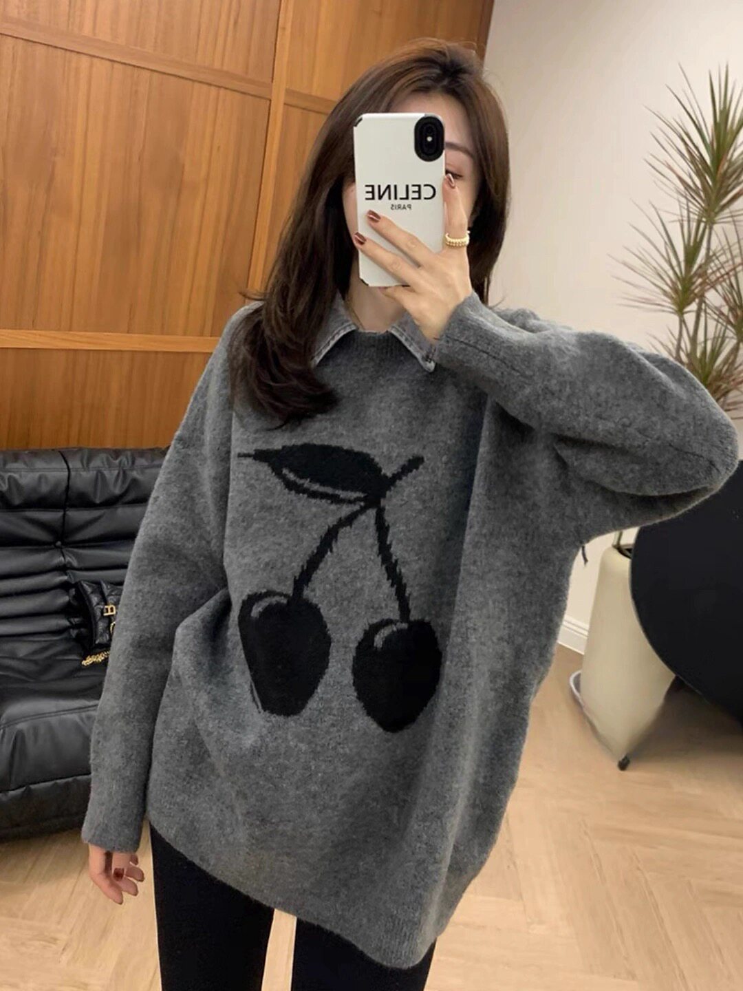氂牛絨灰色櫻桃刺綉假兩件毛衣女秋冬加厚慵懶風寬松針織歐貨上衣