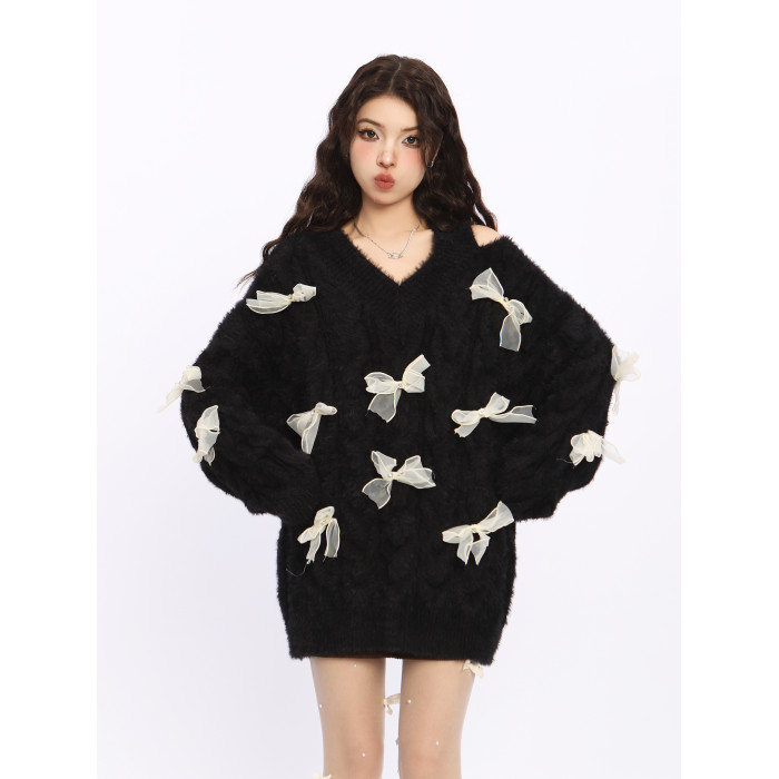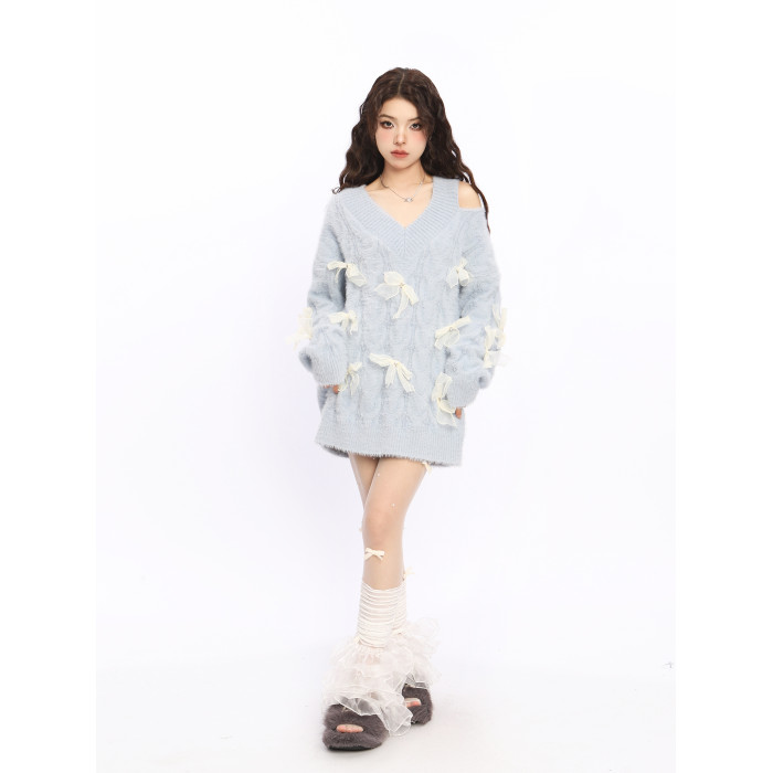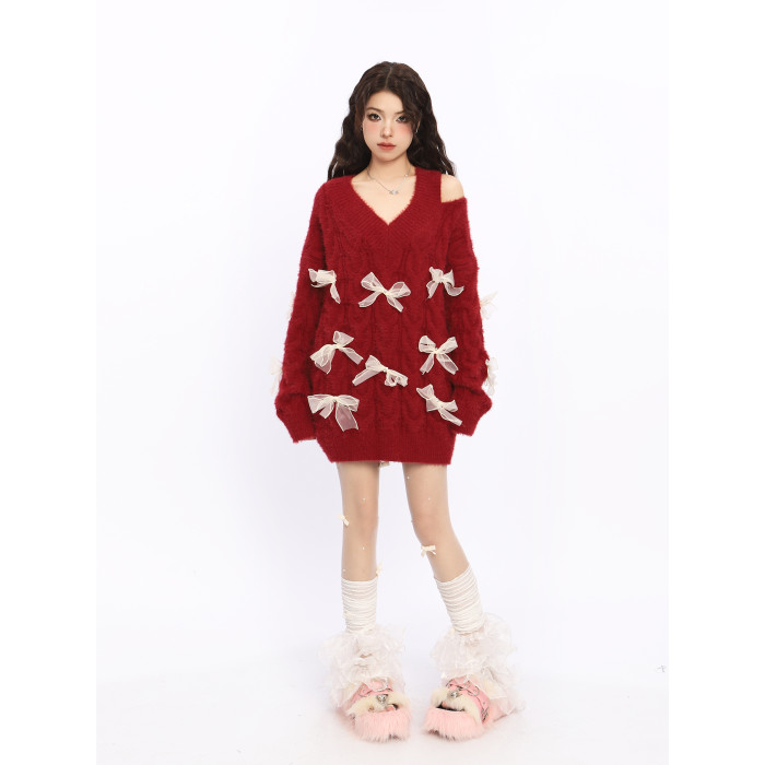 BIGGOLD露肩新年戰袍紅色蝴蝶結毛衣女秋冬設計感慵懶風針織衫潮