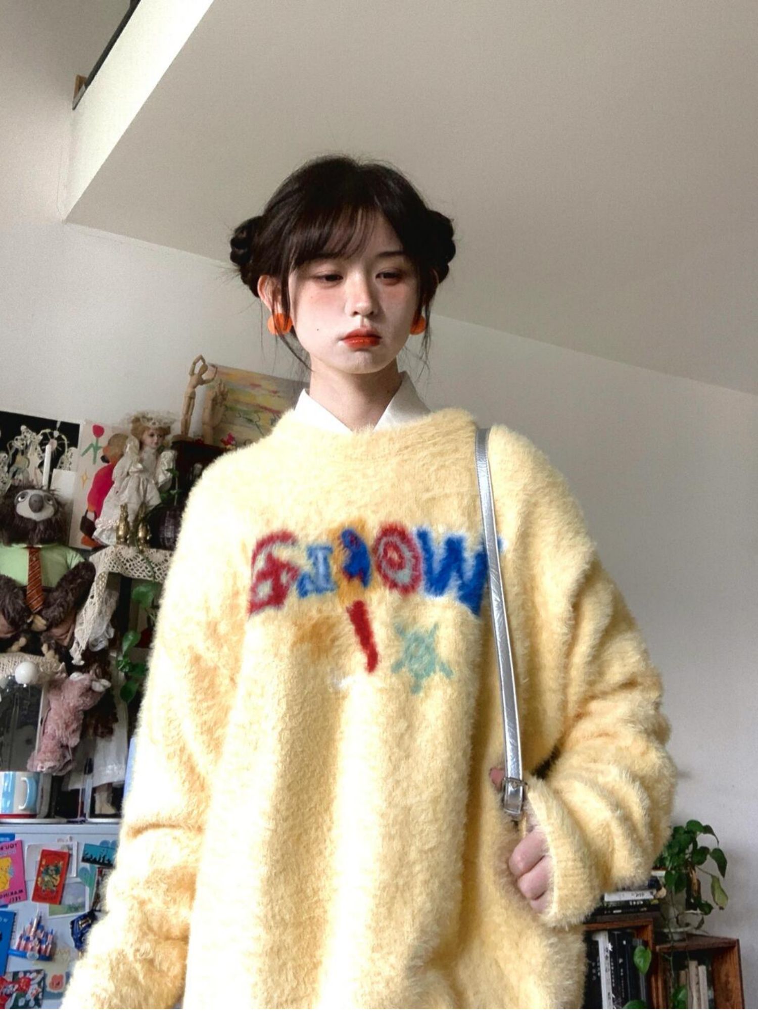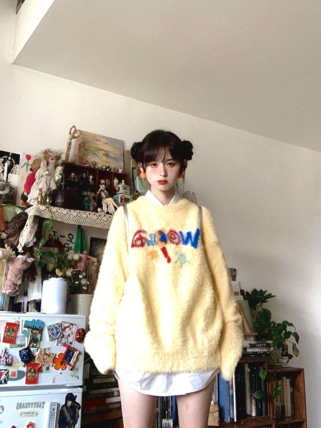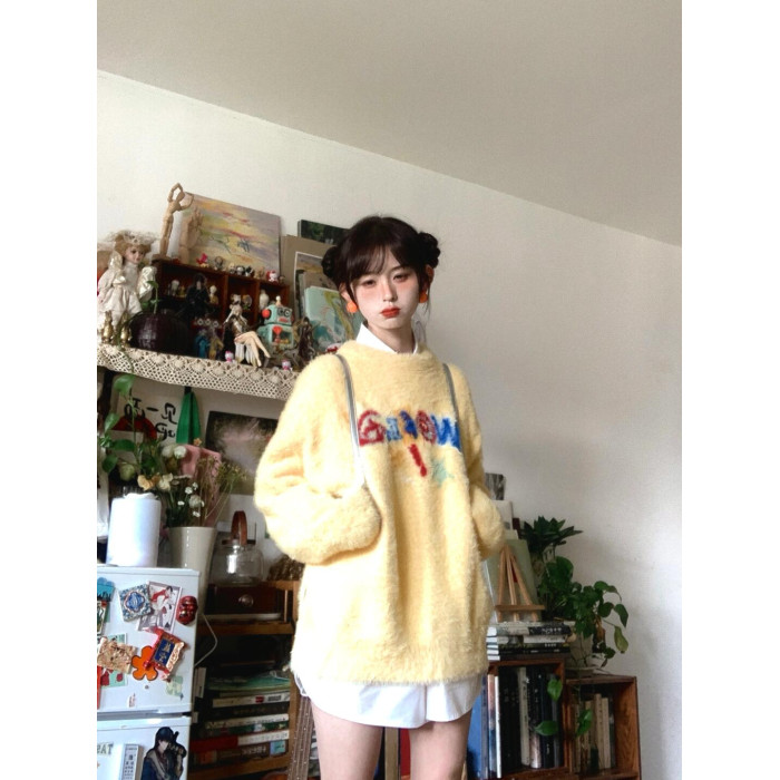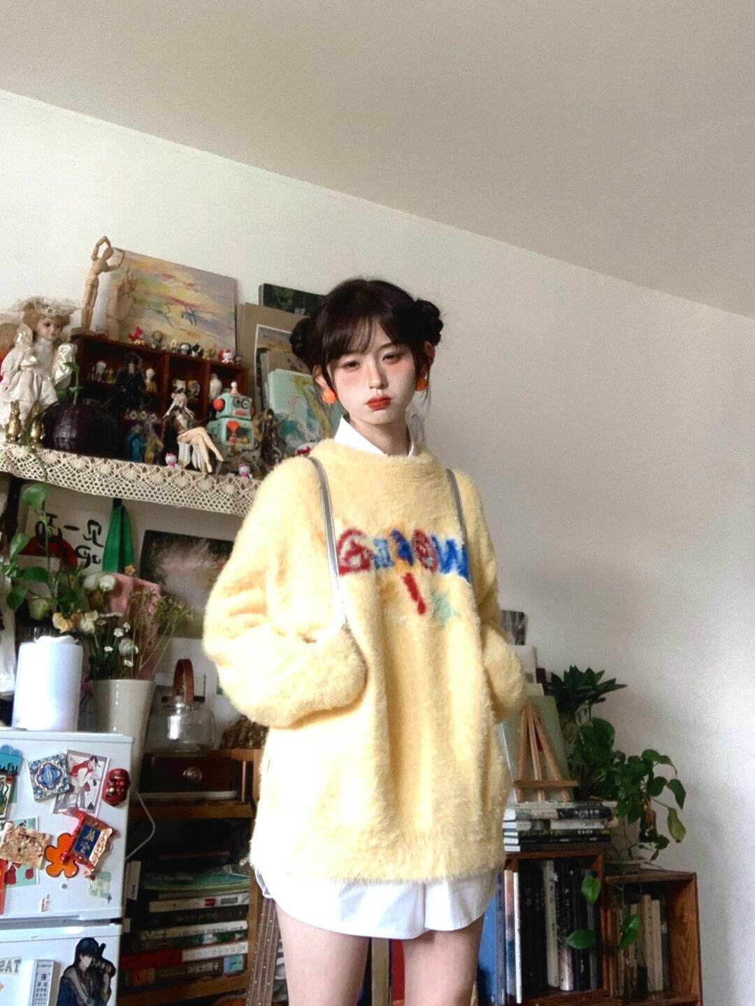 慵懶彩虹字母軟糯水貂絨毛衣女秋冬多巴胺加厚套頭針織衫外穿上衣