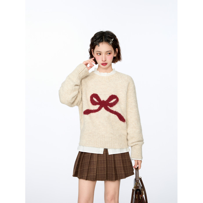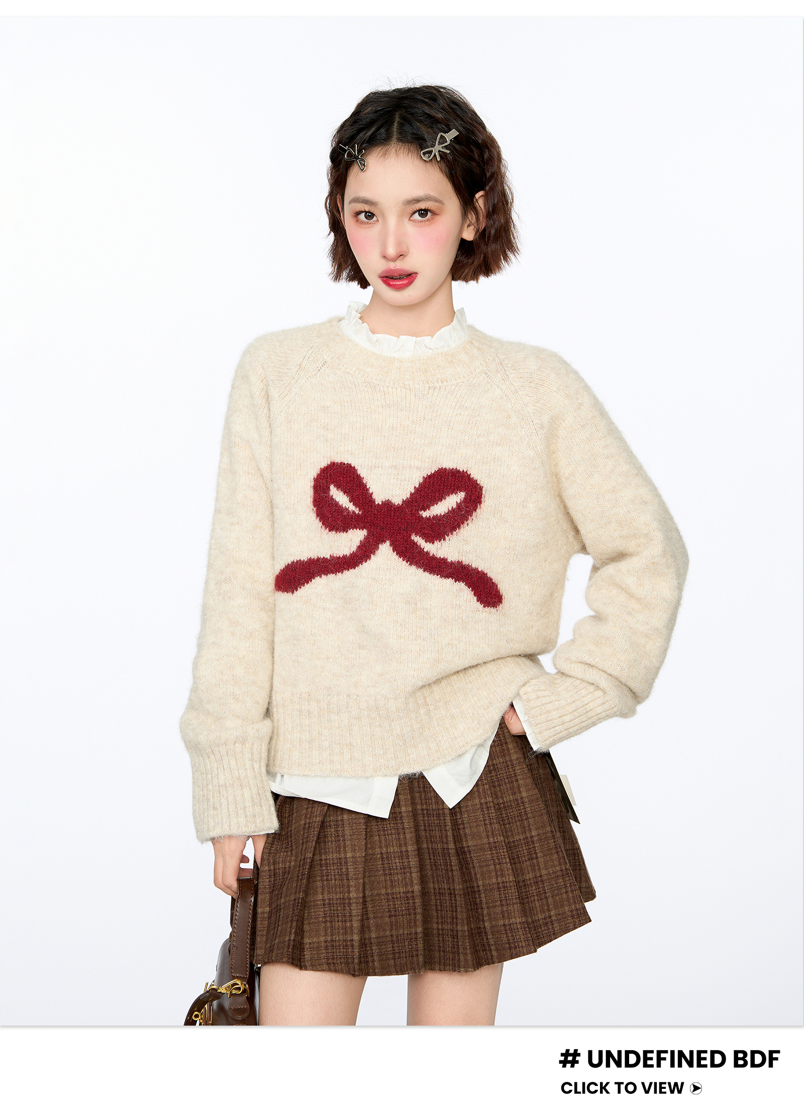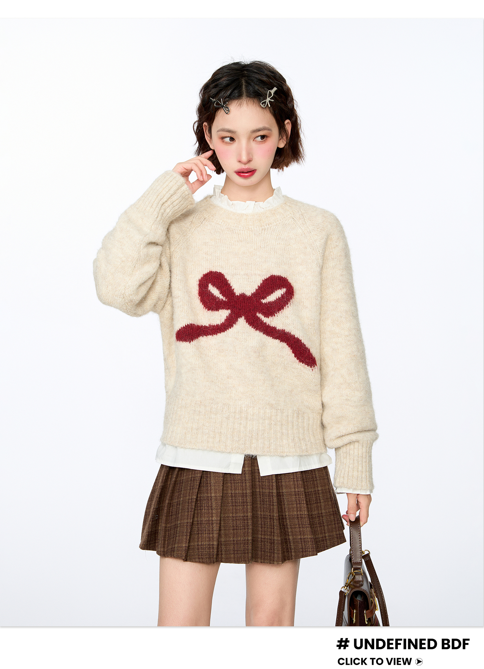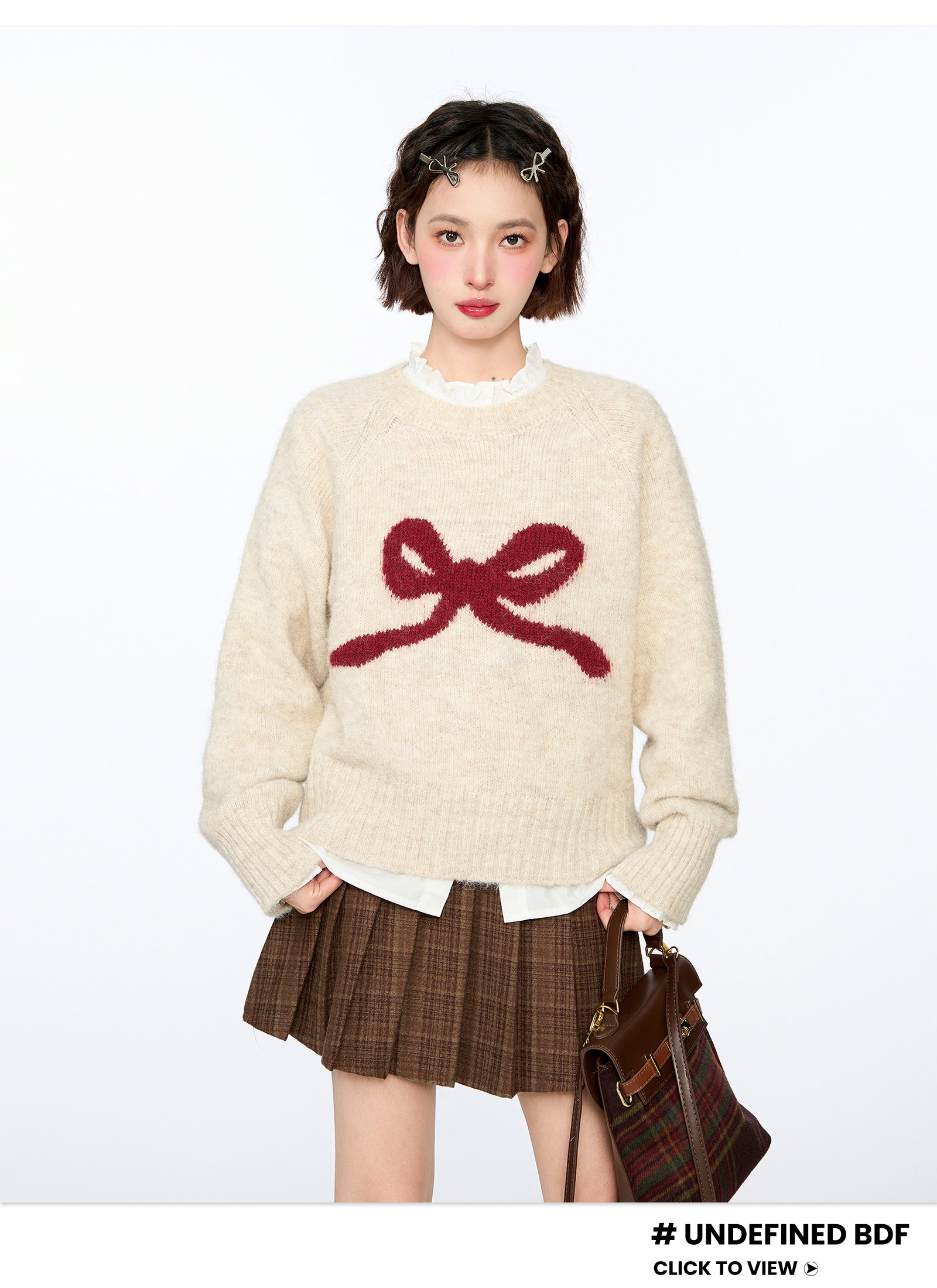 蝴蝶結圓領套頭針織毛衣女秋冬春秋季寬松慵懶風加厚外穿內搭上衣