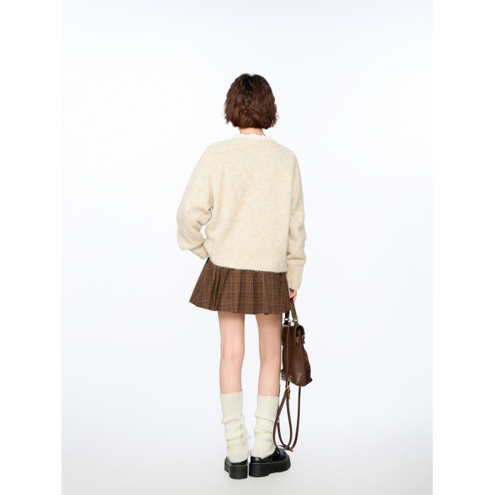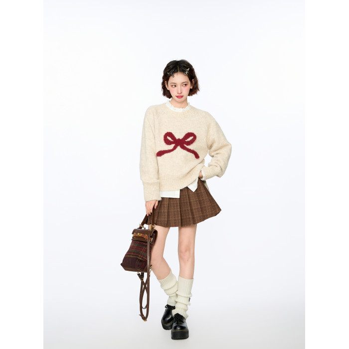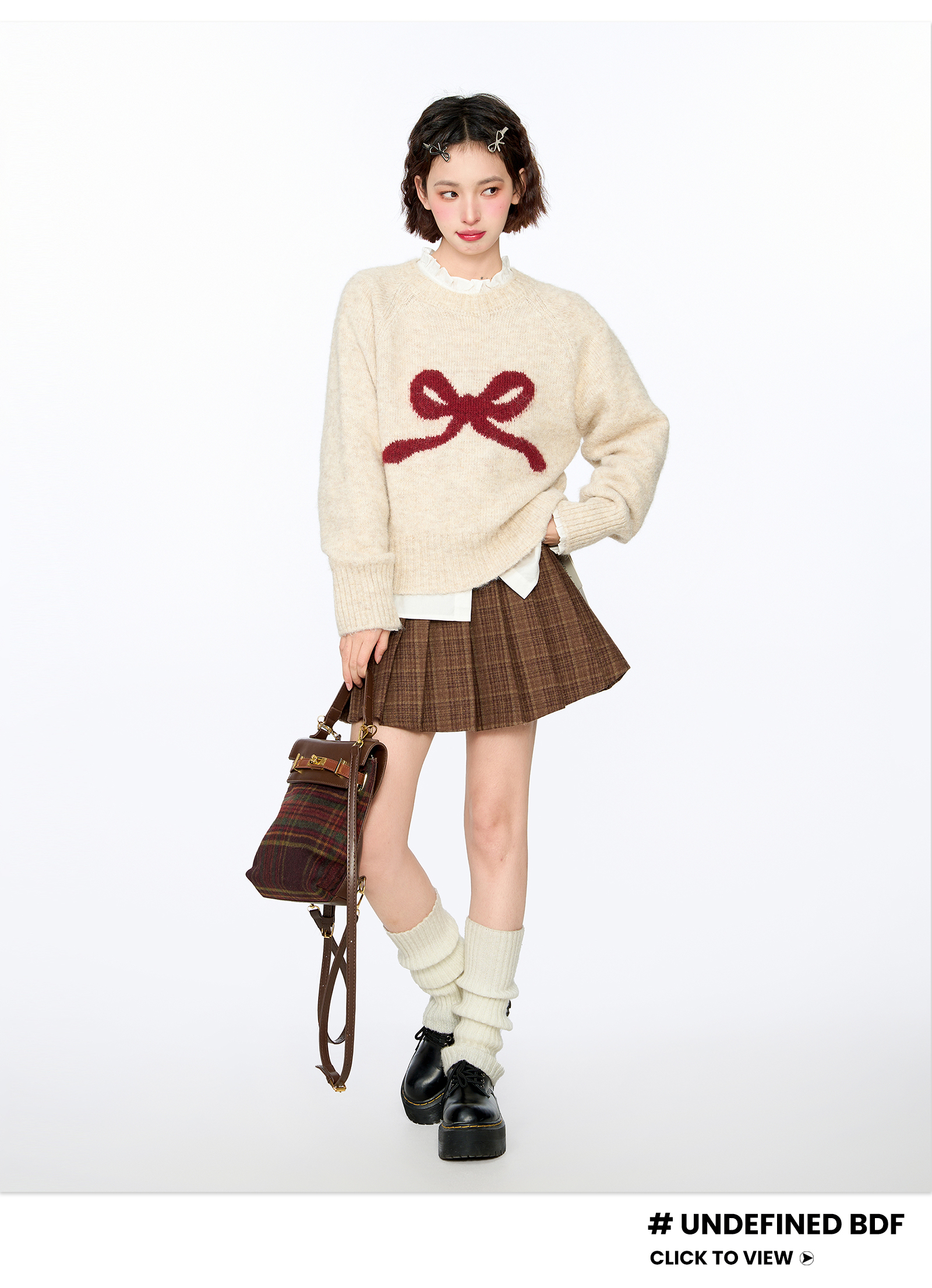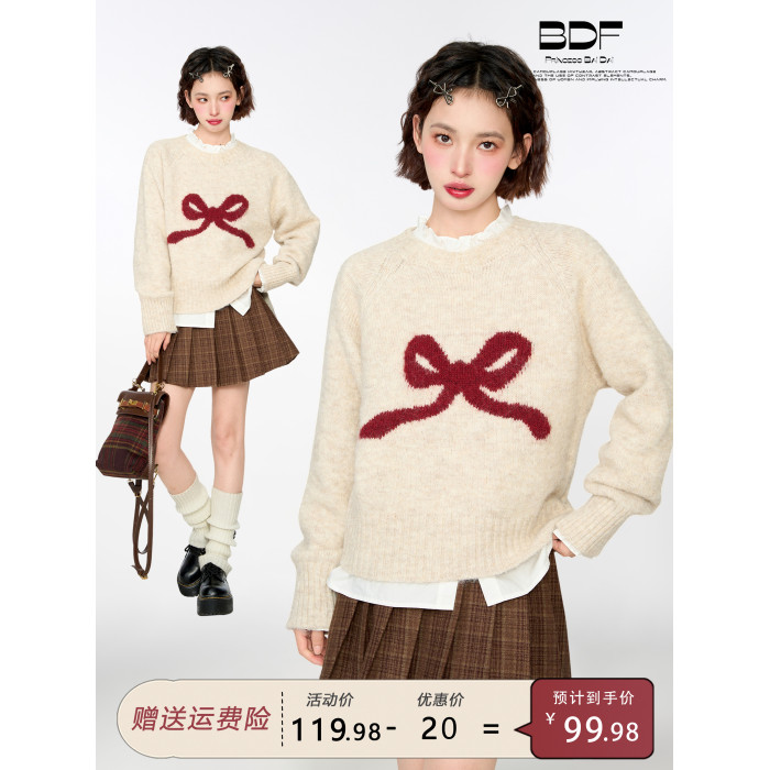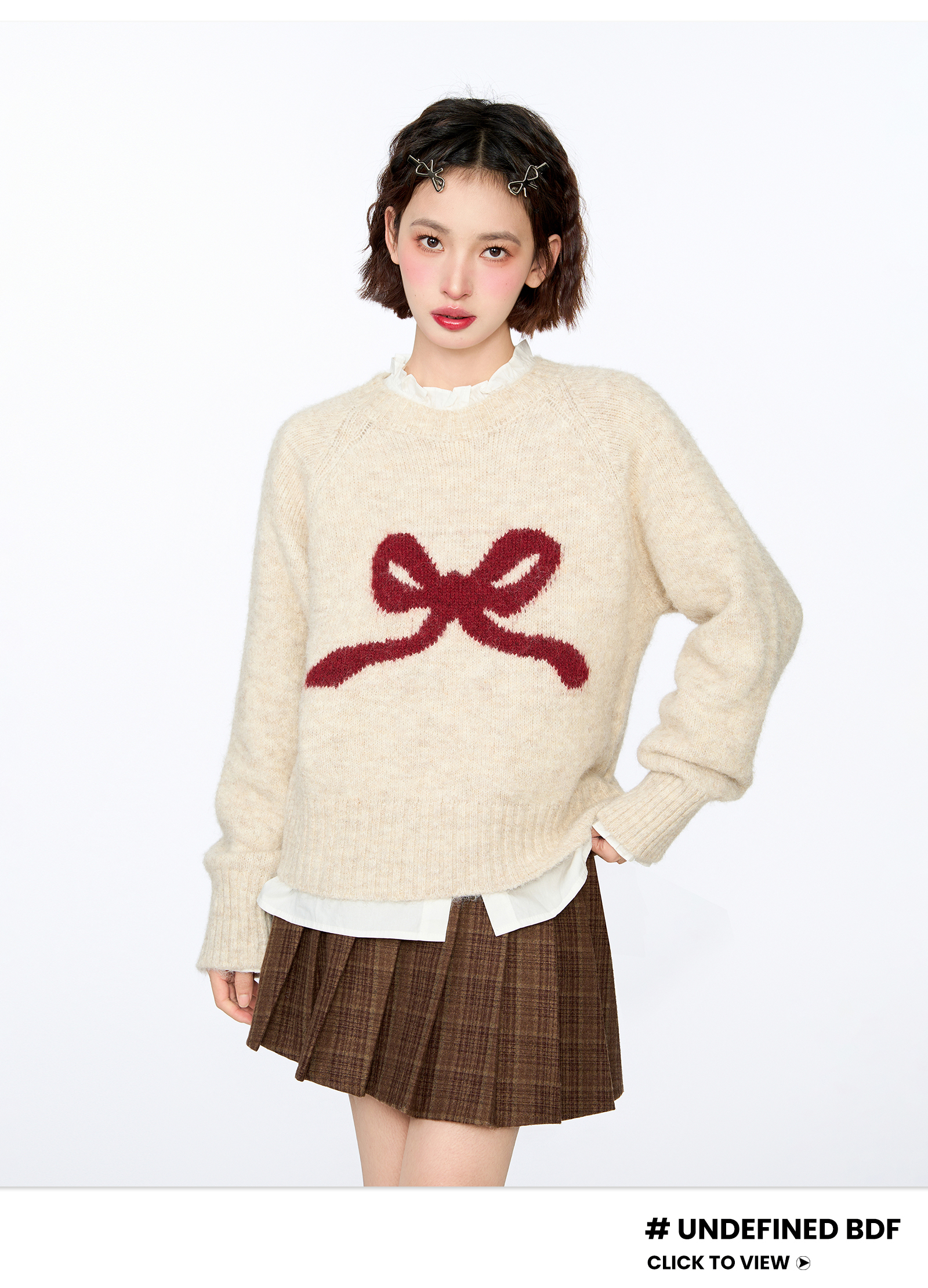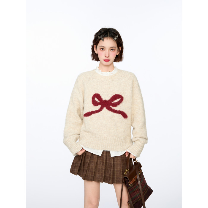 蝴蝶結圓領套頭針織毛衣女秋冬春秋季寬松慵懶風加厚外穿內搭上衣