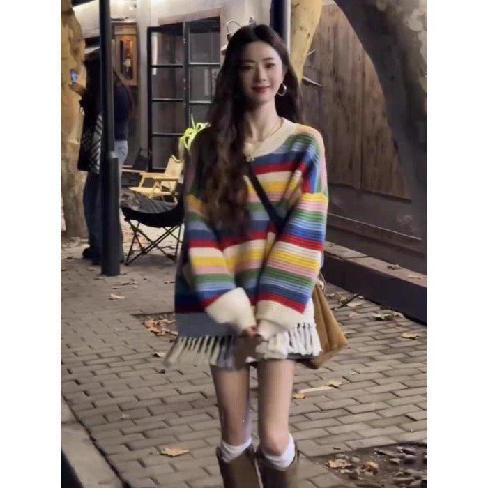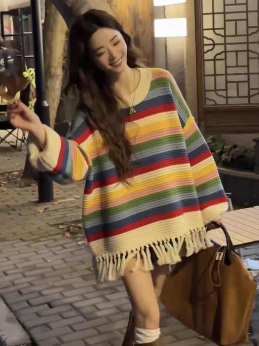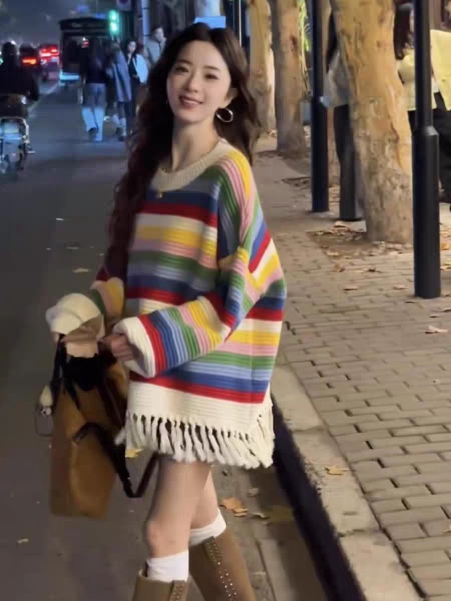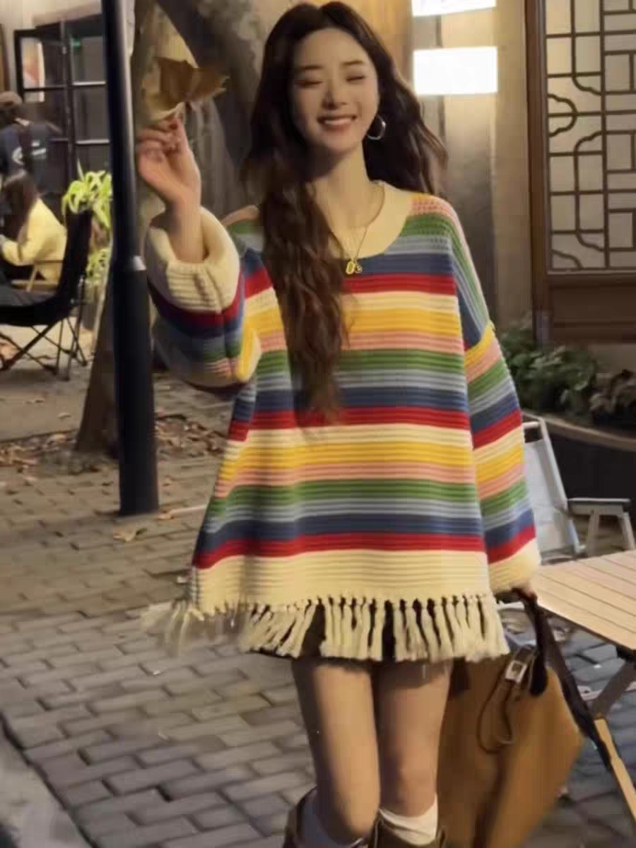 流蘇彩虹條紋高級設計感多巴胺穿搭針織毛衣女秋冬韓系慵懶風上衣