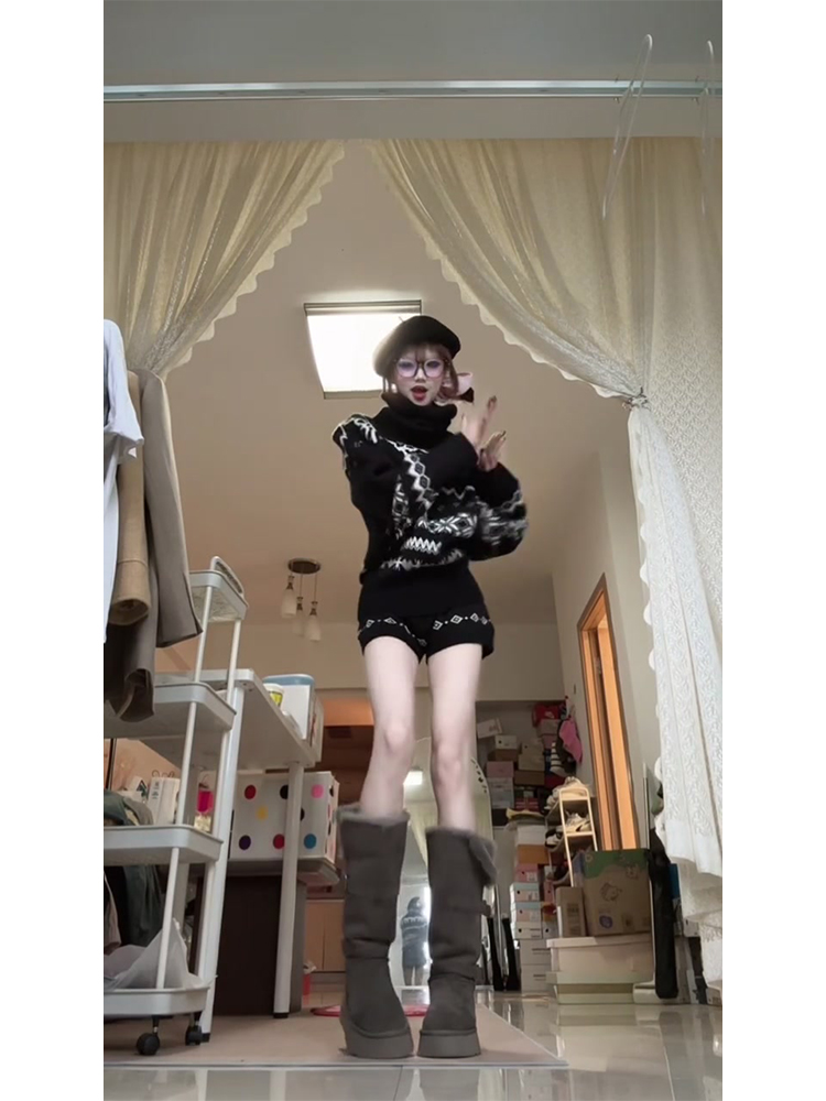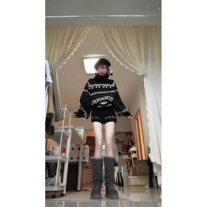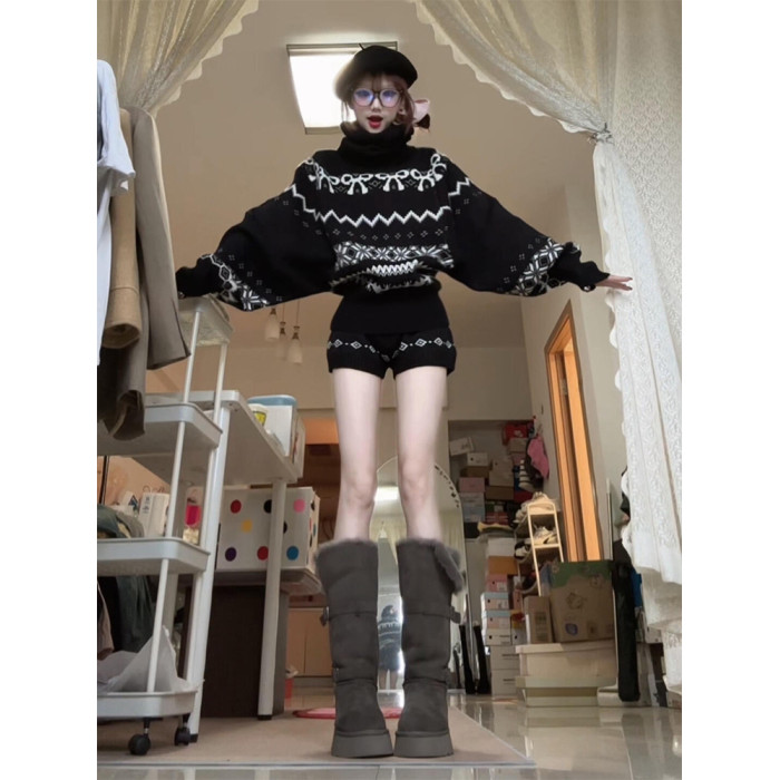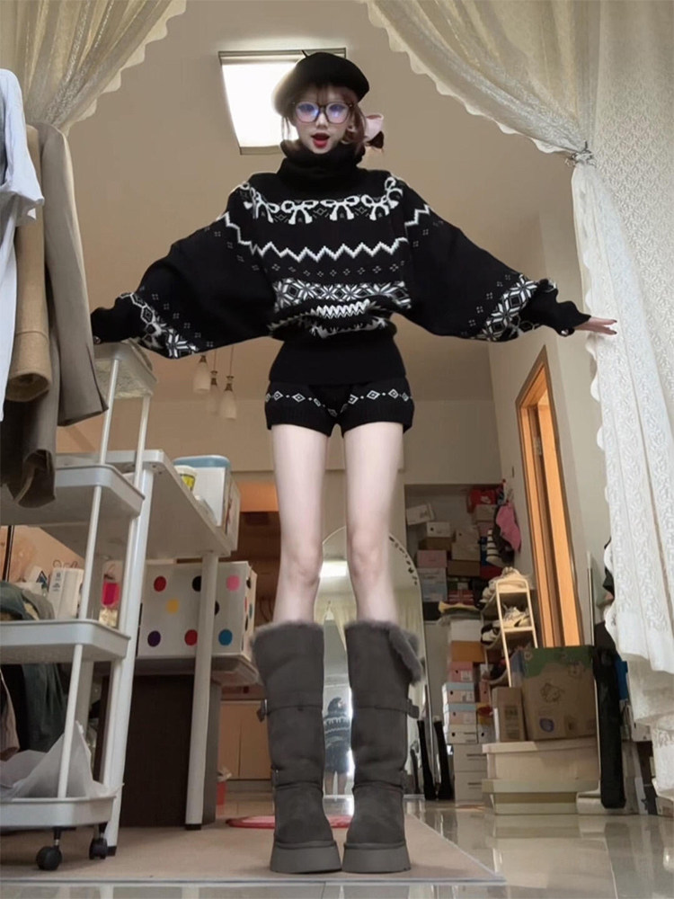 美式復古黑色費爾島蝴蝶結高領毛衣針織衫女2025秋冬新款保暖上衣