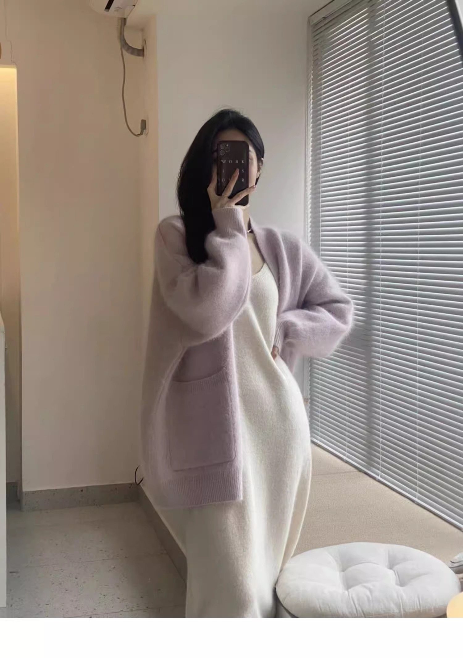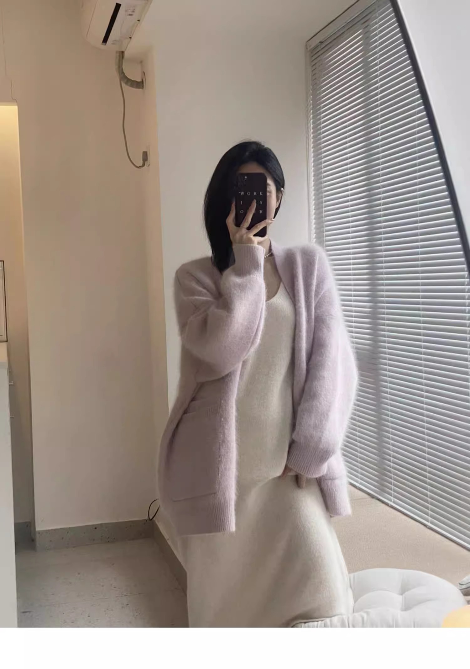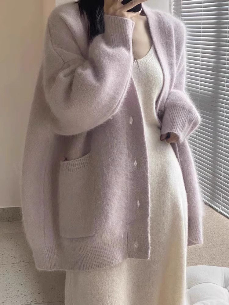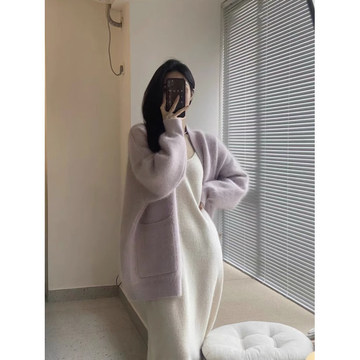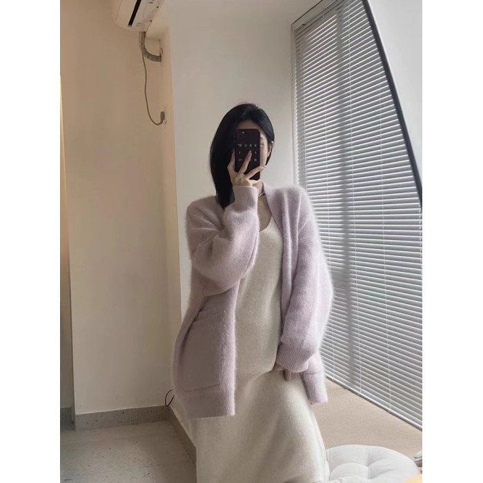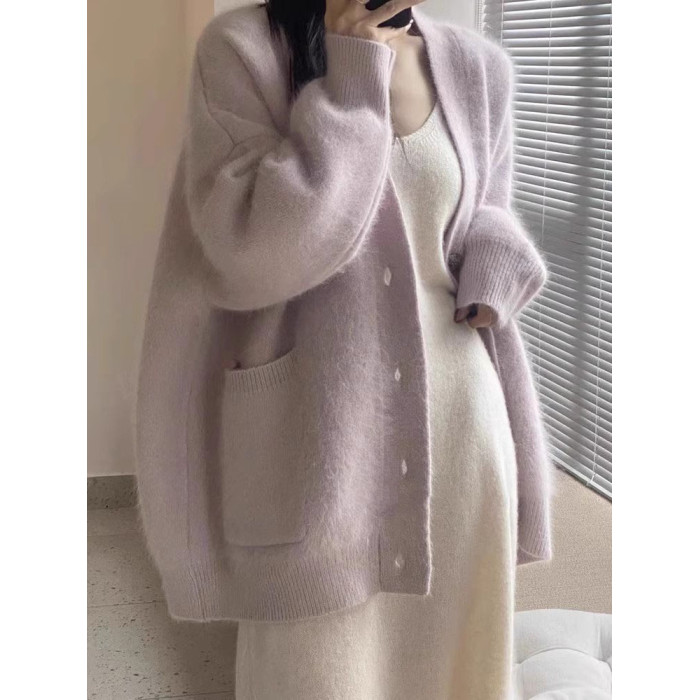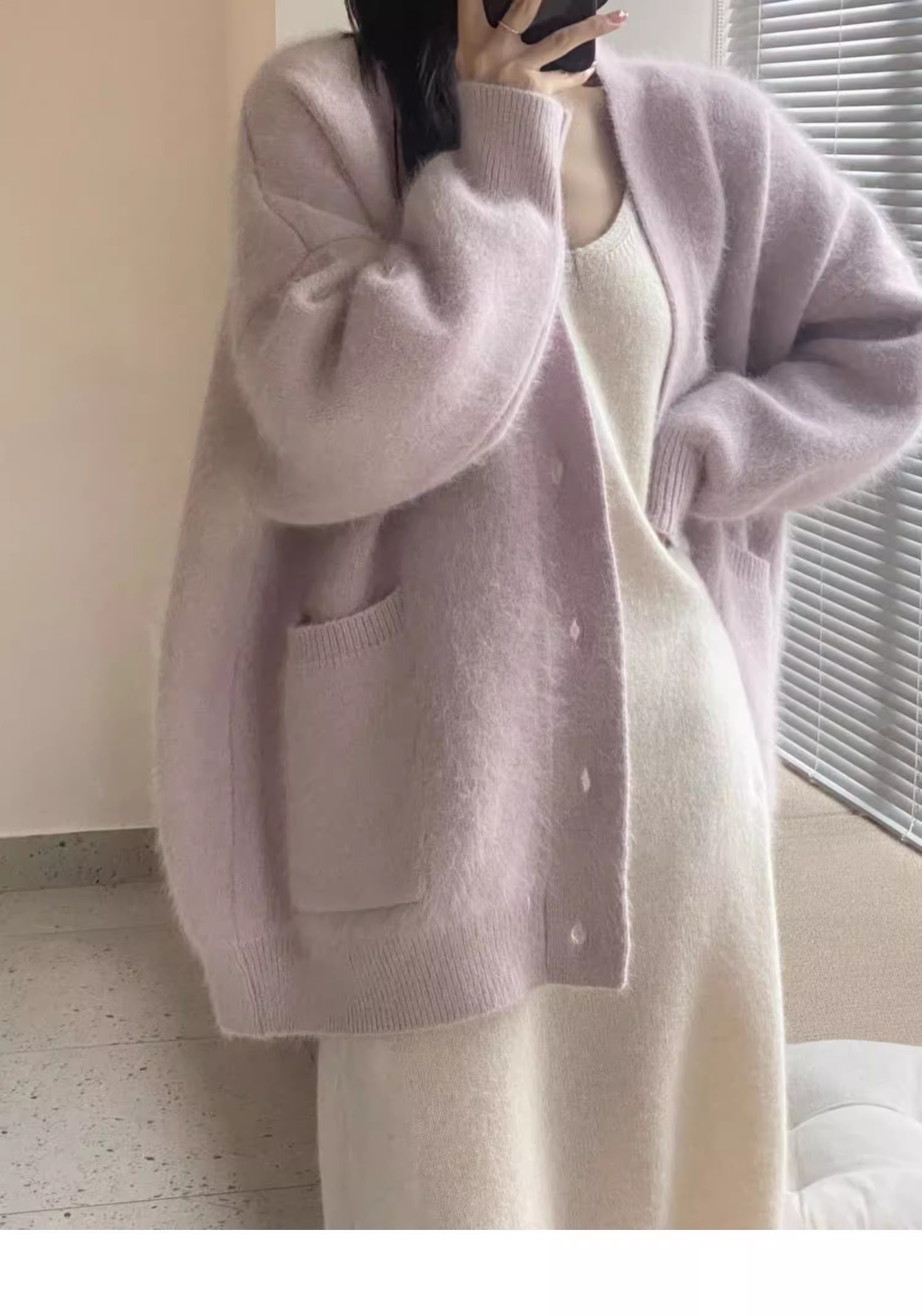 紫色V領水貂絨毛衣女2025秋冬新款高級感寬松慵懶風軟糯針織開衫