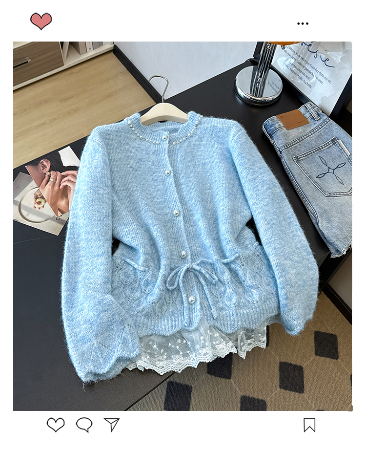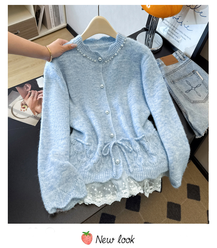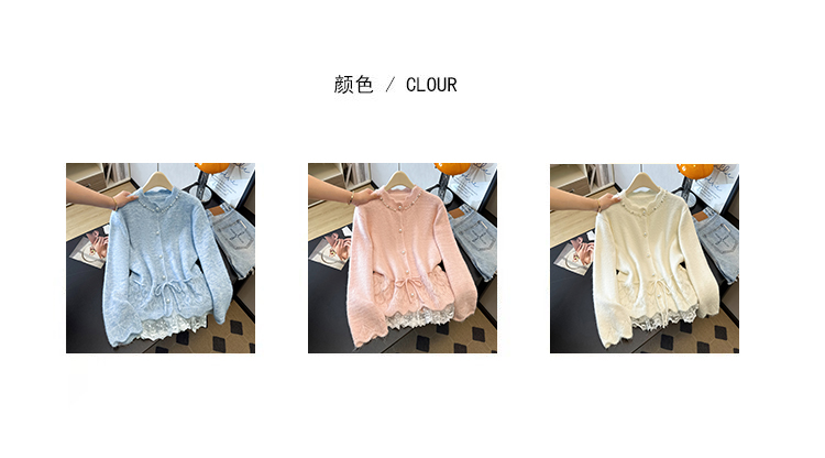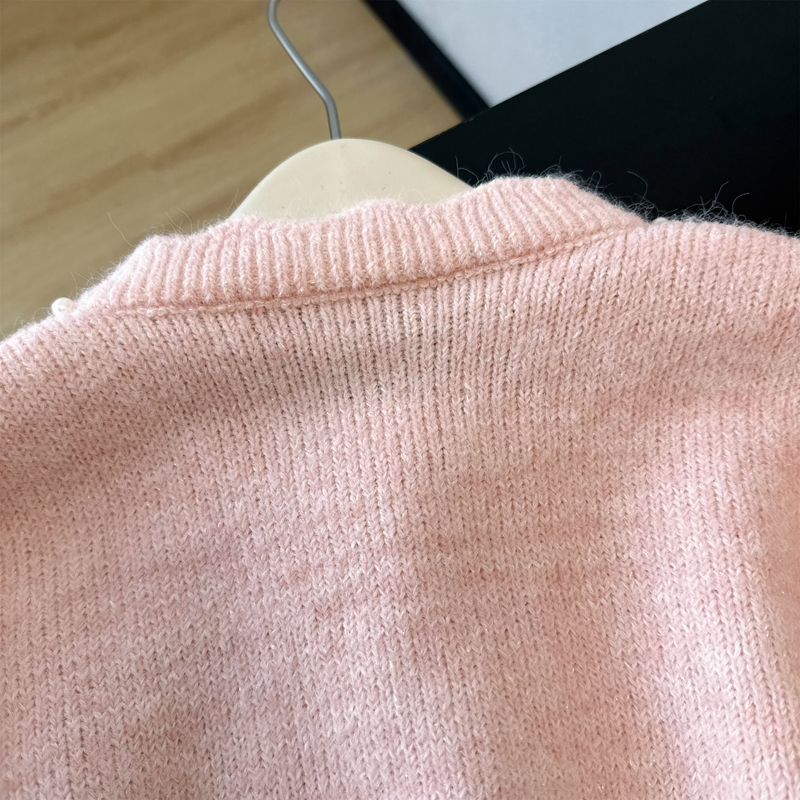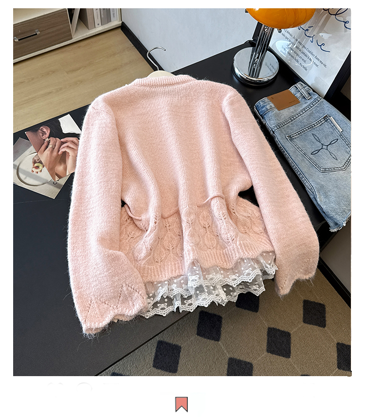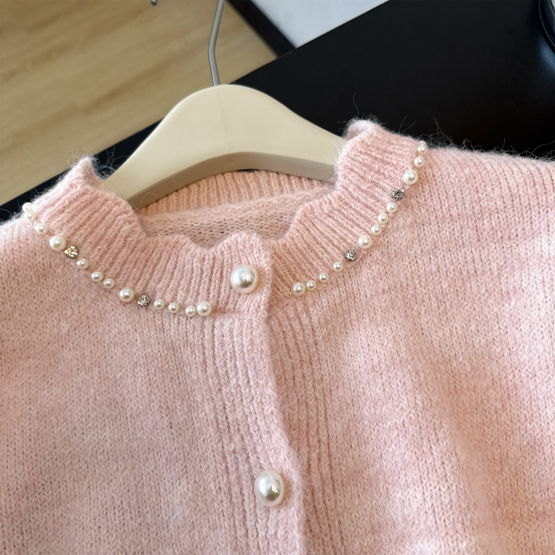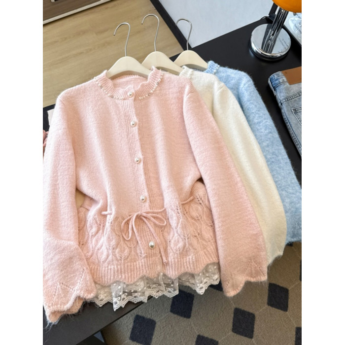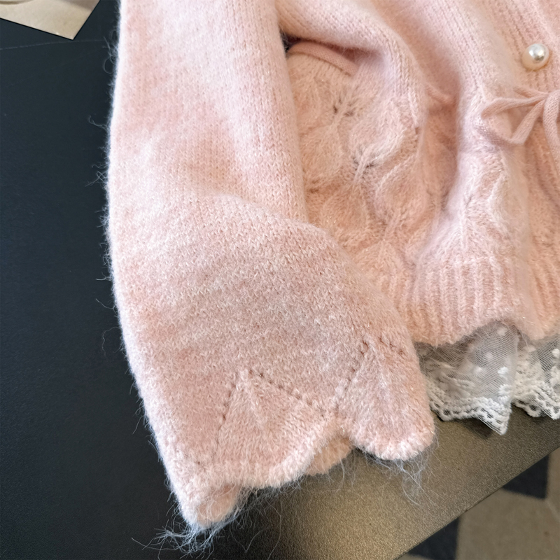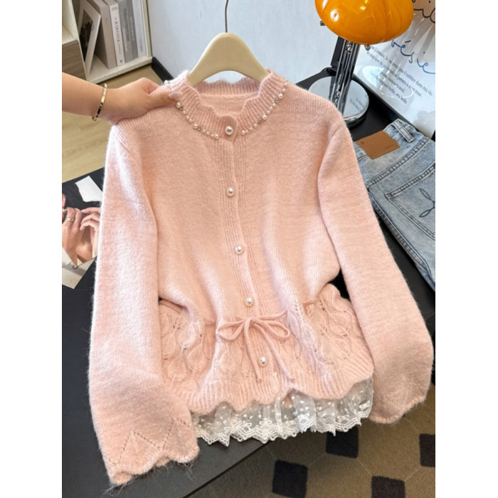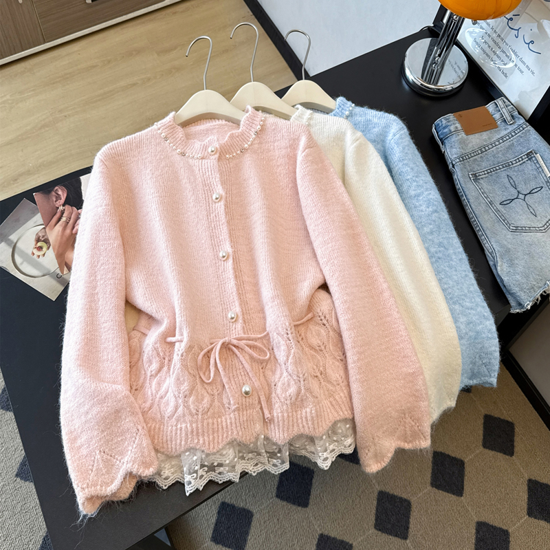 高級感釘珠粉色毛衣開衫外套女秋冬新款大碼胖mm蕾絲花邊針織上衣