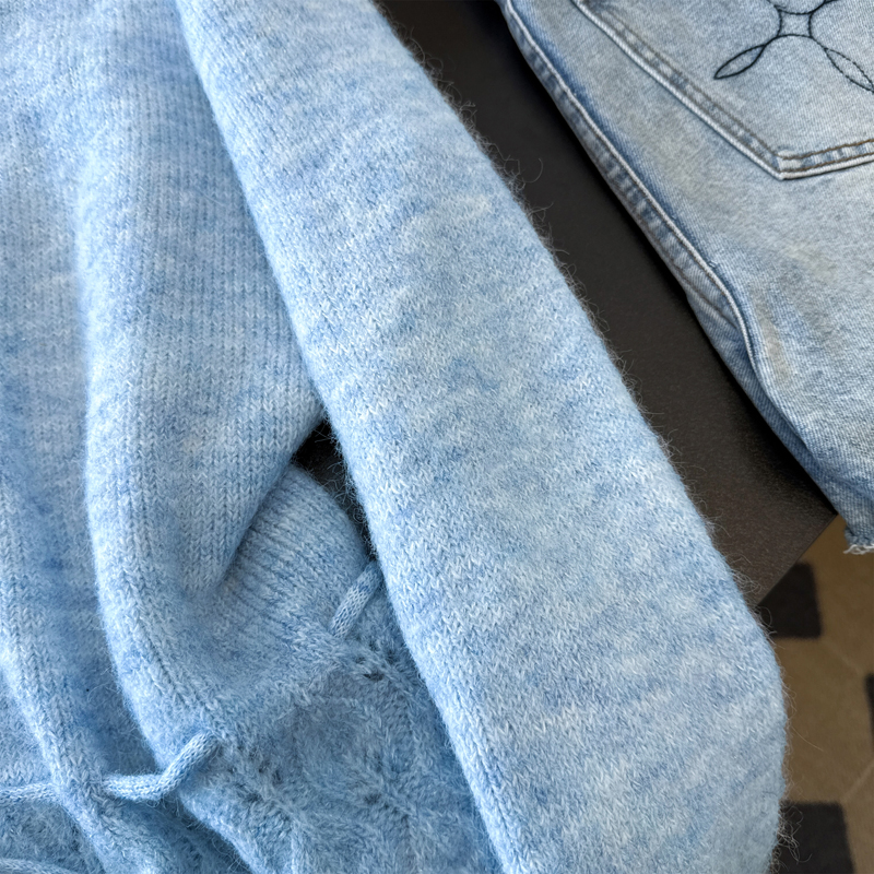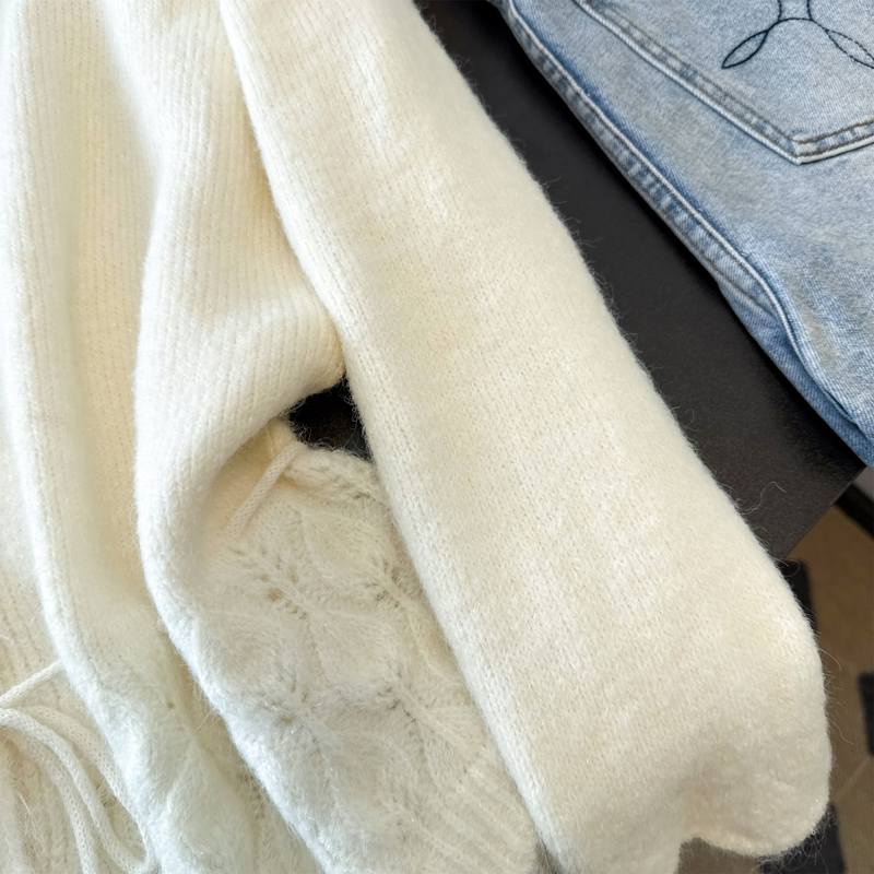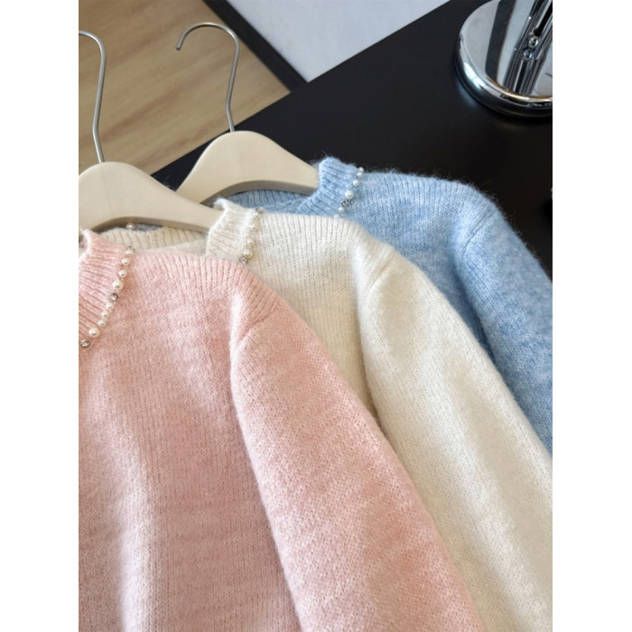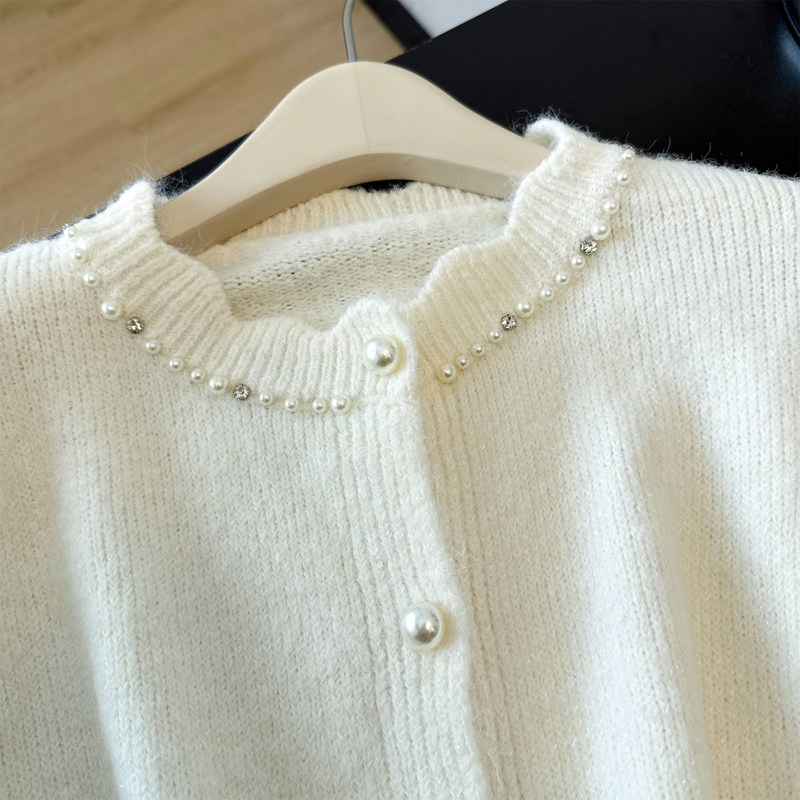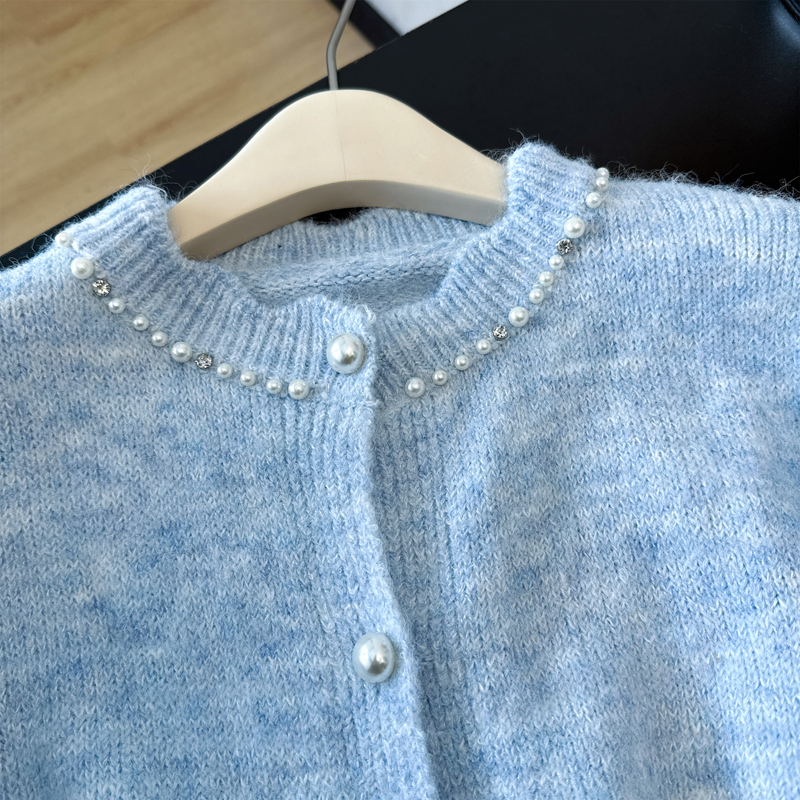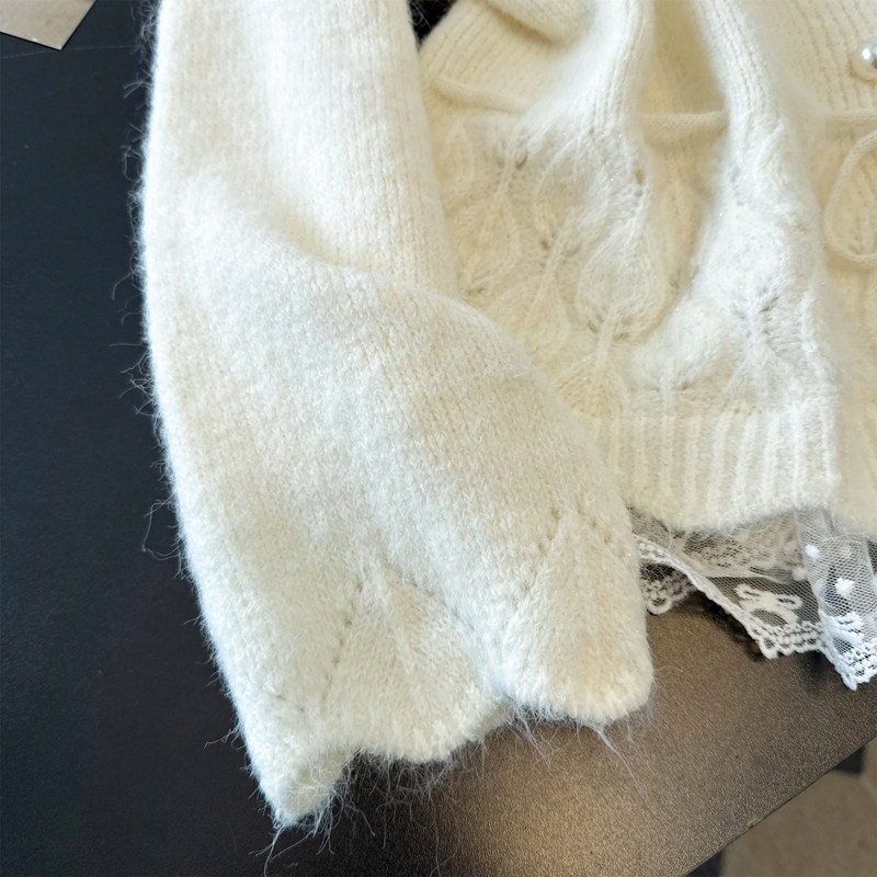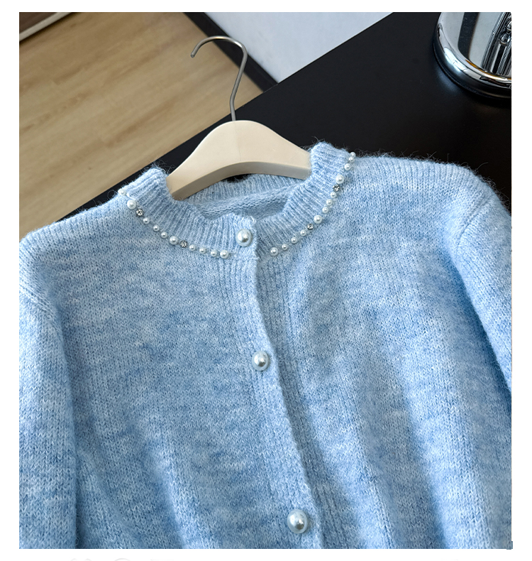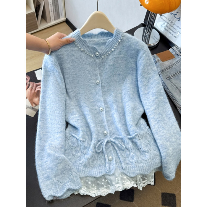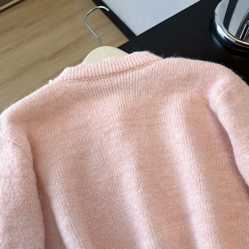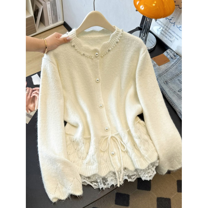 高級感釘珠粉色毛衣開衫外套女秋冬新款大碼胖mm蕾絲花邊針織上衣