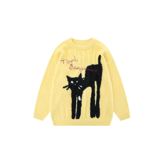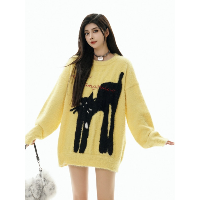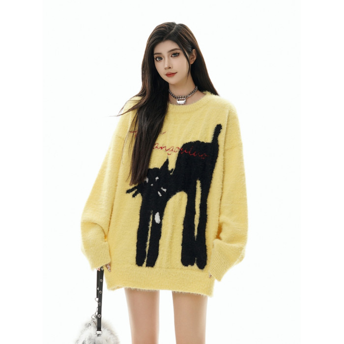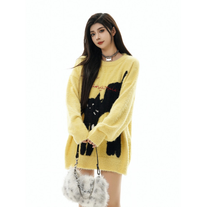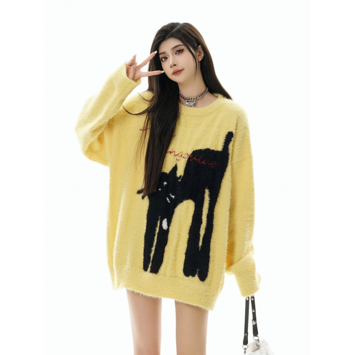 美式貓咪仿貂毛毛衣女秋冬保暖百搭外穿慵懶風情侶套頭內搭針織衫