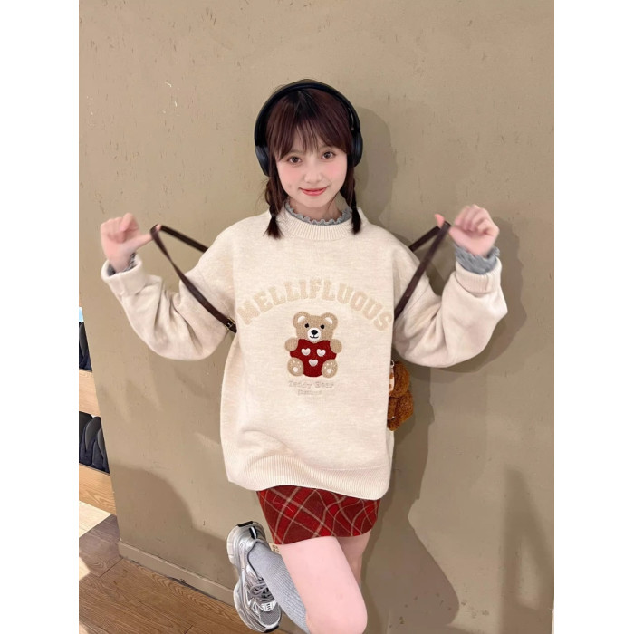 秋冬復古毛巾綉聖誕小熊套頭毛衣女寬松慵懶風圓領針織衫打底上衣