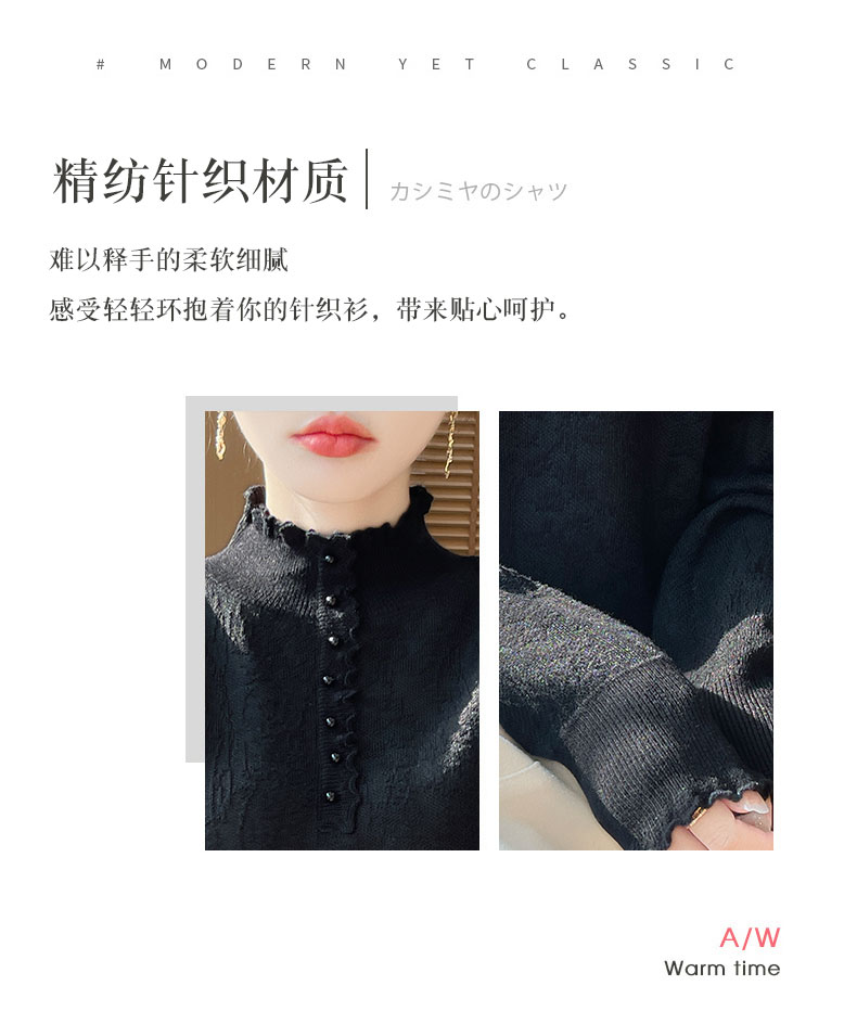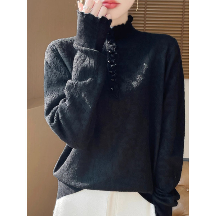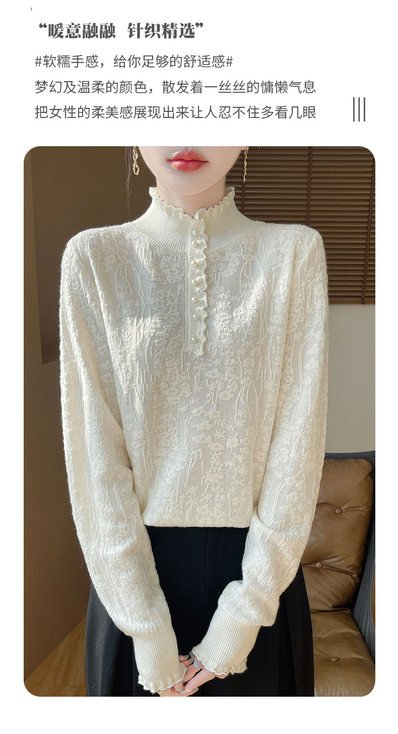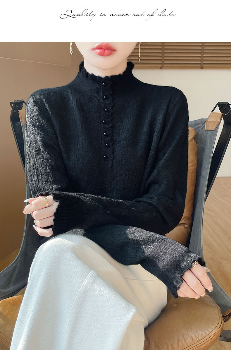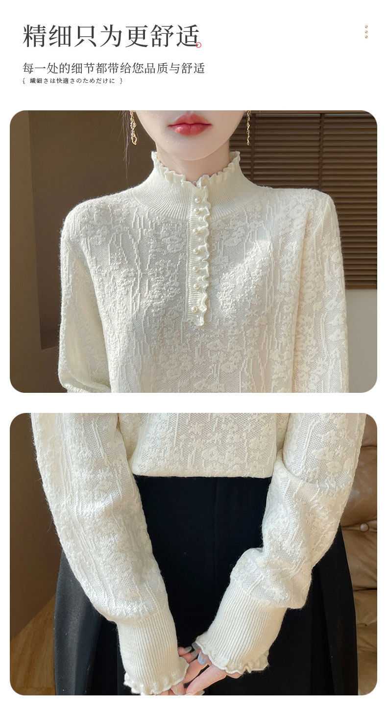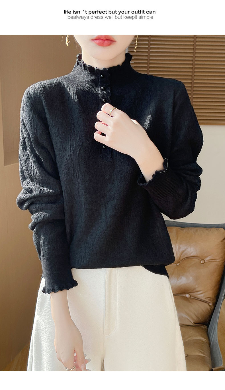 2024秋冬新款洋氣優雅木耳花邊半高領打底衫女寬松加厚針織衫毛衣