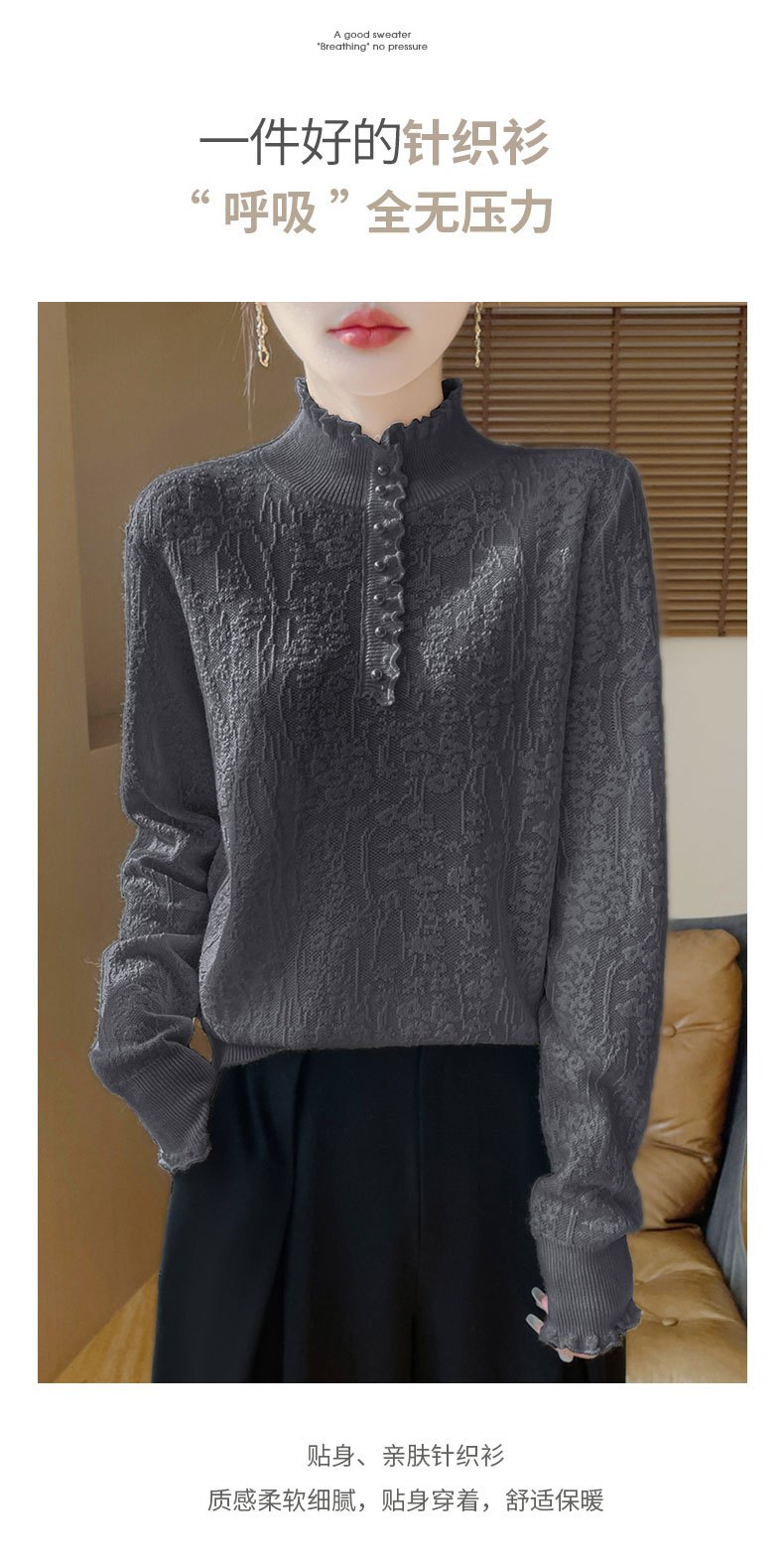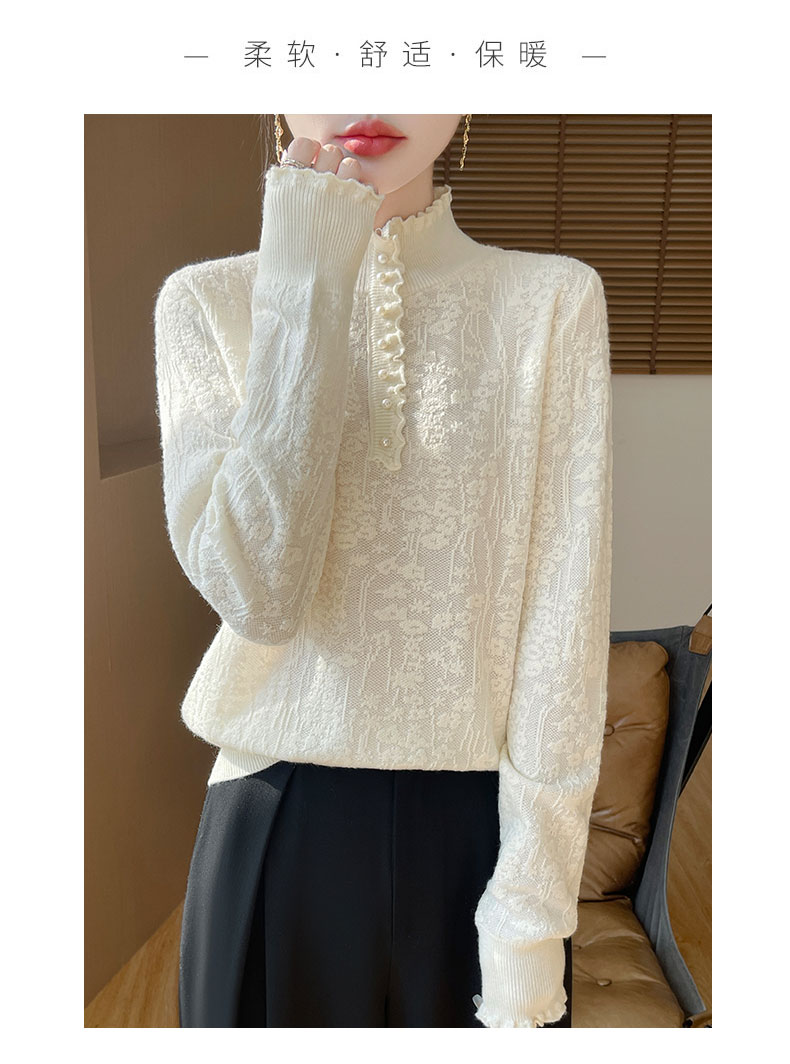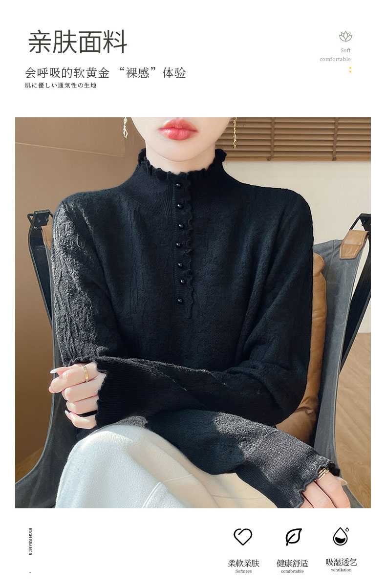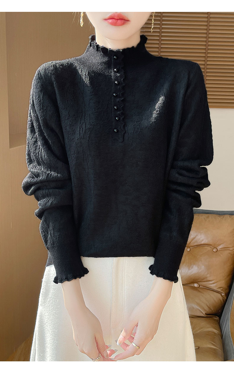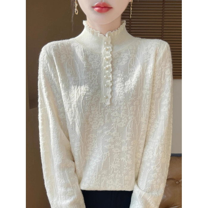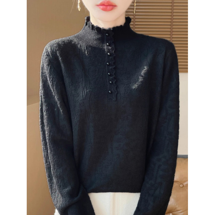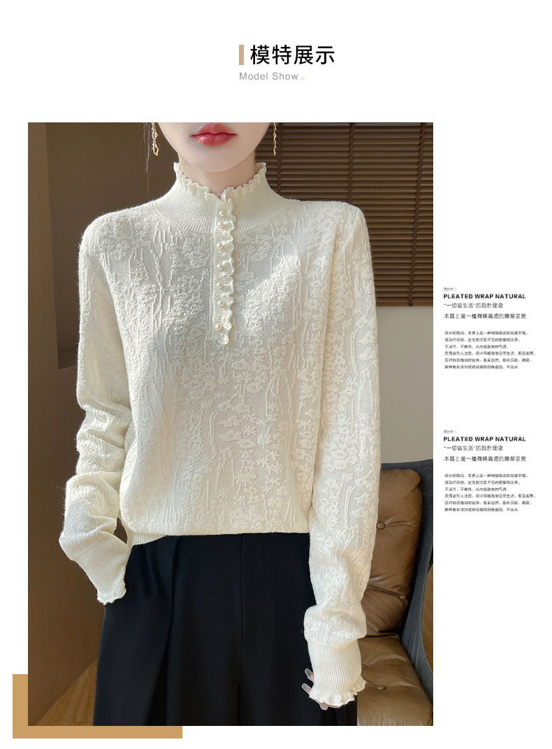 2024秋冬新款洋氣優雅木耳花邊半高領打底衫女寬松加厚針織衫毛衣