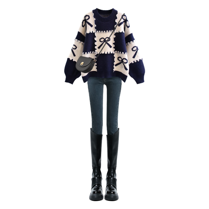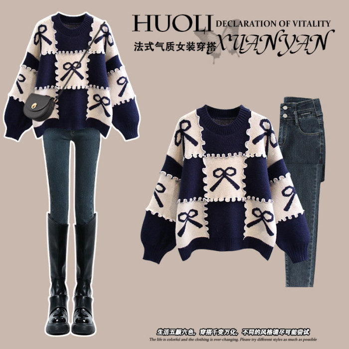 韓系秋冬穿搭寬松慵懶藍色毛衣2026超火巨好看的冬裝一整套針織衫