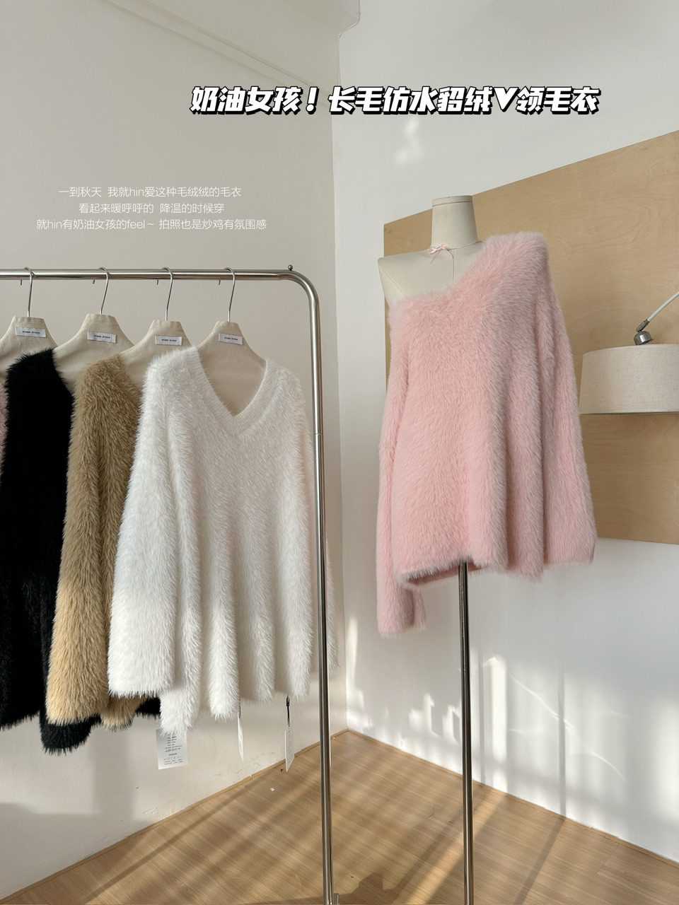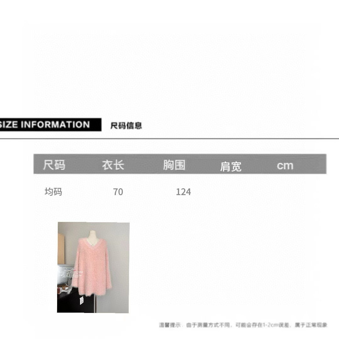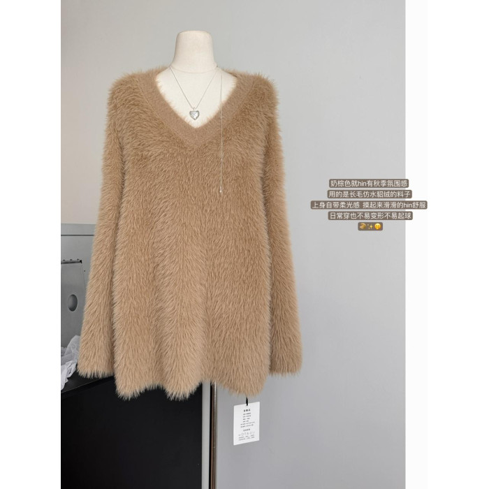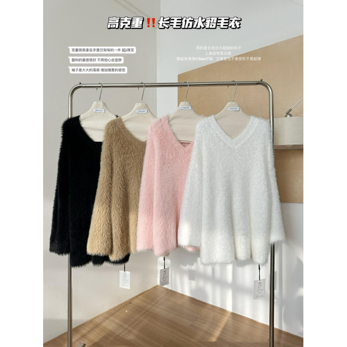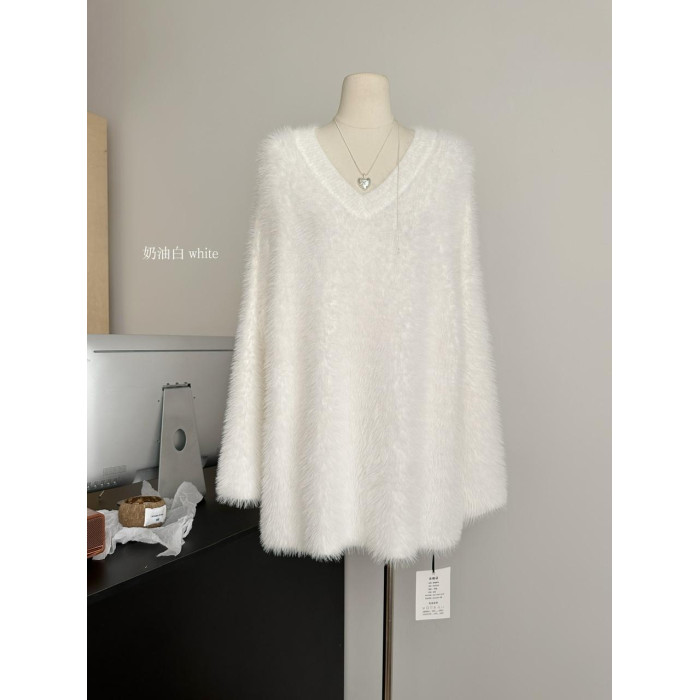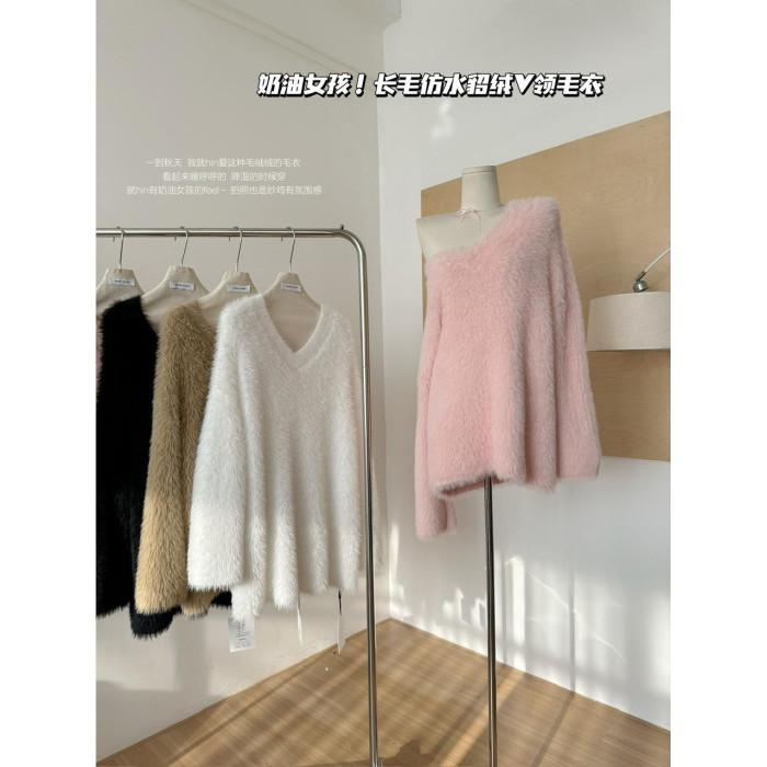 POPW 慵懶白色V領水貂絨毛衣女秋冬新款韓版寬松毛茸茸針織衫