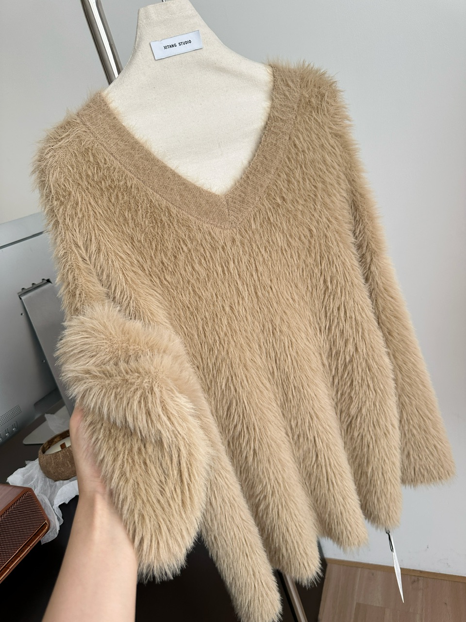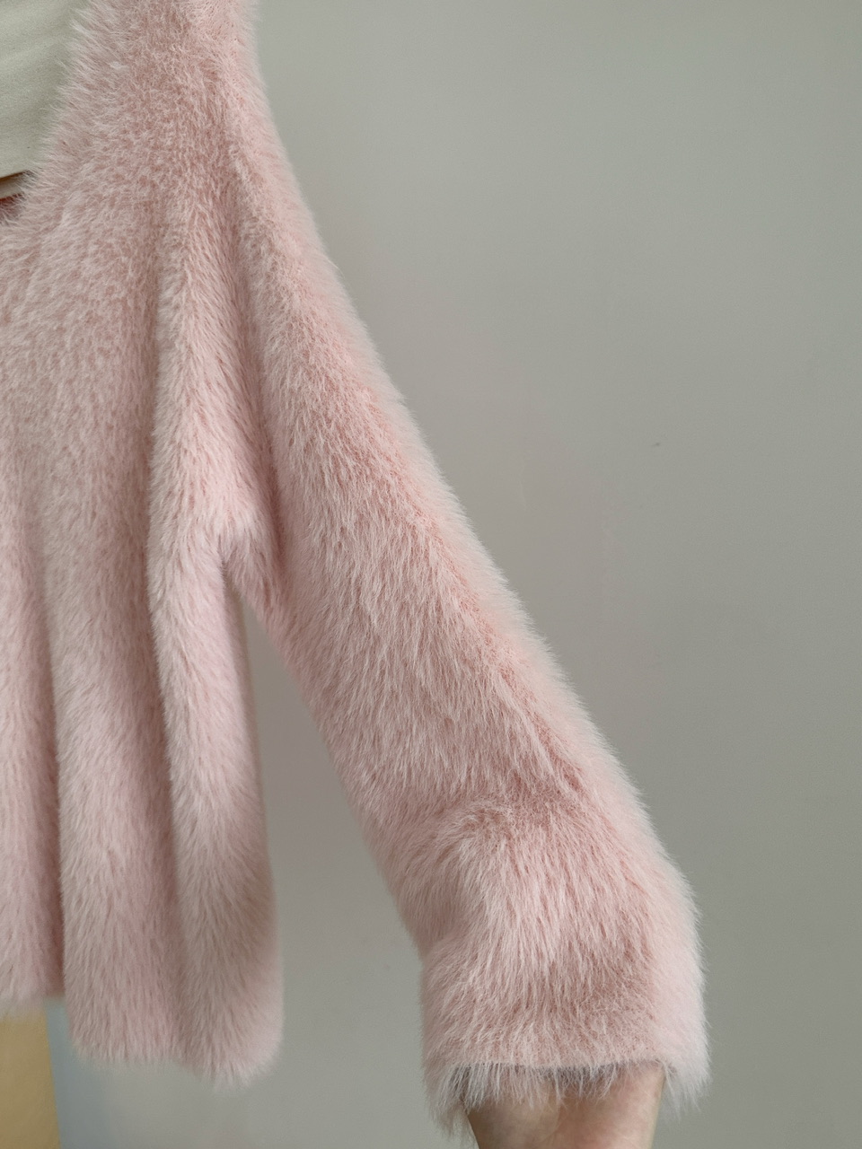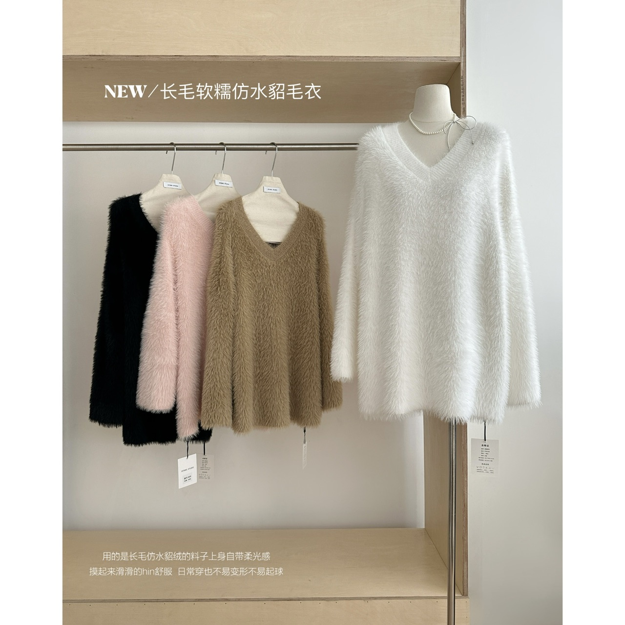 POPW 慵懶白色V領水貂絨毛衣女秋冬新款韓版寬松毛茸茸針織衫