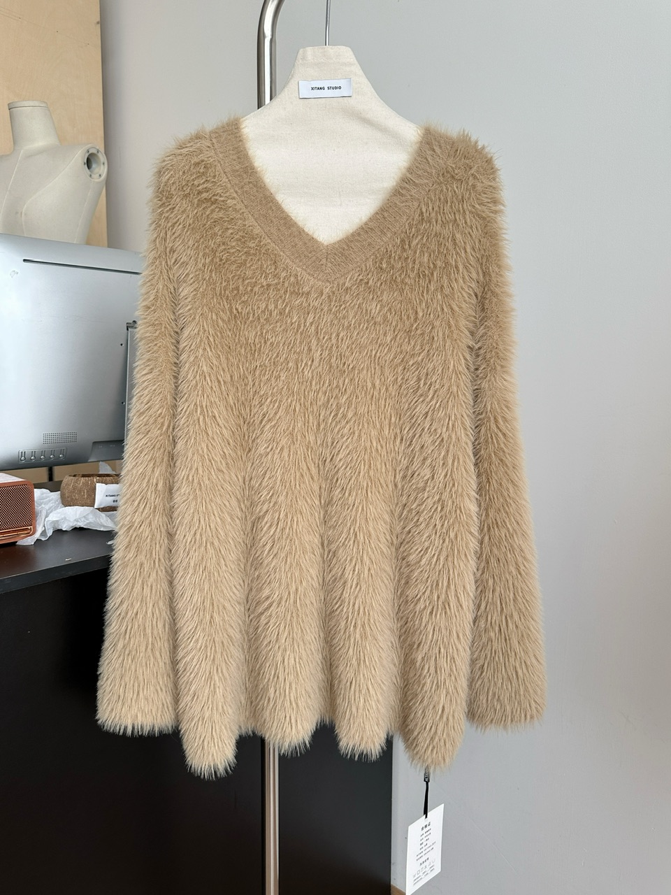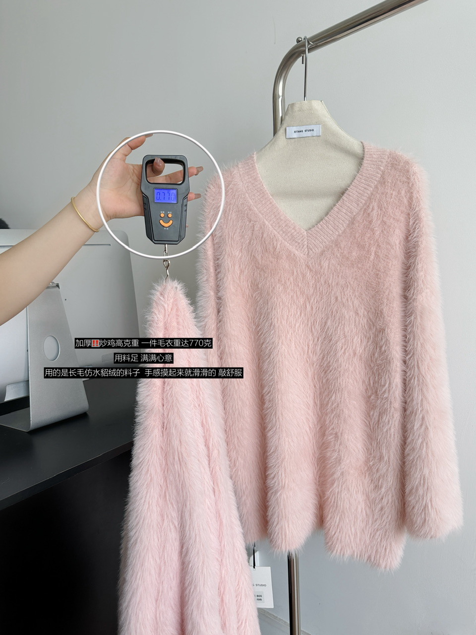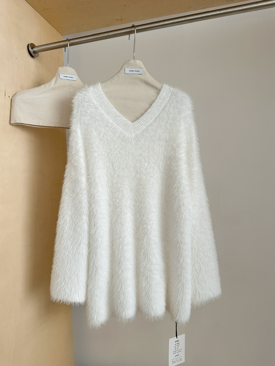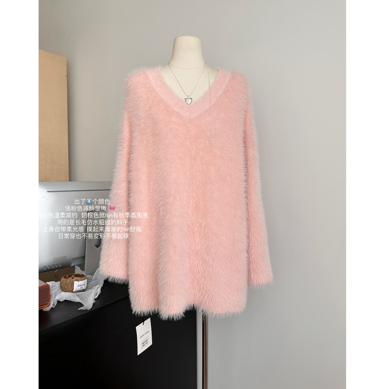 POPW 慵懶白色V領水貂絨毛衣女秋冬新款韓版寬松毛茸茸針織衫