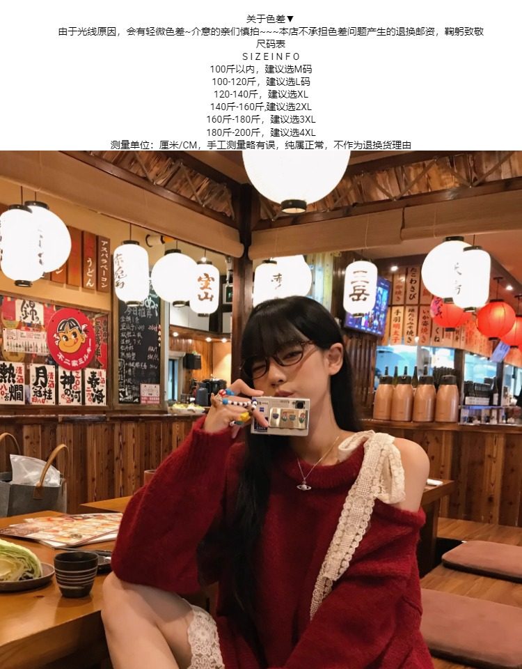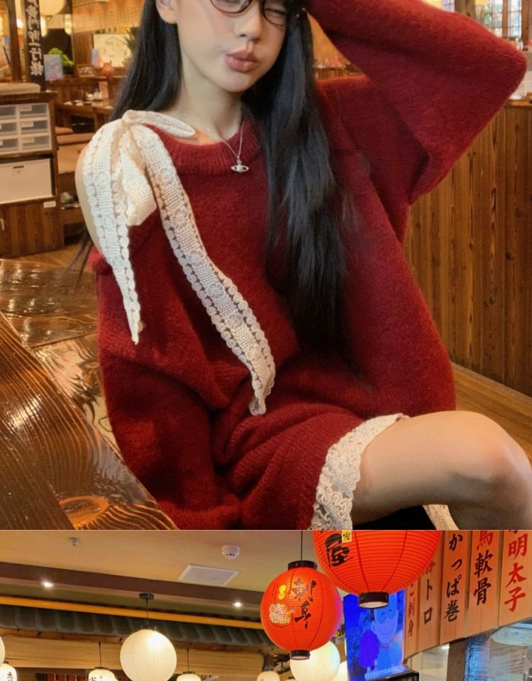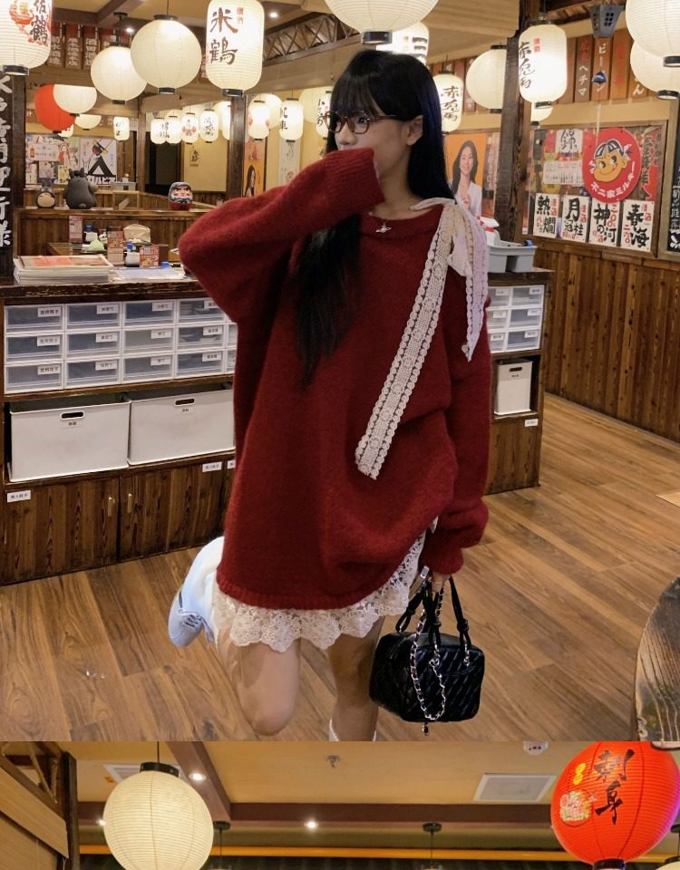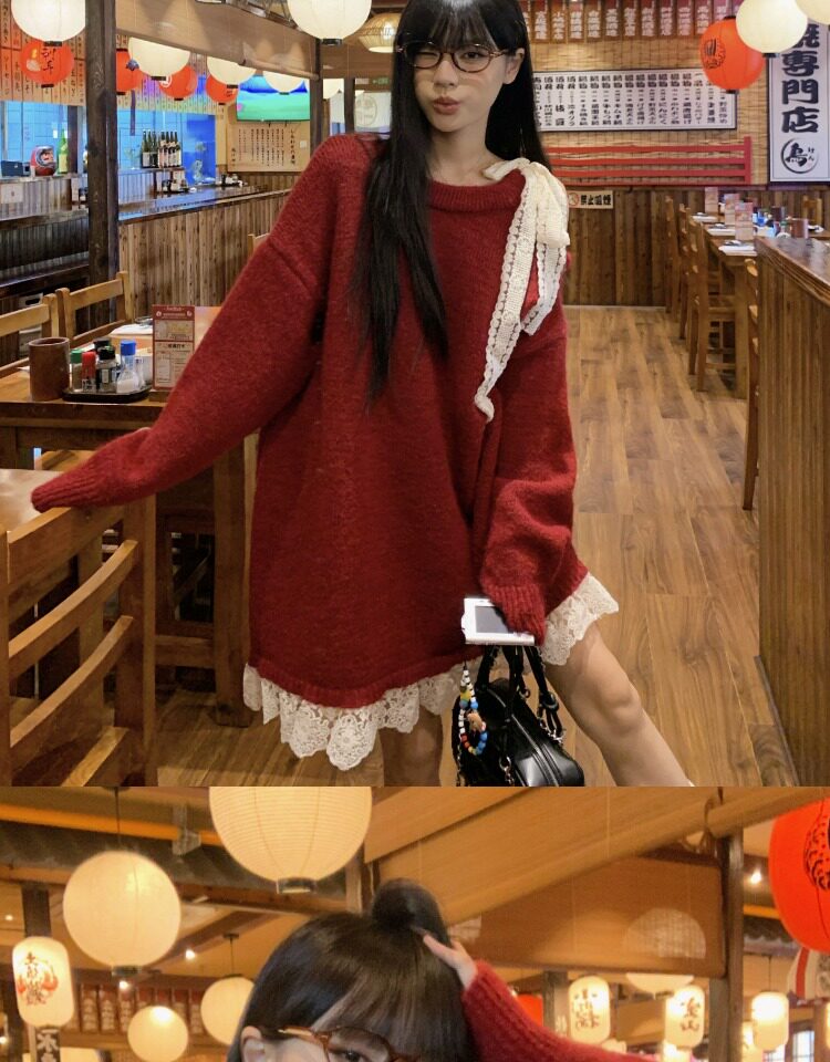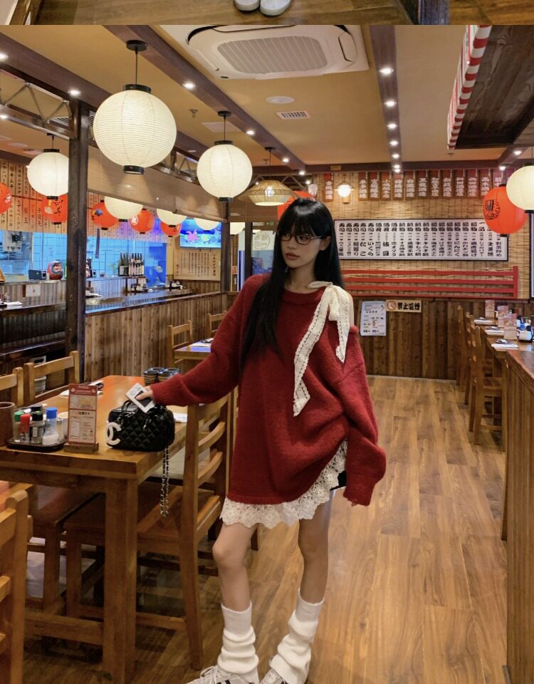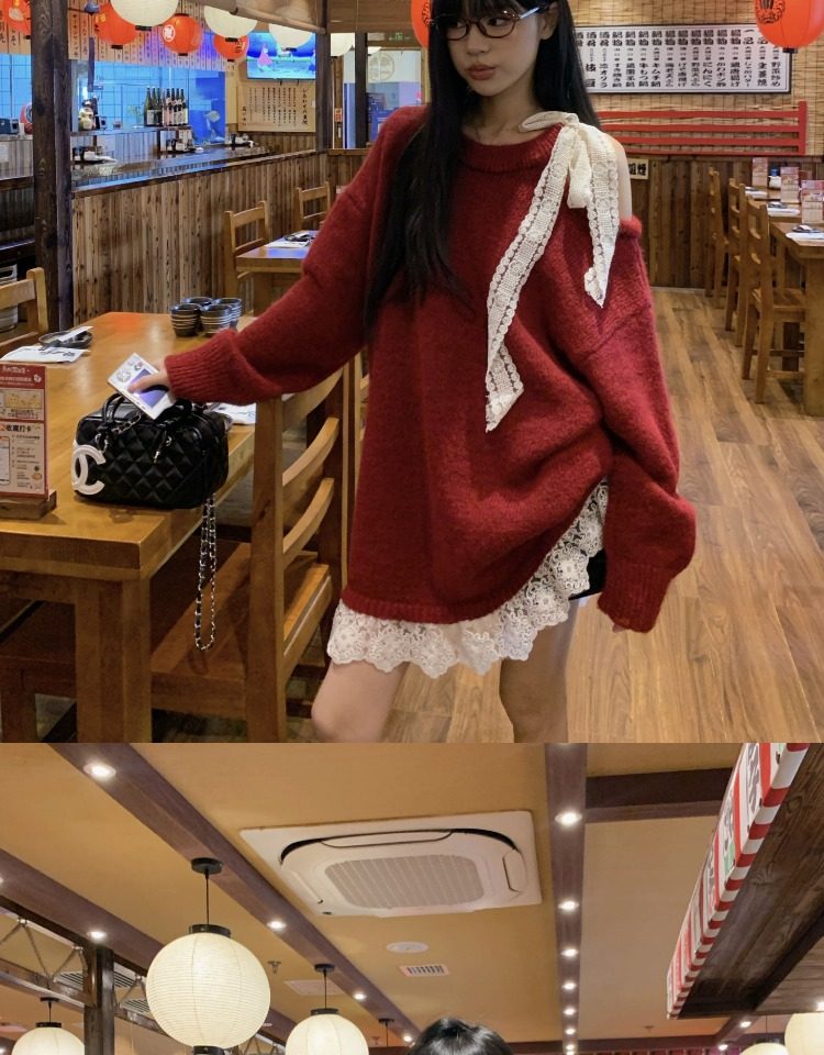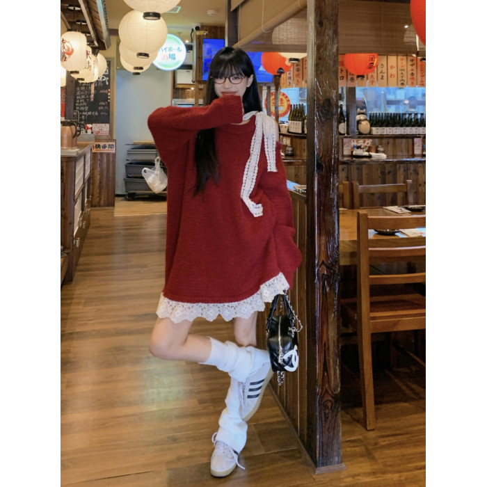 大碼高級感蕾絲長袖紅色毛衣冬新款中長款針織衫胖MM蝴蝶結上衣女
