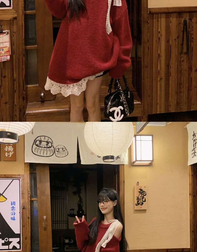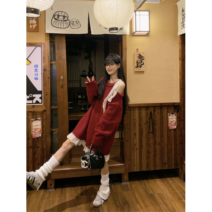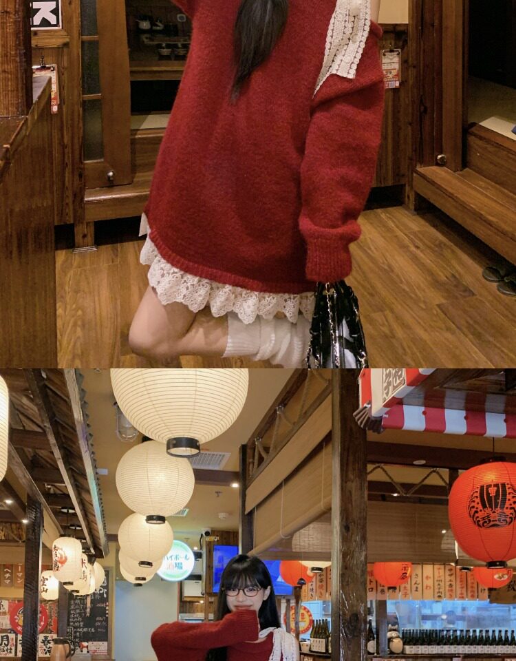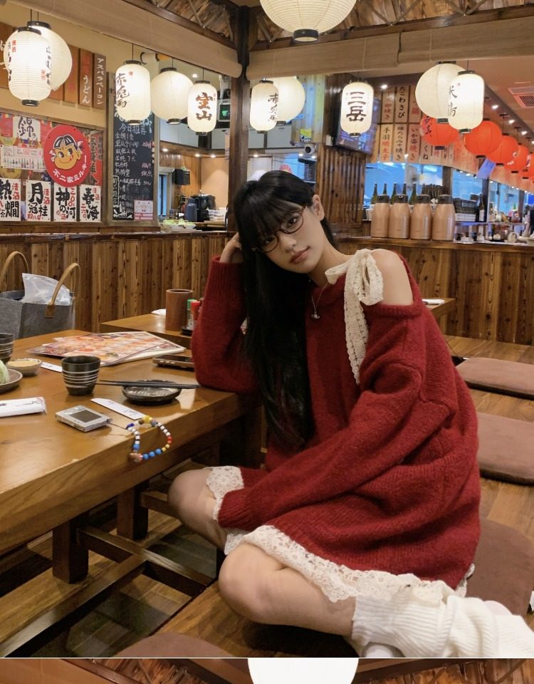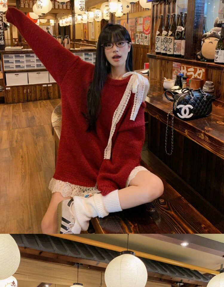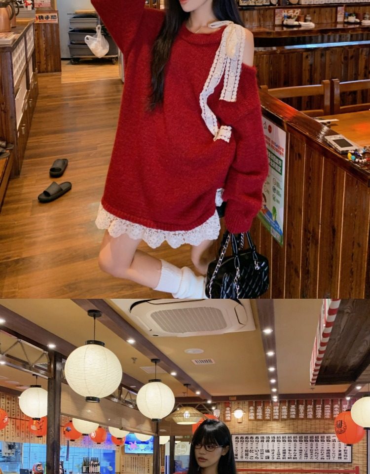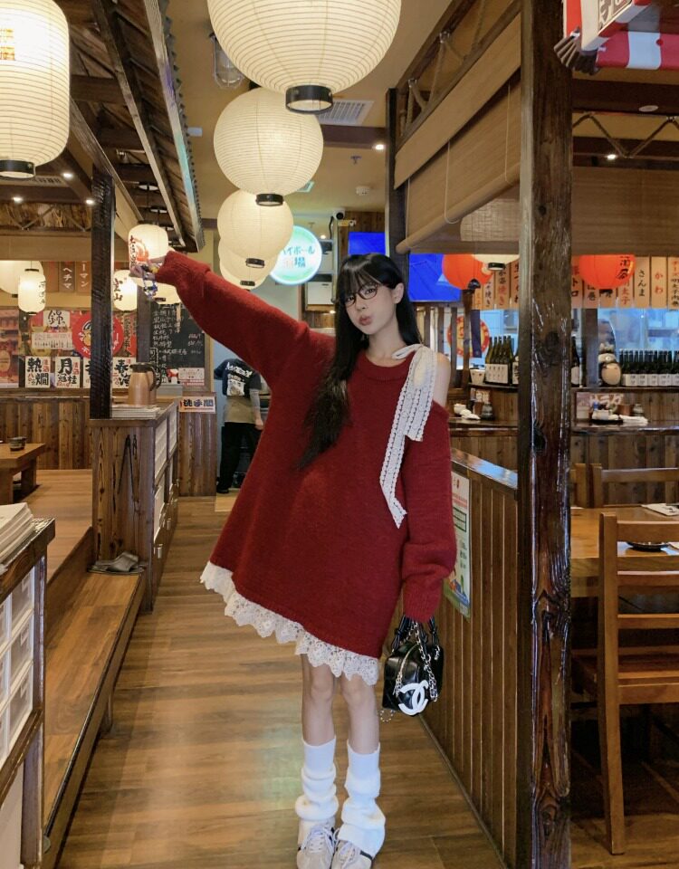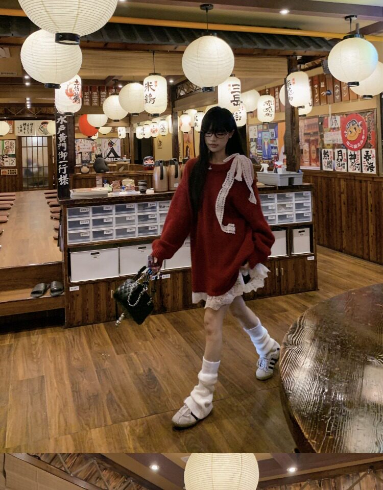 大碼高級感蕾絲長袖紅色毛衣冬新款中長款針織衫胖MM蝴蝶結上衣女