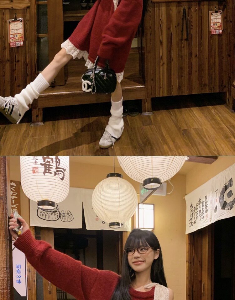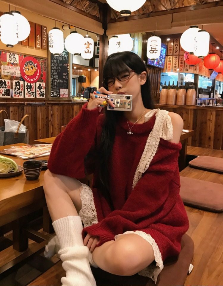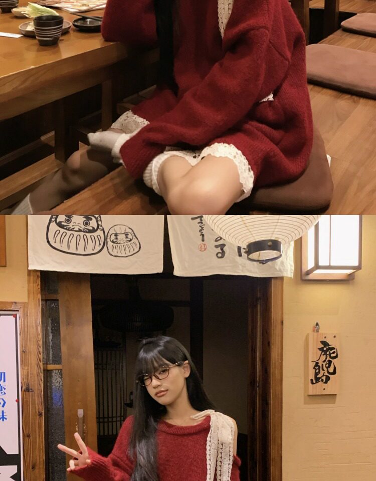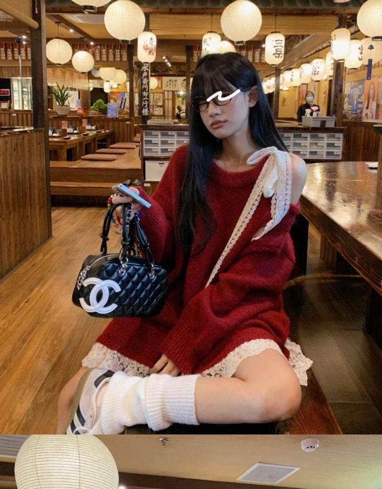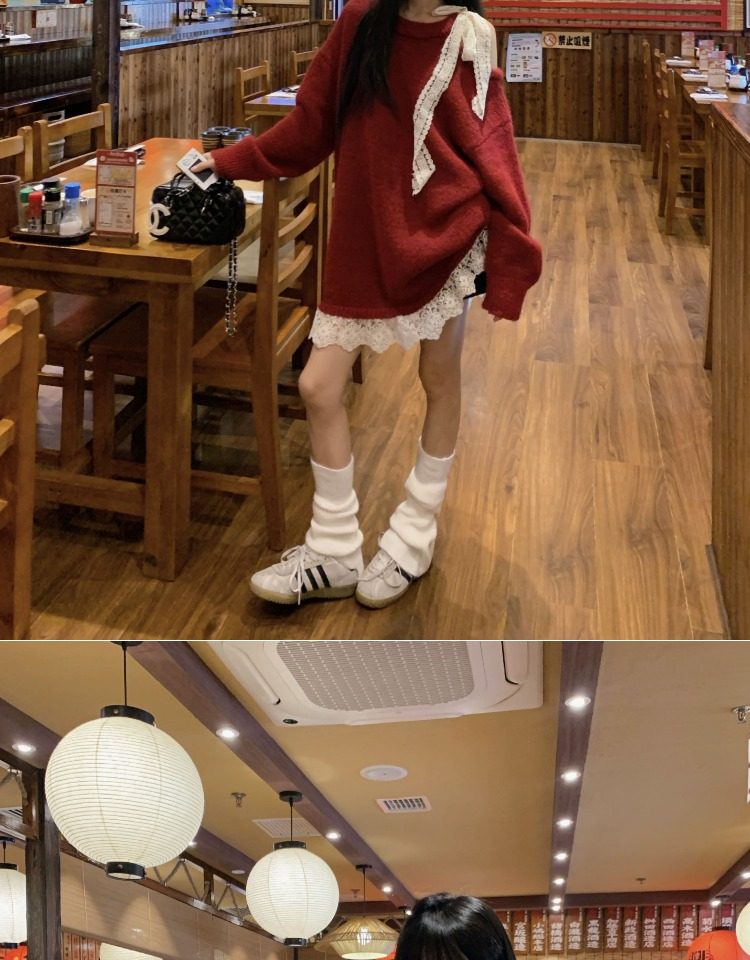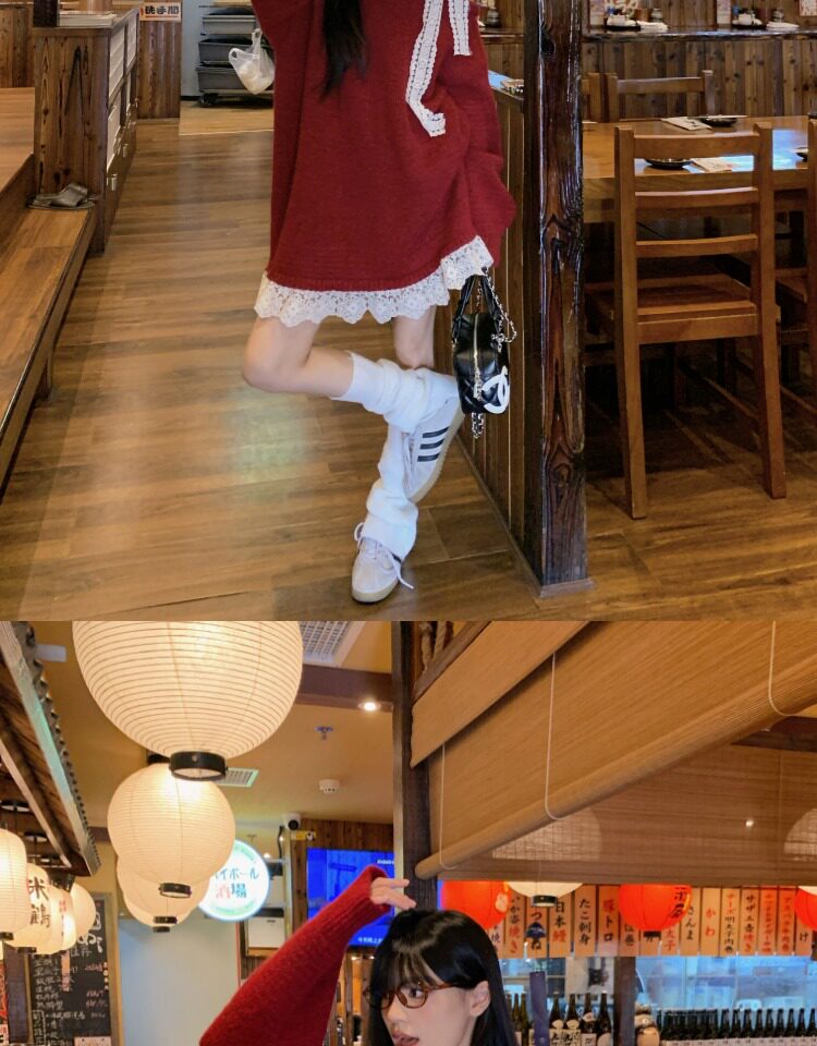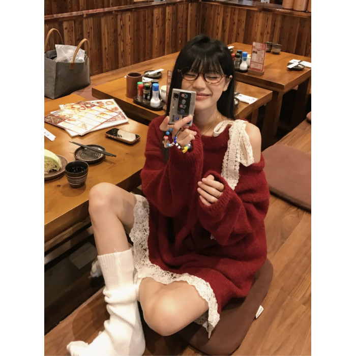 大碼高級感蕾絲長袖紅色毛衣冬新款中長款針織衫胖MM蝴蝶結上衣女