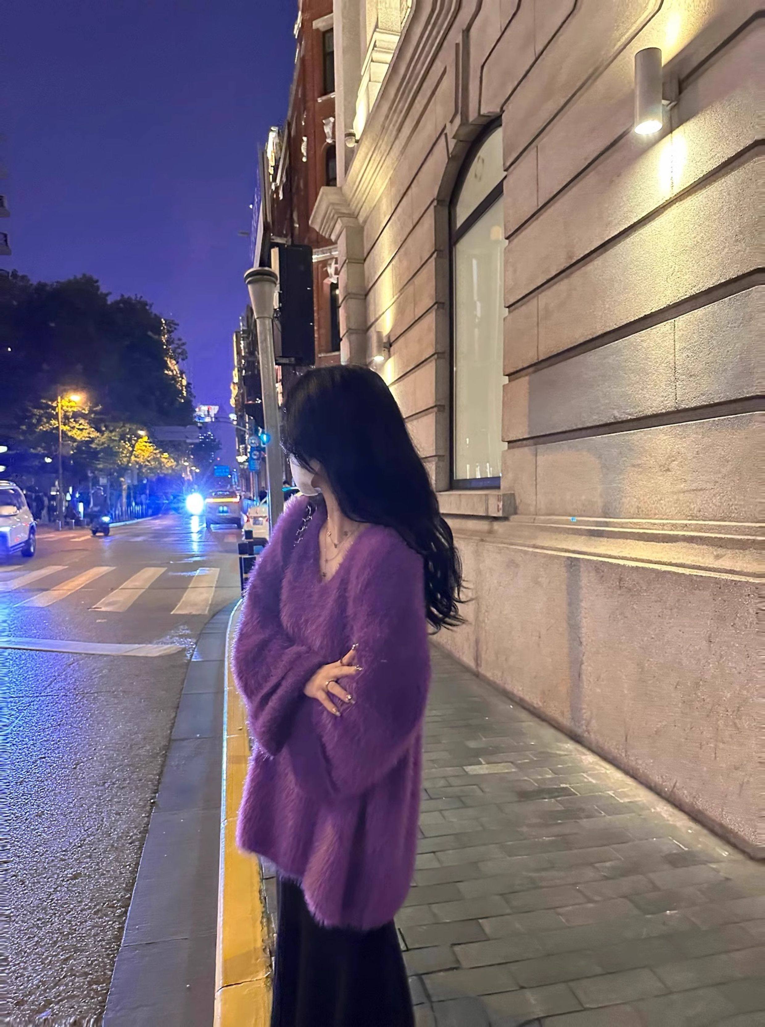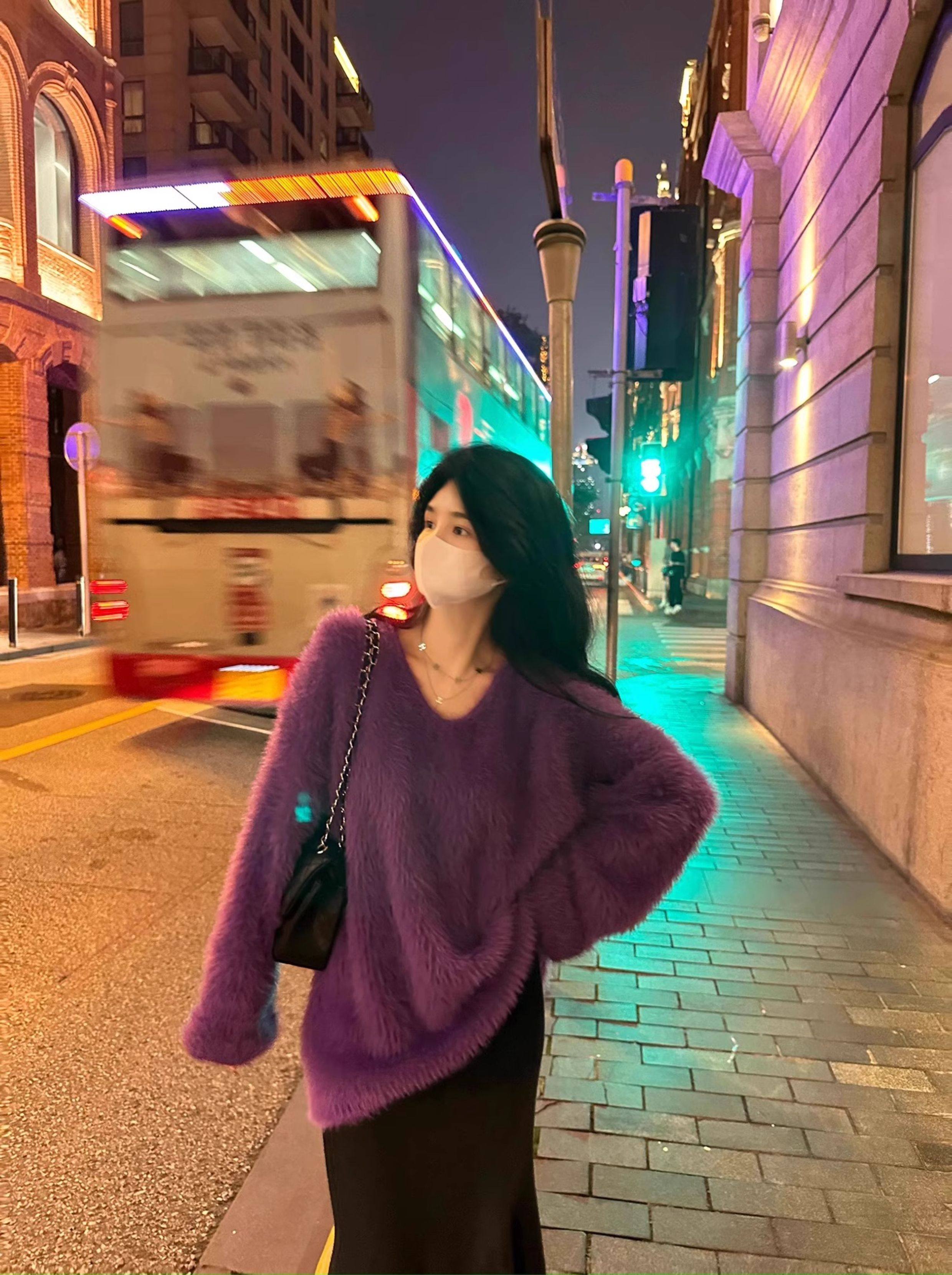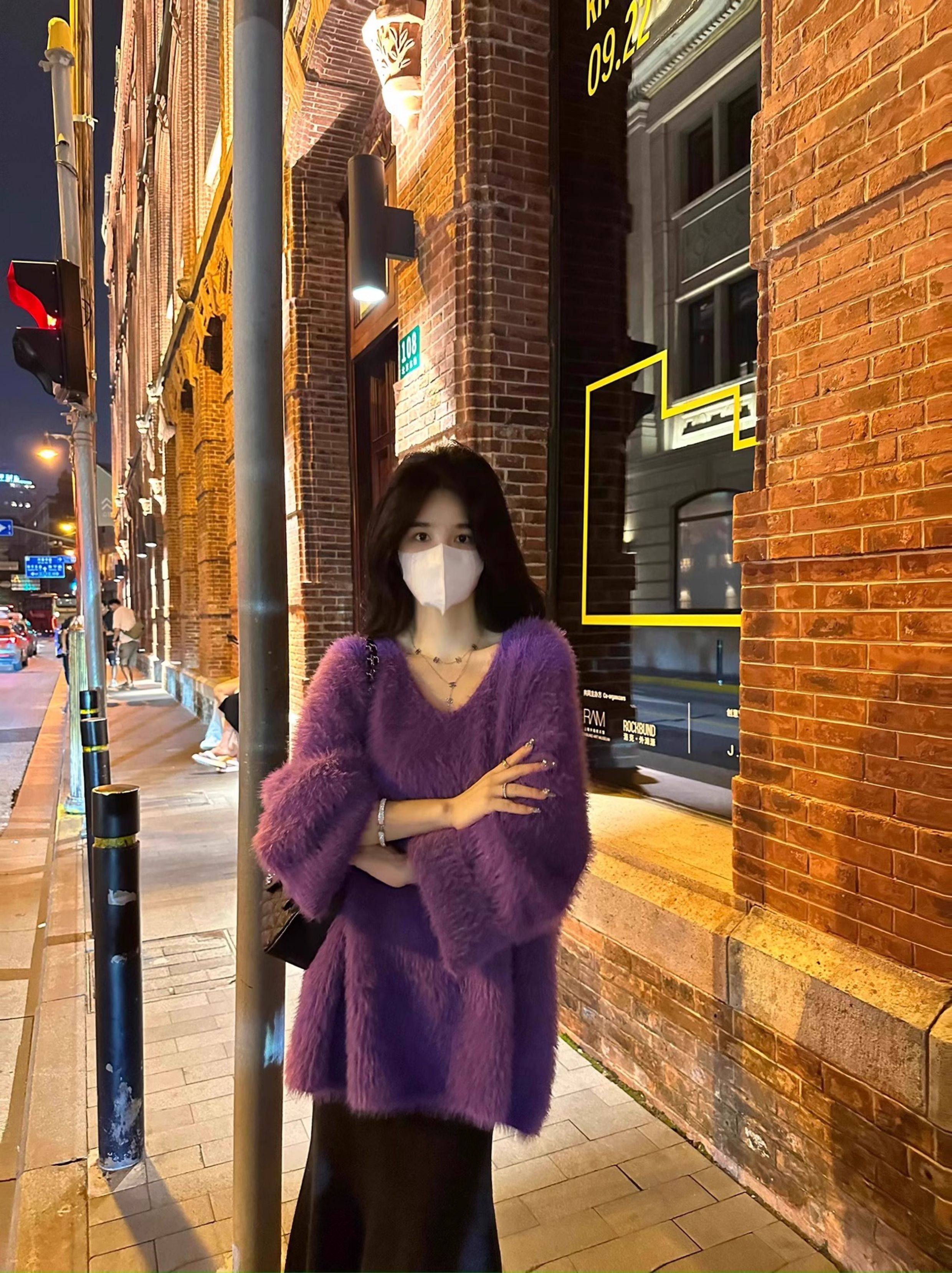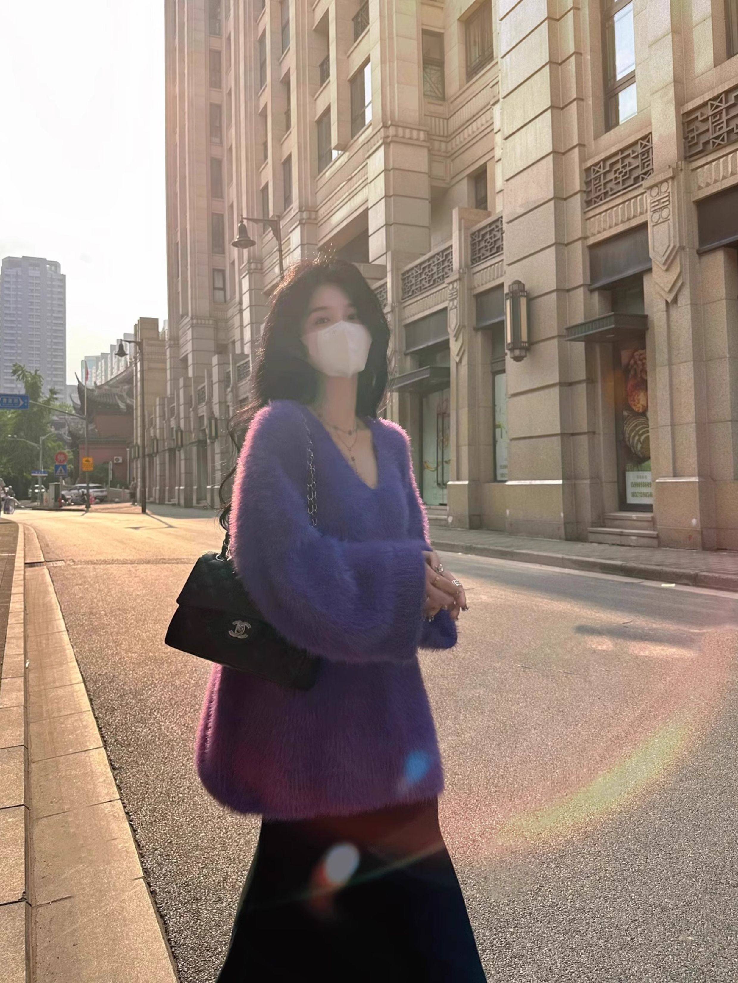 秋冬V領寬鬆慵懶風毛衣加厚仿水貂毛外套女紫色法式洋氣韓版上衣
