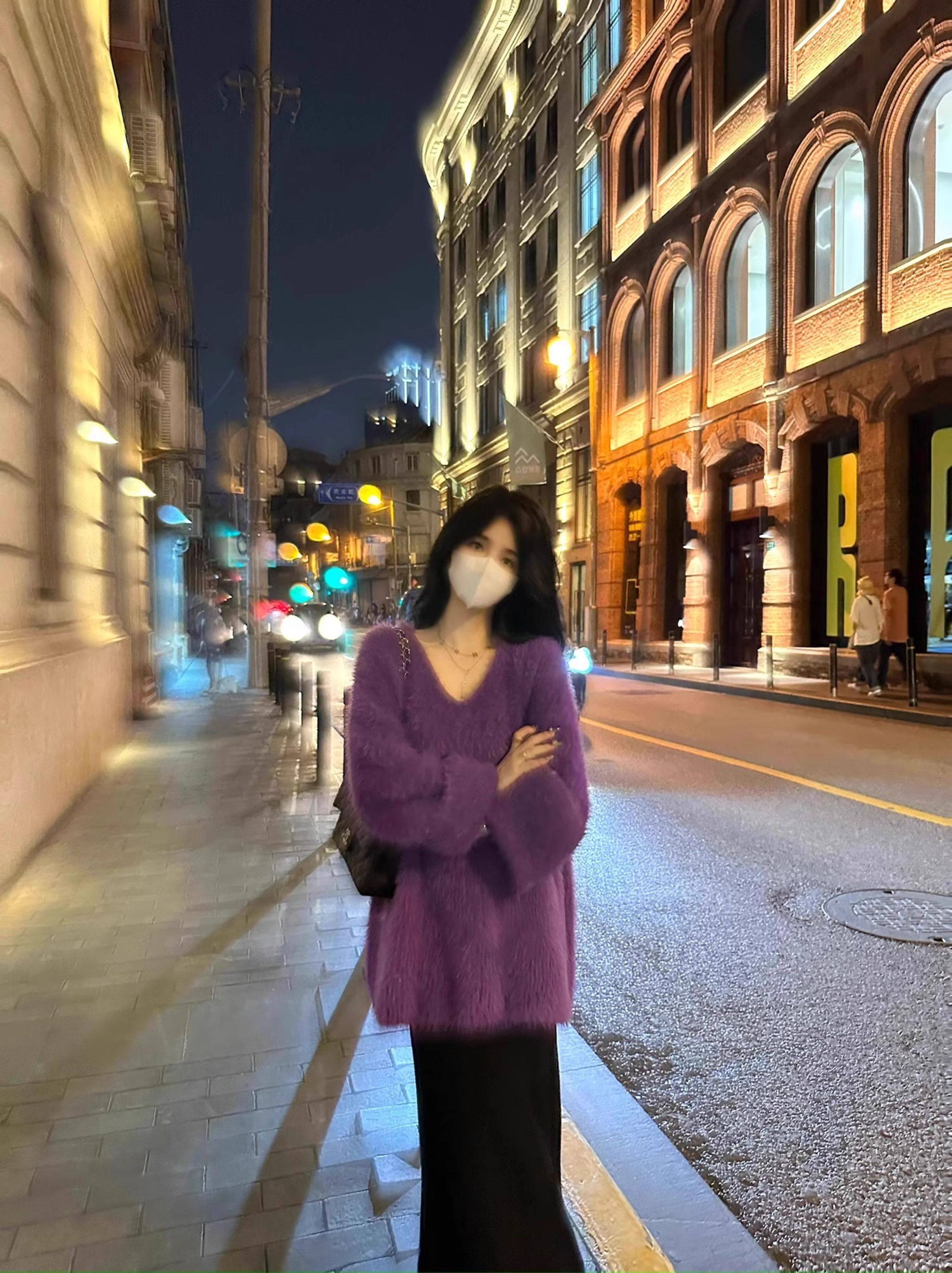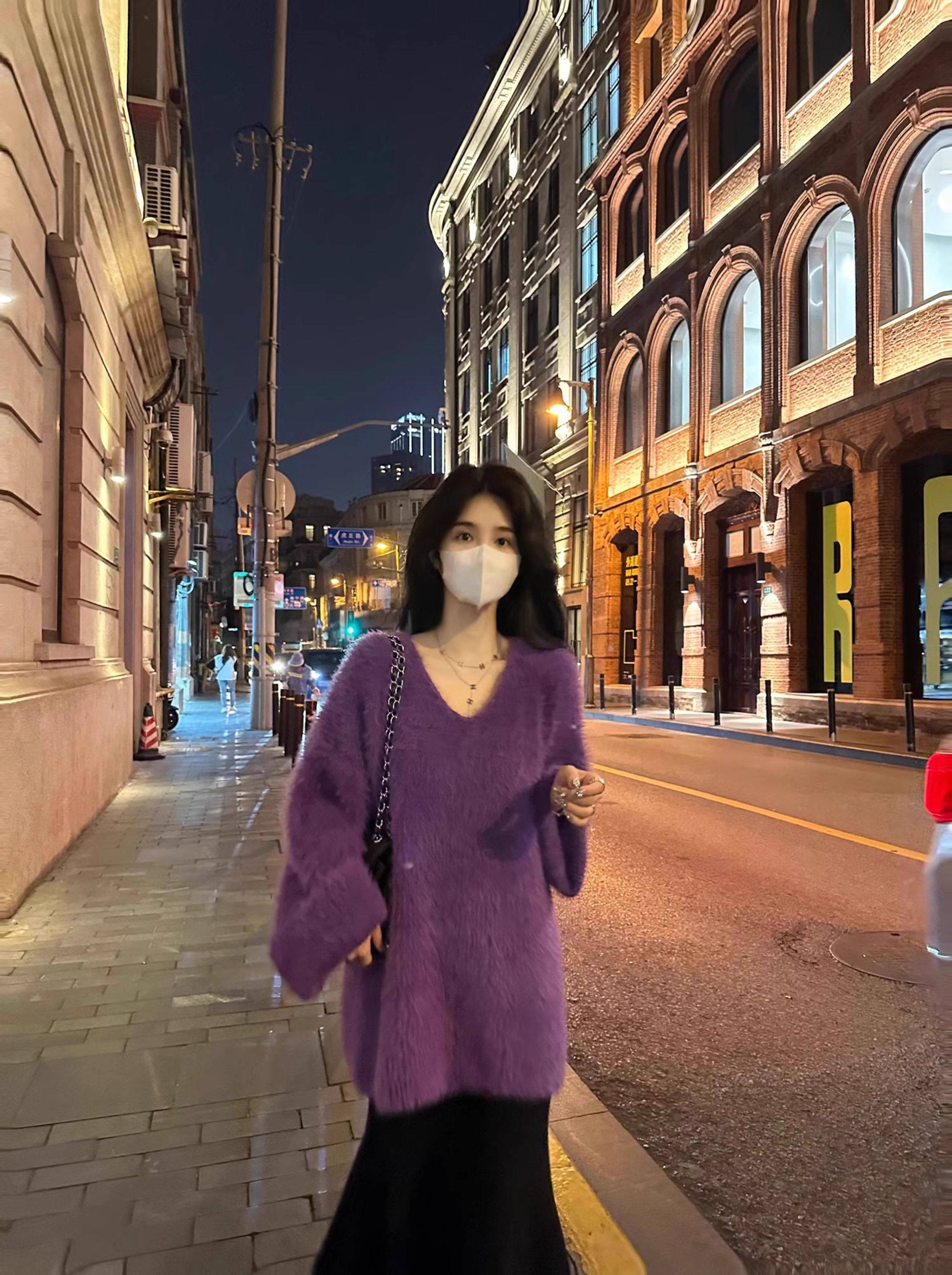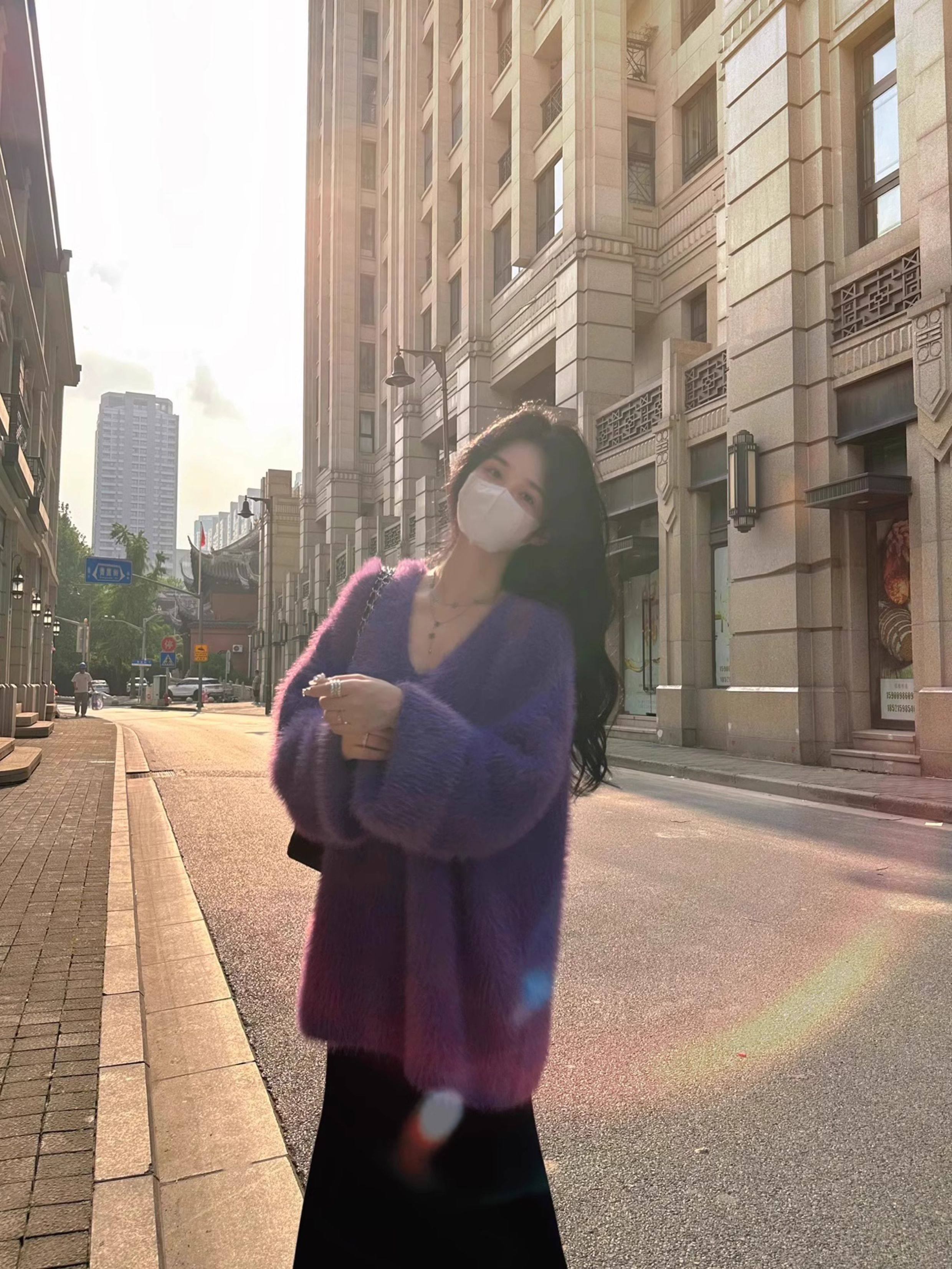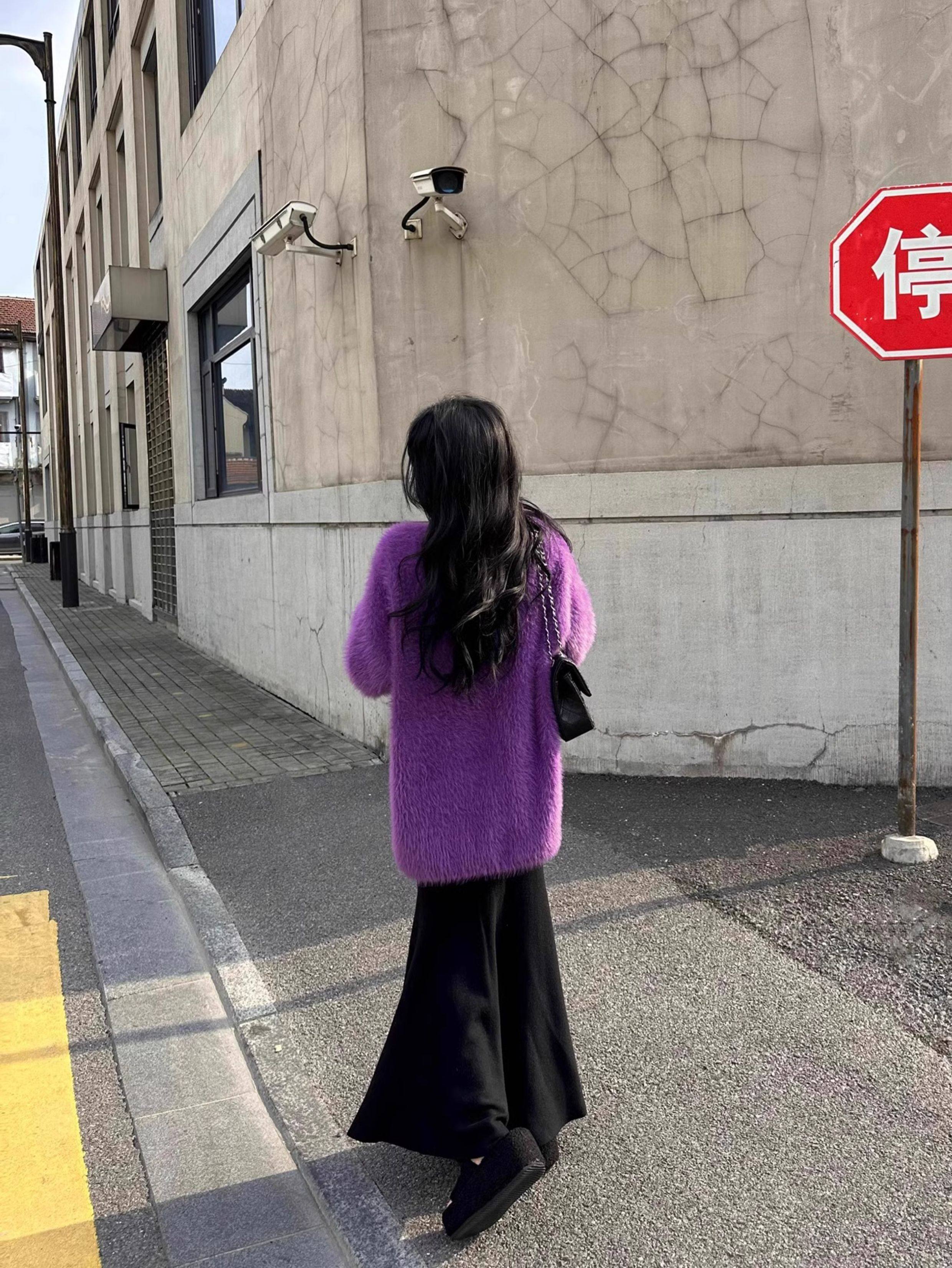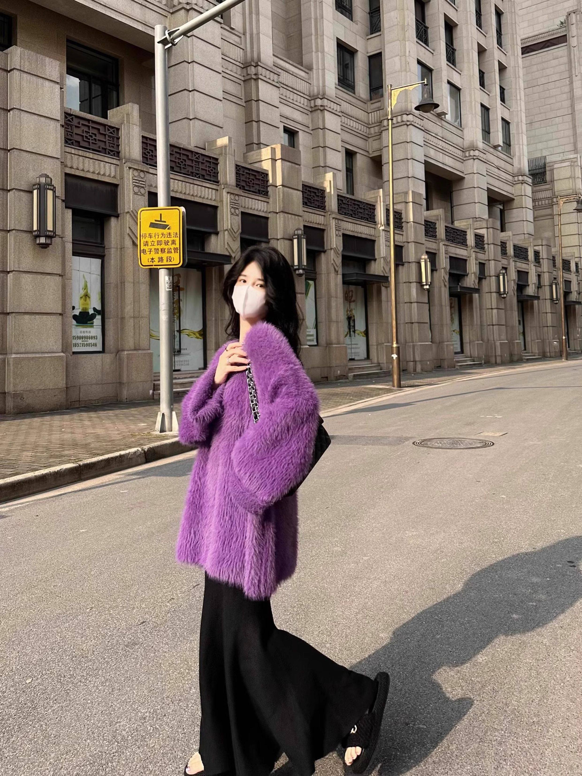 秋冬V領寬鬆慵懶風毛衣加厚仿水貂毛外套女紫色法式洋氣韓版上衣