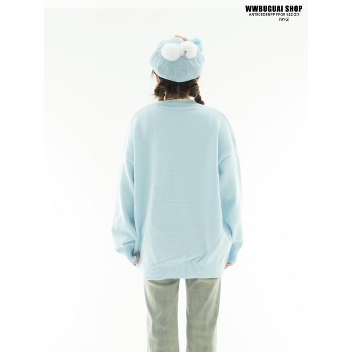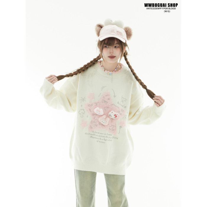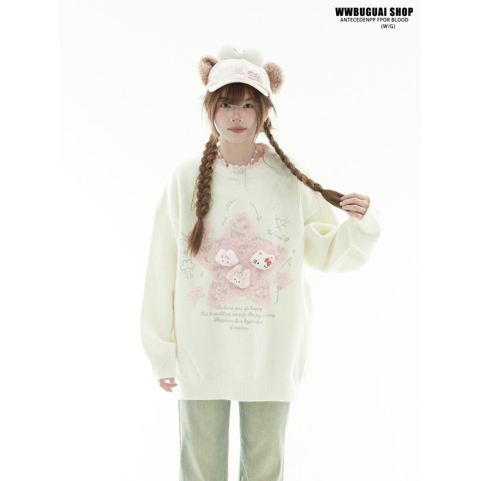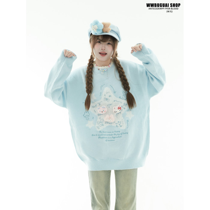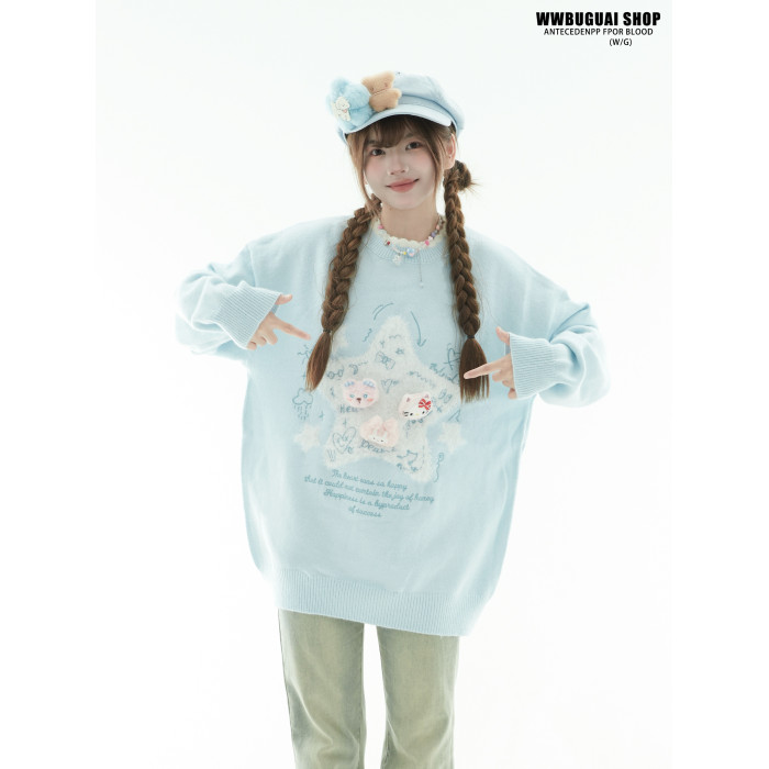 文文不乖原創奶fufu慵懶風藍色星星圓領針織衫毛衣女秋冬早秋上衣