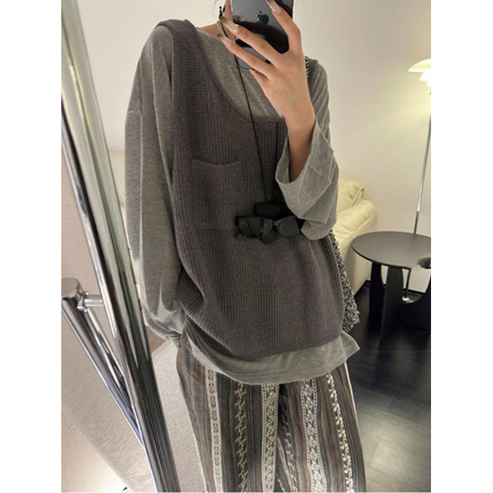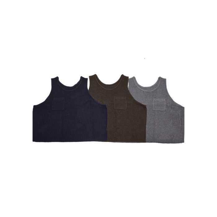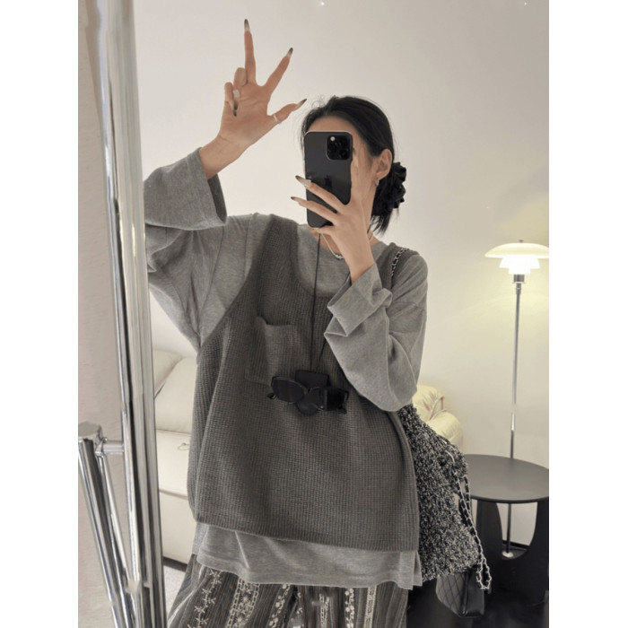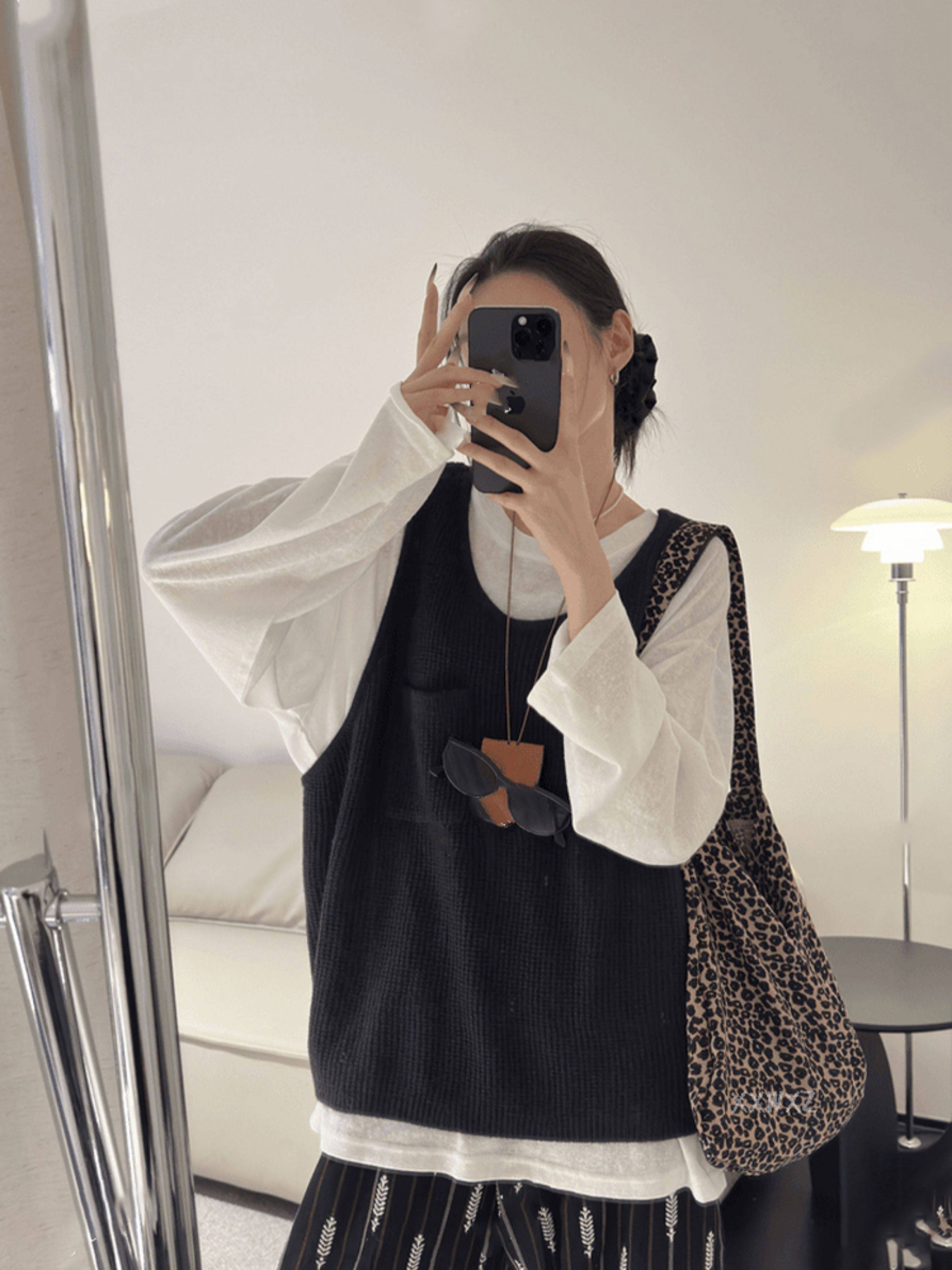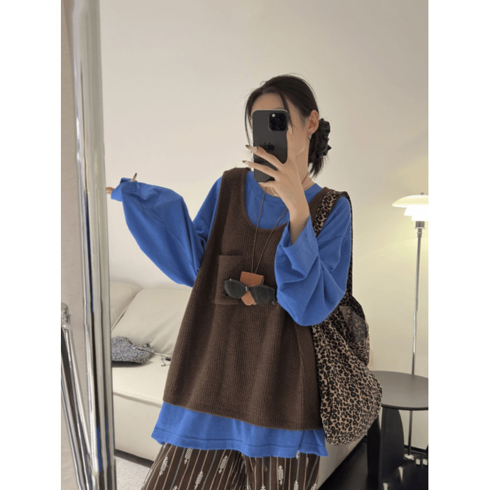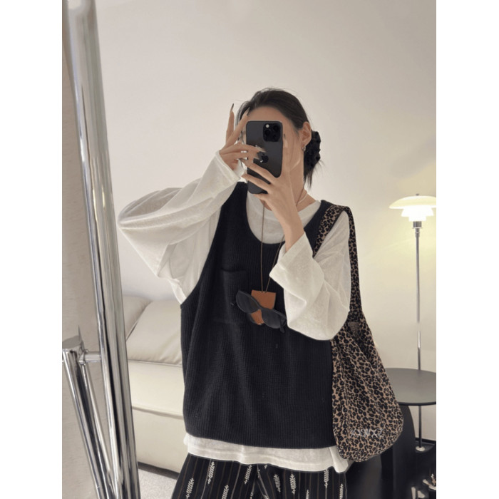 韓國東大門秋季新款慵懶拍檔小口袋紋理針織背心馬甲女外搭毛衣潮