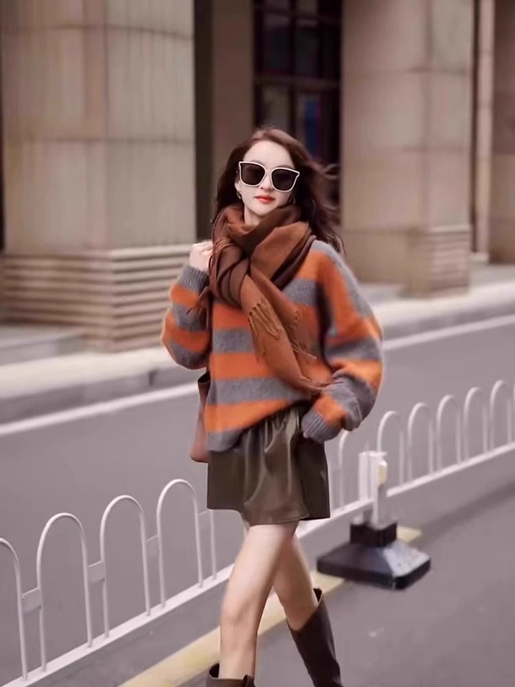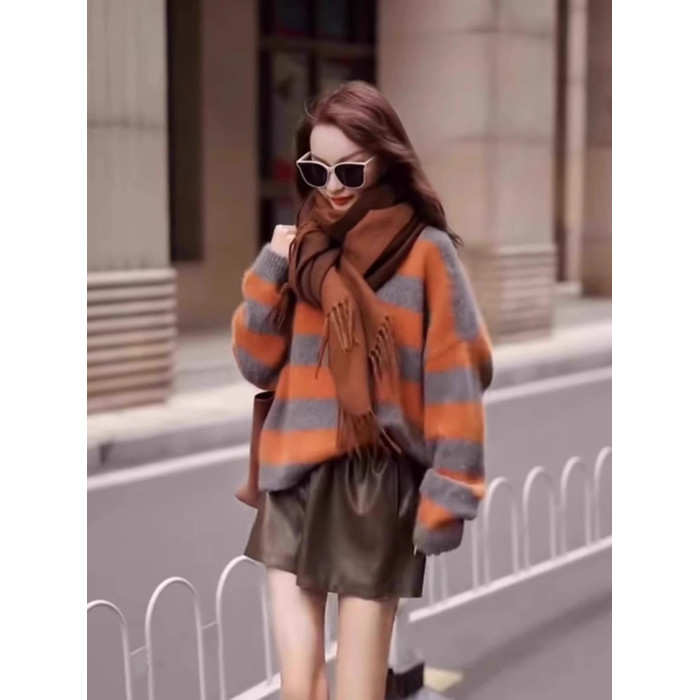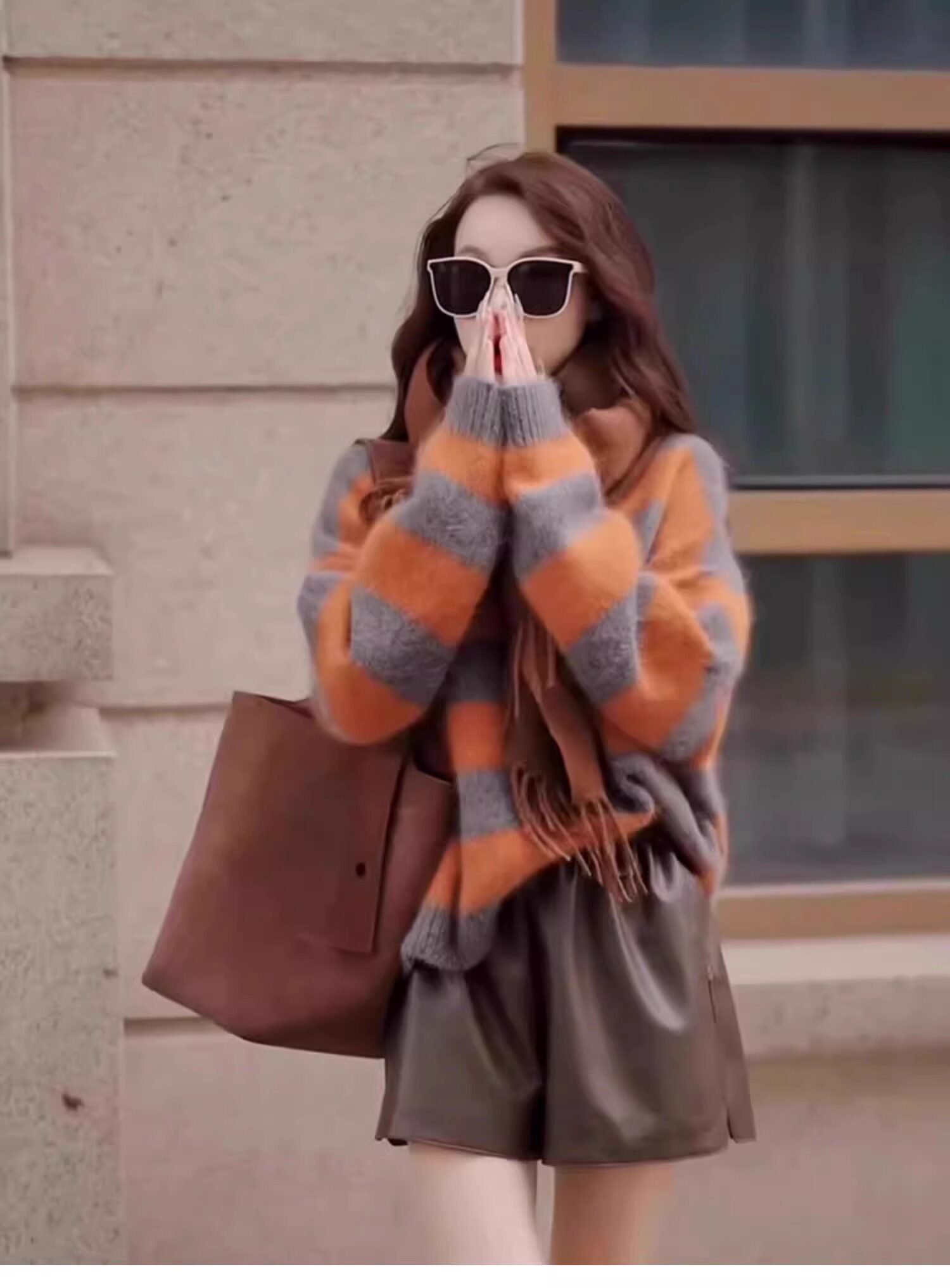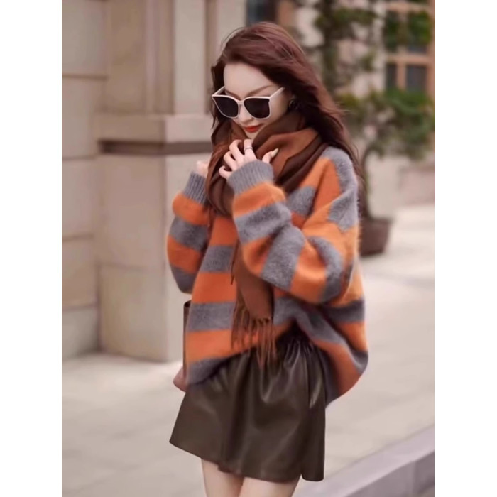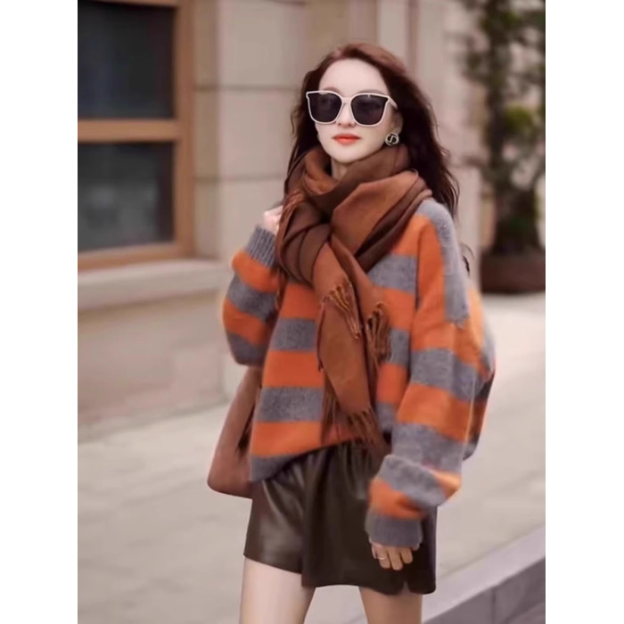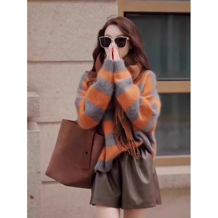 港味復古風撞色條紋毛衣女韓版慵懶風寬松潮流軟糯套頭針織衫上衣