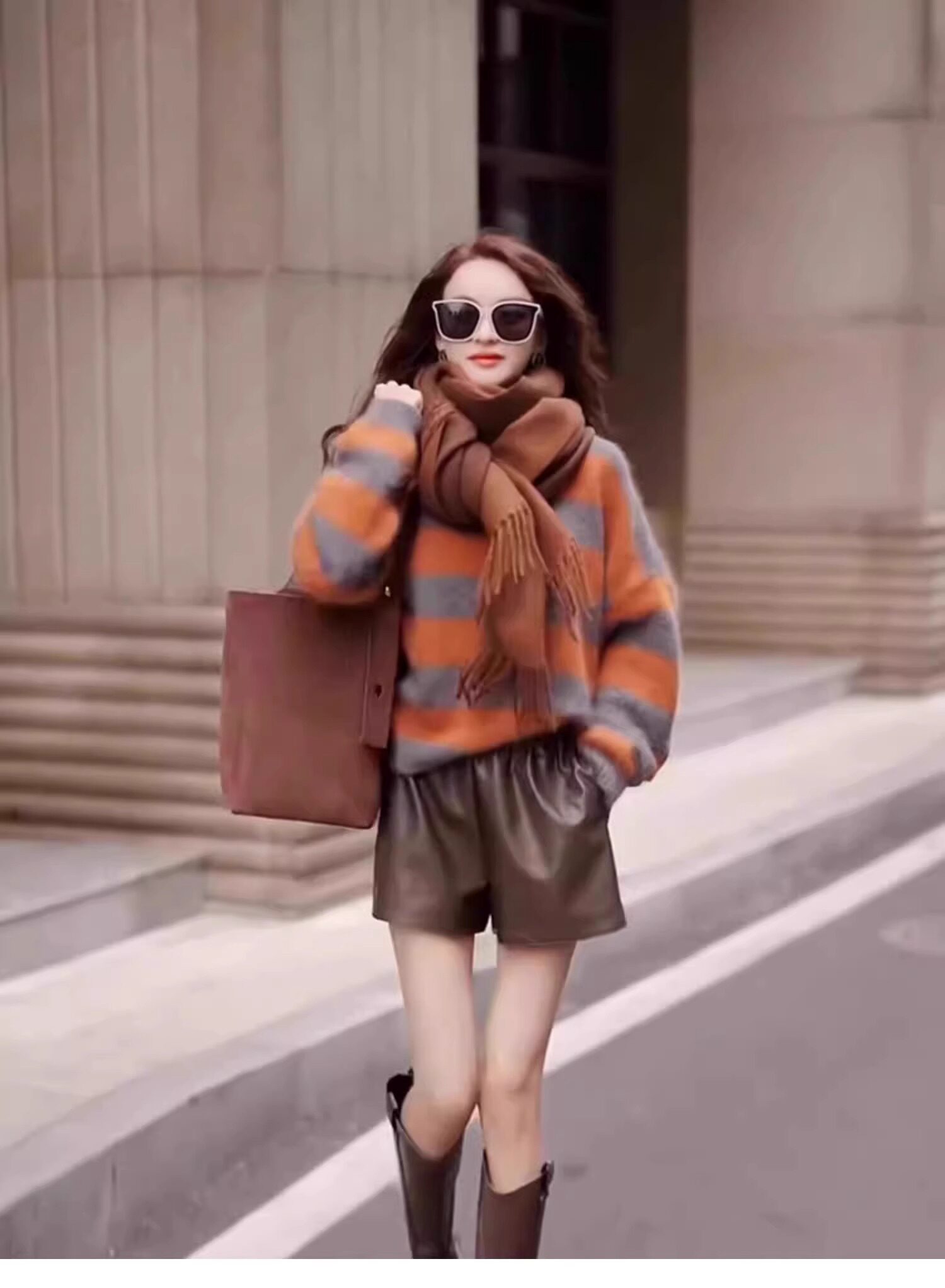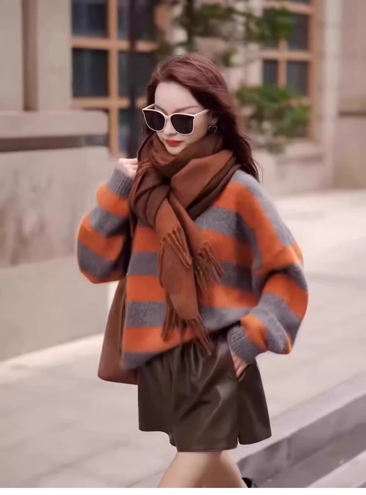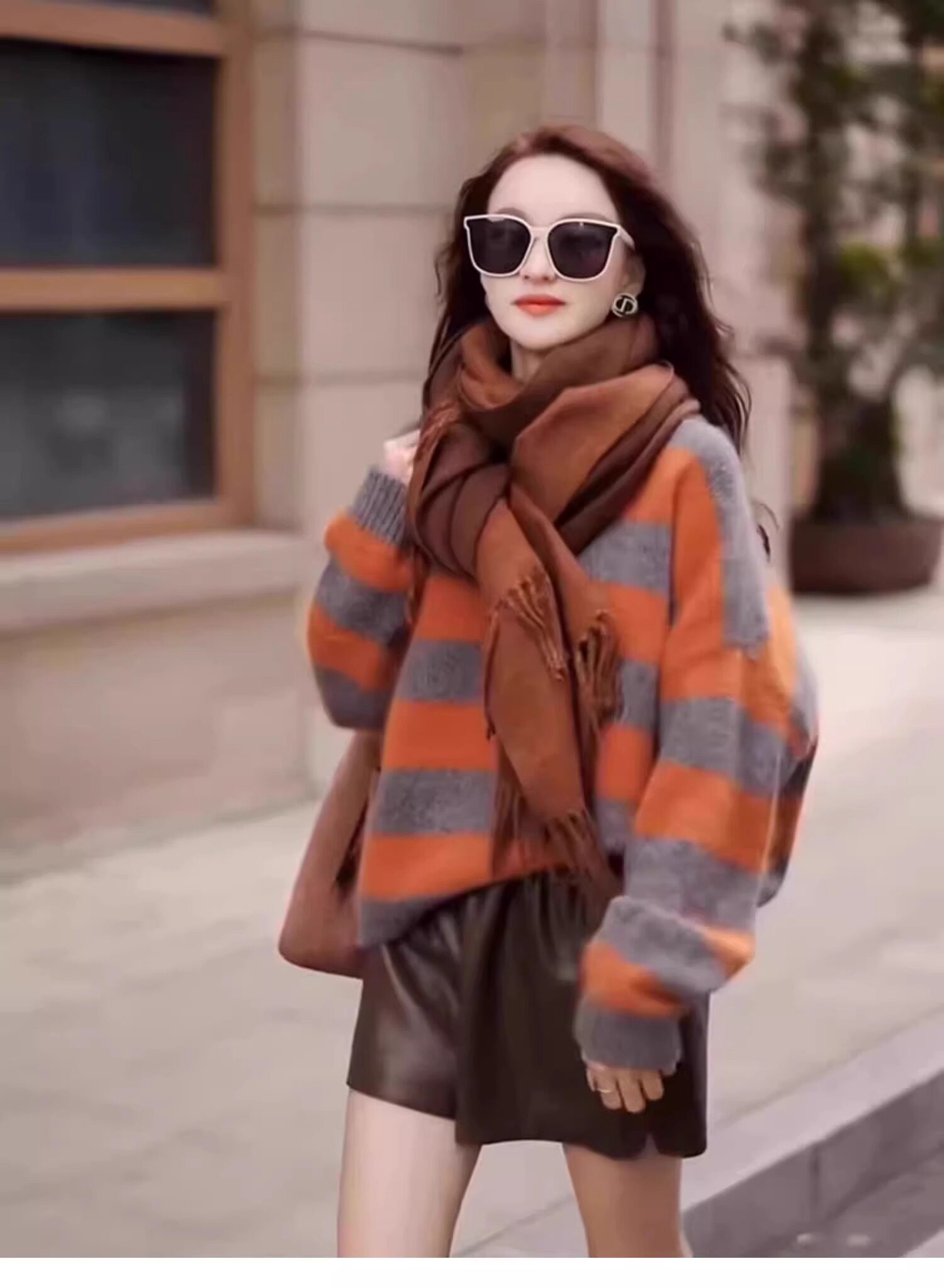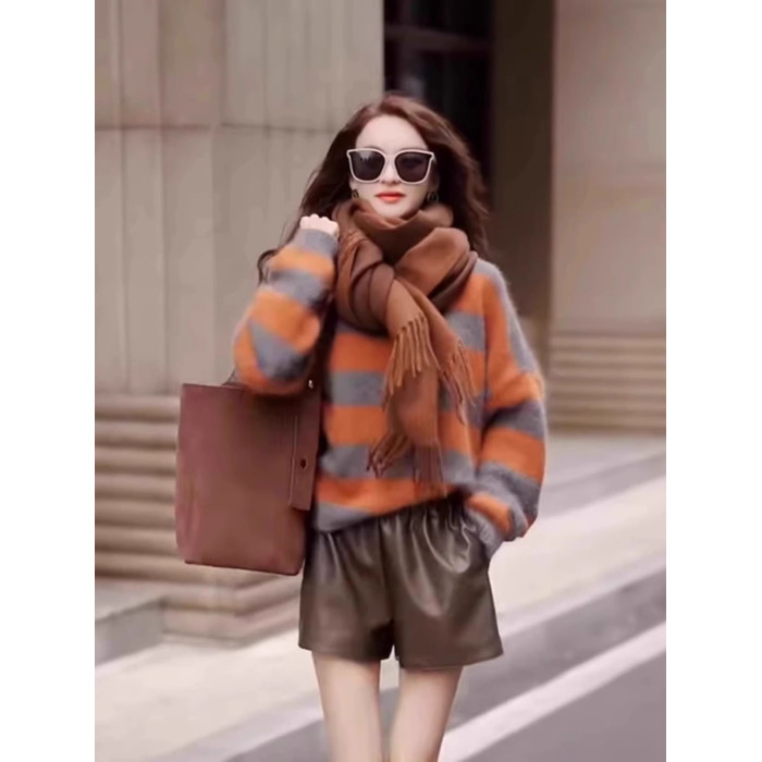 港味復古風撞色條紋毛衣女韓版慵懶風寬松潮流軟糯套頭針織衫上衣